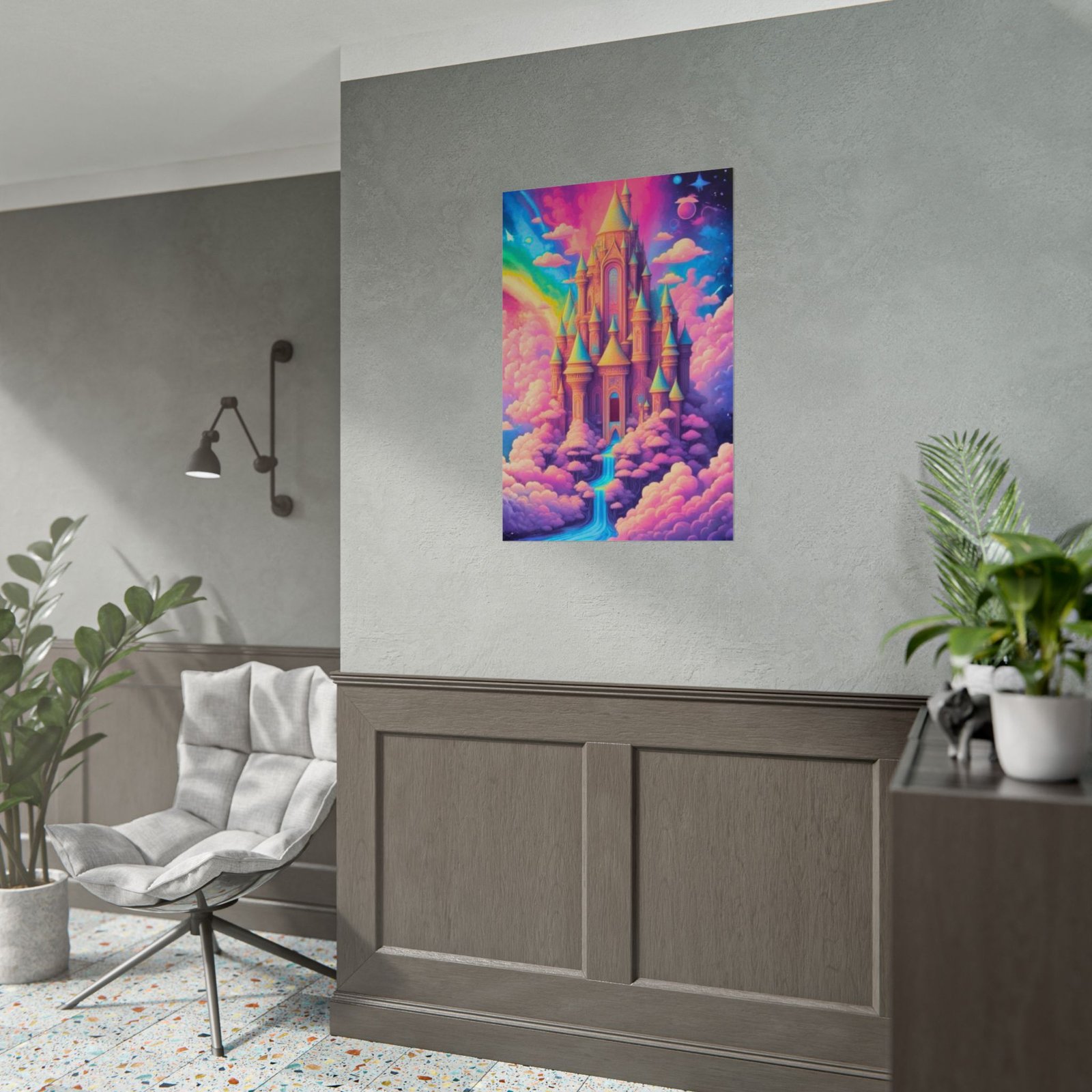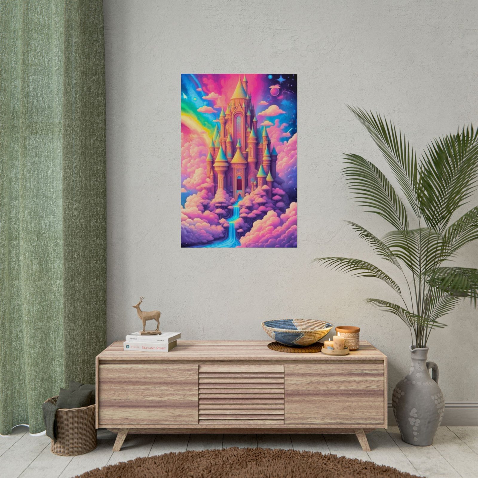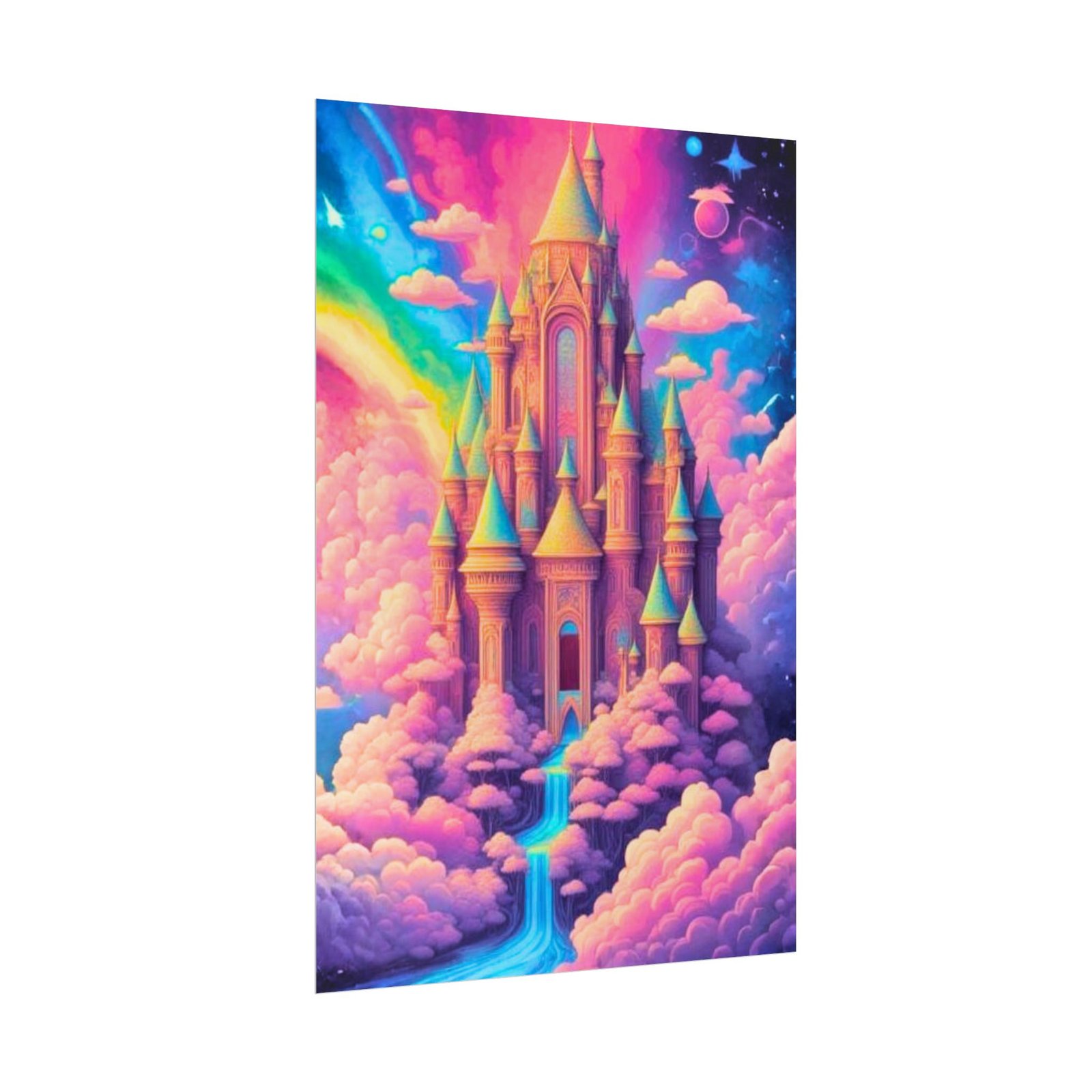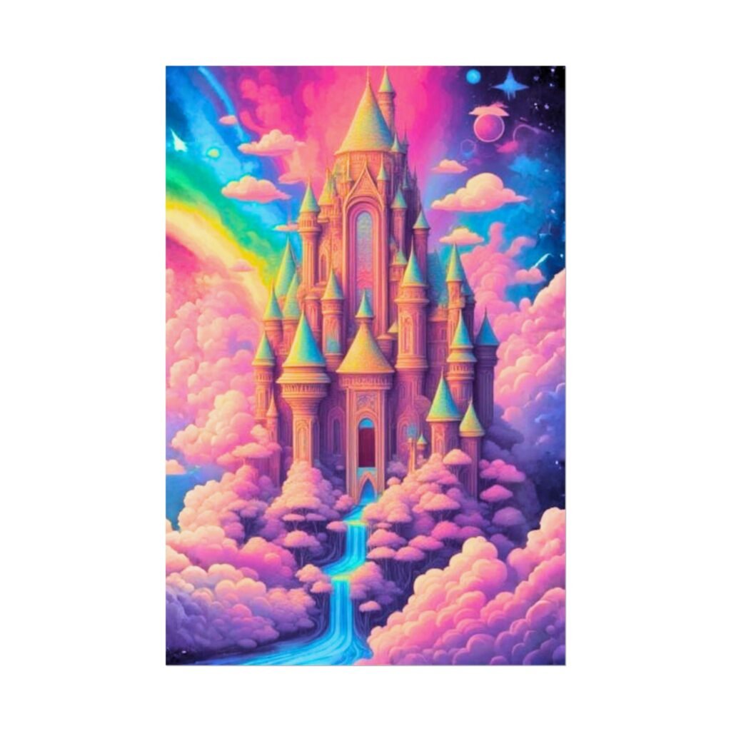 This rolled poster brings a dreamlike kingdom into your space with saturated, giclée color and painterly textures. A towering castle floats among cotton-candy clouds, with a shimmering rainbow, twinkling stars, and a gentle waterfall of light weaving through the scene. Pick semi-glossy for vivid, punchy color; or go matte for a softer, museum-style finish. Hung in a cozy reading nook, studio, or bedroom, it creates a quiet, imaginative refuge where colors soothe and details invite long looks.