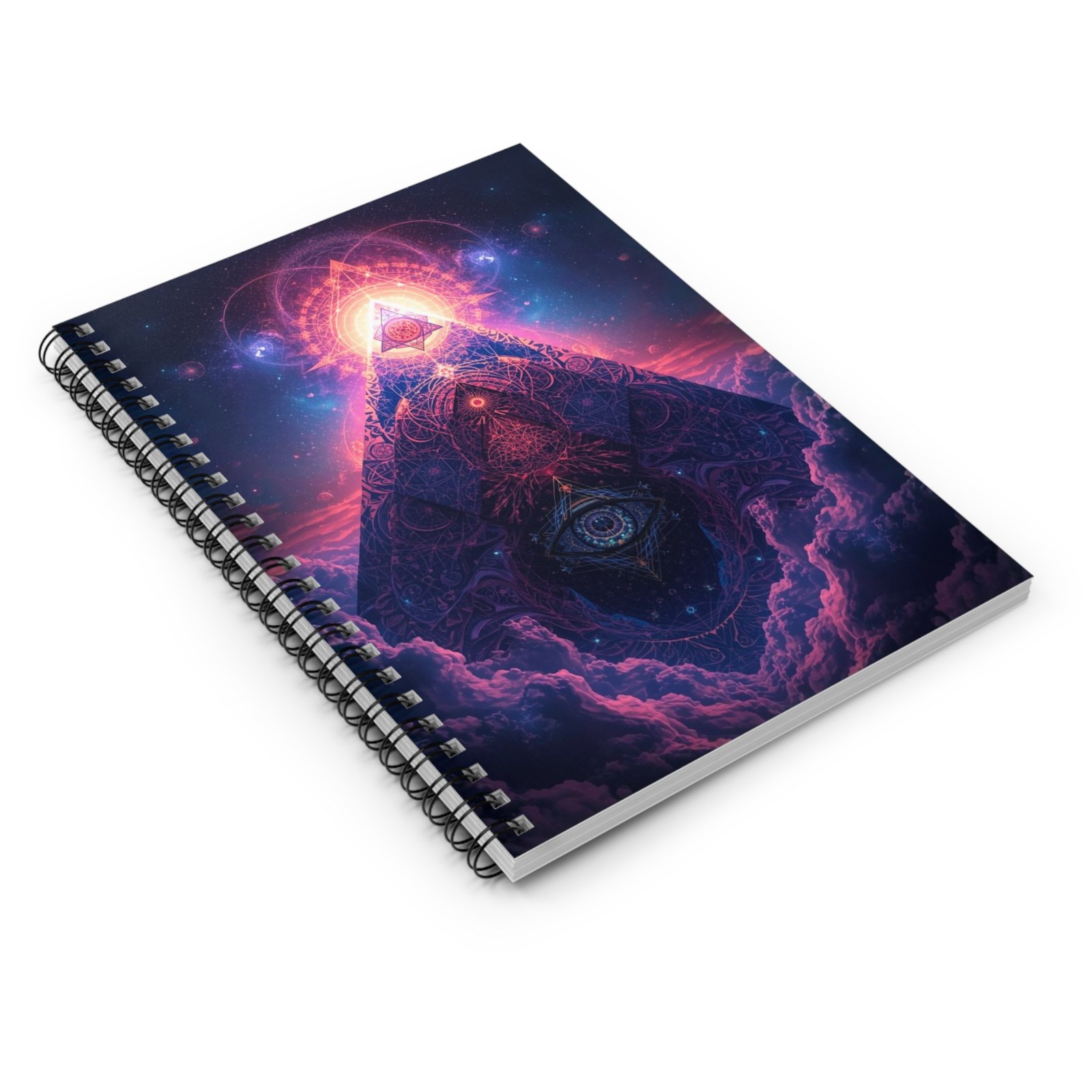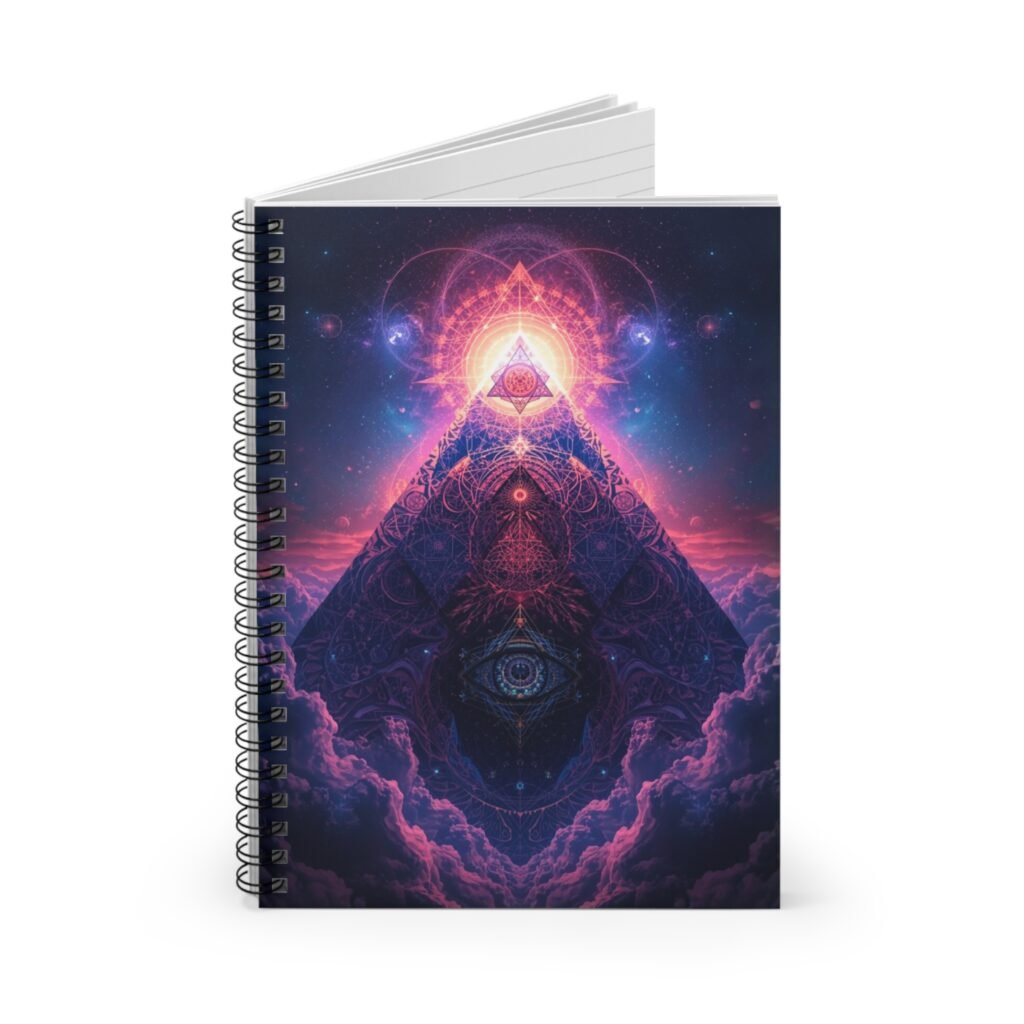 A spiral-bound ruled notebook with a vivid, cosmic pyramid design that invites quiet focus and imaginative exploration. The cover’s deep purples and radiant pinks feel like a window into a late-night reverie—notes, sketches, and reflections settle into its 118 lined pages with ease. The metal spiral lays flat for comfortable writing, and a tucked document pocket in the back keeps loose papers or inspirational clippings safe. Lightweight and pocketable at 6″ x 8″, this notebook slips into backpacks or bedside stacks and becomes a personal place to track dreams, plans, and small rituals.