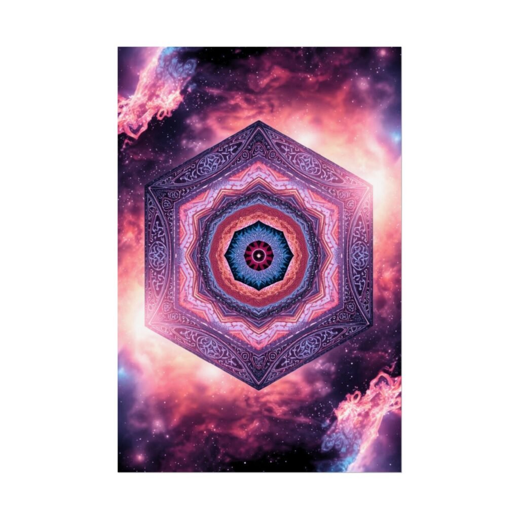 A rolled art poster that brings a cosmic mandala into any room. Vivid magentas, deep indigos, and glowing highlights form a kaleidoscopic hexagon at the center of a nebula-like field — a design that feels meditative and expansive at once. Printed using archival giclée methods, the image retains intense color and clarity whether you choose the satin semi-gloss, or a subdued matte finish. Sent rolled for safe transport, this poster arrives ready for framing or mounting and becomes a quiet focal point in a studio, bedroom, or creative workspace.