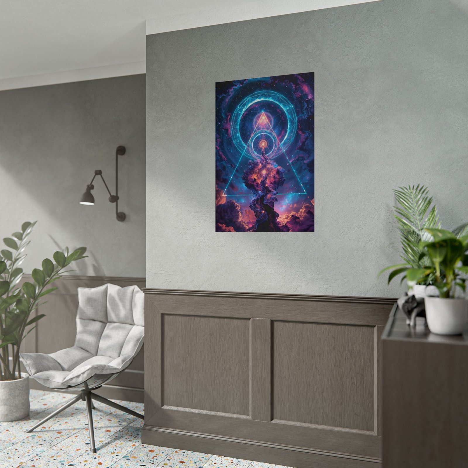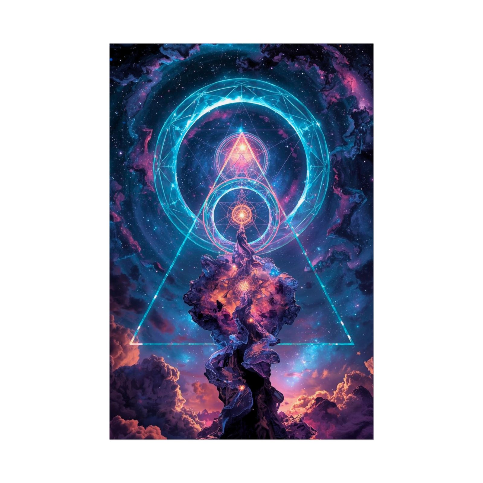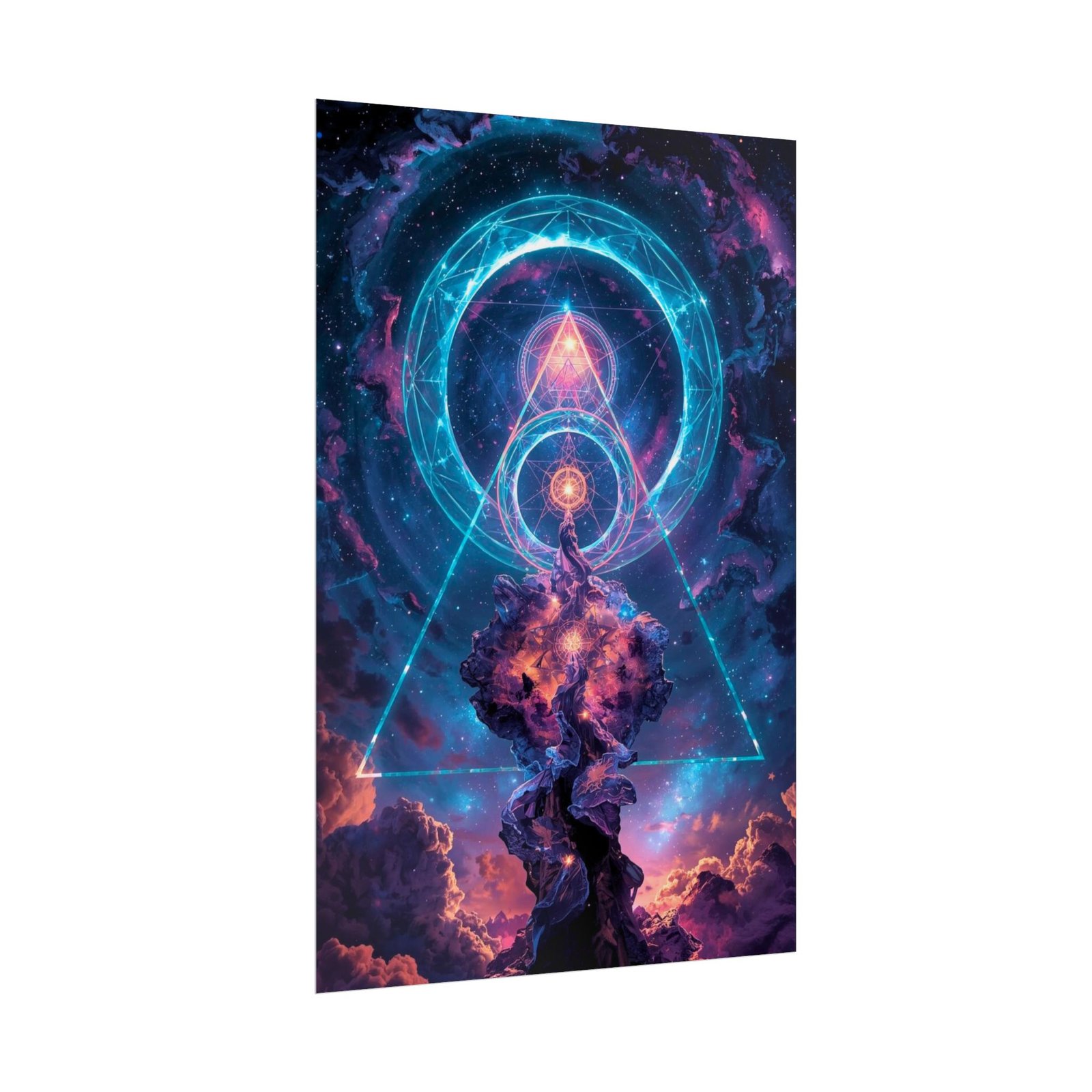 Poster art that pulls you inward — a cosmic, neon-lit vision of spirals, geometric sigils, and a cathedral of swirling clouds. It reads like a portal: electric cyan rings hover above a purple-orange nebula, while a glowing triangle frames the scene. Hang it where you settle to think, meditate, or sketch; the image invites quiet awe and long looks. Printed with archival giclée methods on your choice of satin semi-gloss, or soft matte paper, the colors stay vivid and the surface complements whatever mood you want — glossy for punch, matte for subtlety, or textured for a handcrafted gallery feel.