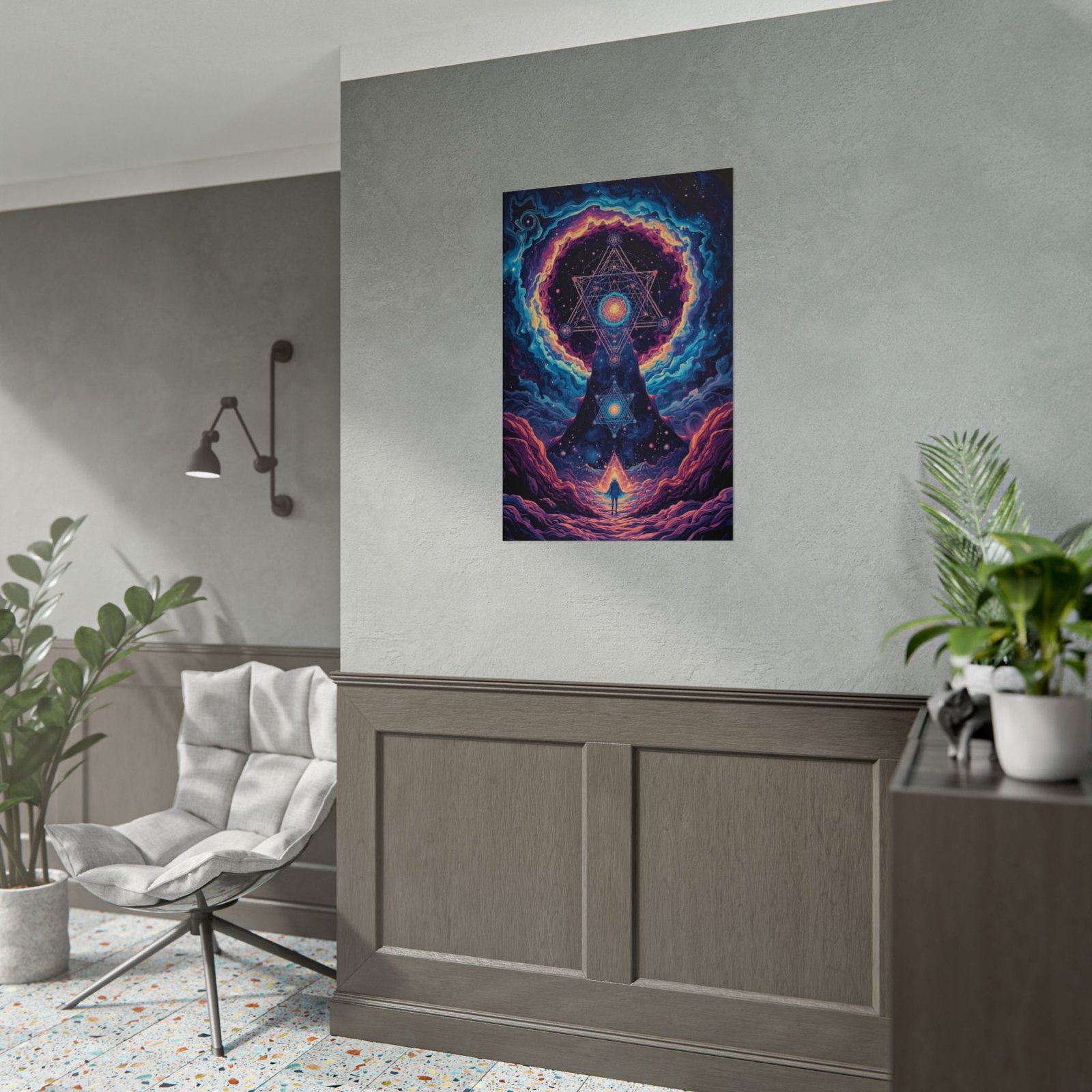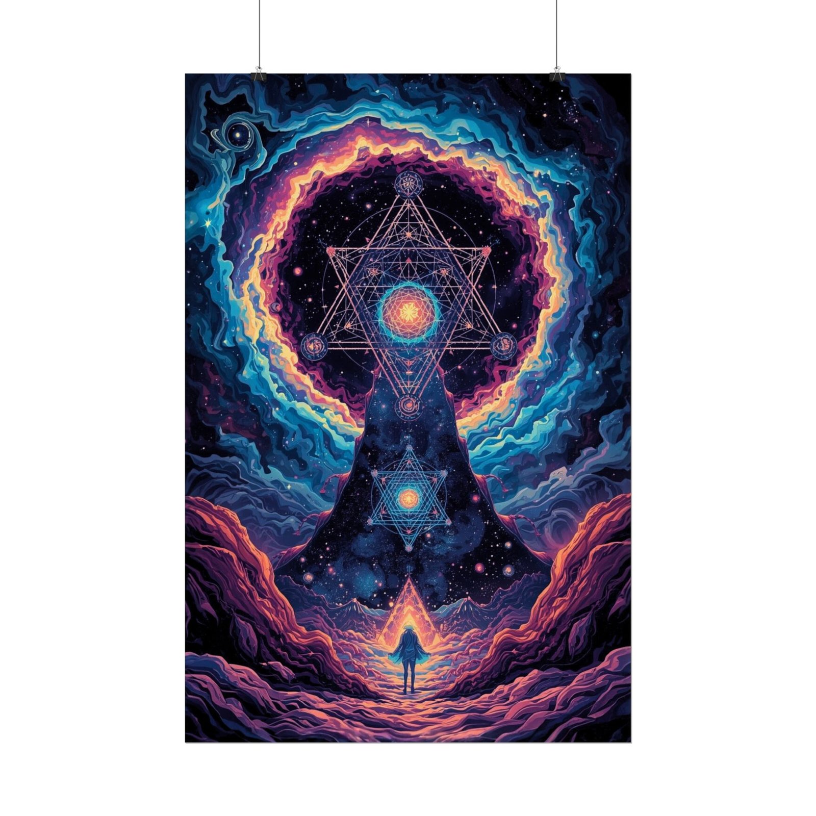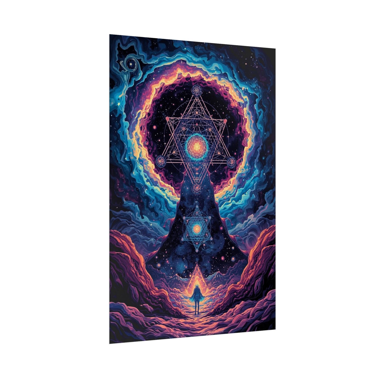 This rolled poster brings a vivid, otherworldly scene to your walls — a lone figure walking toward a radiant geometric gateway set amid cosmic clouds and electric color. The print has intense, saturated hues rendered with giclée quality so the blues, magentas, and golds hold their brightness over time. Choose from a semi-glossy photographic paper for sharp, luminous color; or a matte option when you want reduced glare and an art-studio look. It ships rolled so the paper stays protected until you’re ready to frame or mount it.