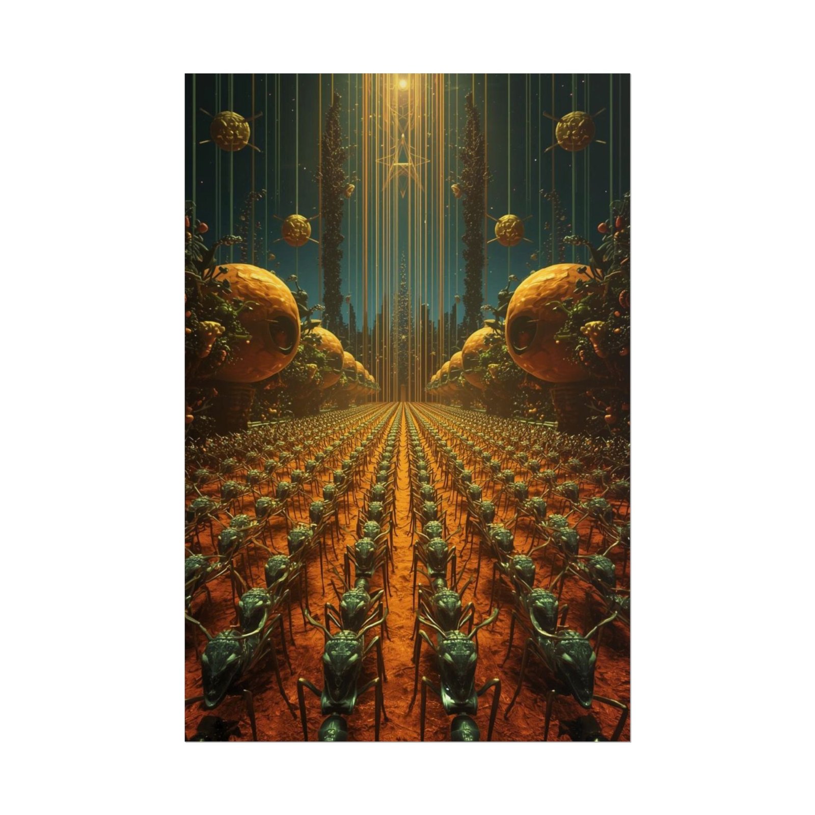 This rolled poster brings a cinematic, otherworldly landscape to your walls — a procession of armored figures beneath glowing orbs and towering light shafts. Printed with vivid giclée inks on your choice of fine art, semi-glossy, or matte paper, the image keeps its rich colors and crisp detail over time. Choose fine art for a textured, archival feel that echoes traditional etching or watercolor; pick semi-glossy for bright, saturated tones with a satin sheen; or go matte for a softer, low-reflective presentation that’s great in layered gallery arrangements. Available in multiple sizes and orientations, the poster ships rolled so you can frame it, pin it, or hang it with minimalist clips. It’s made from quality stock sourced from the USA and Japan, built to showcase bold, imaginative artwork and hold its presence in a curated space.
