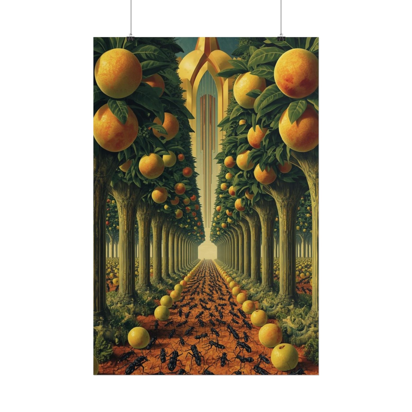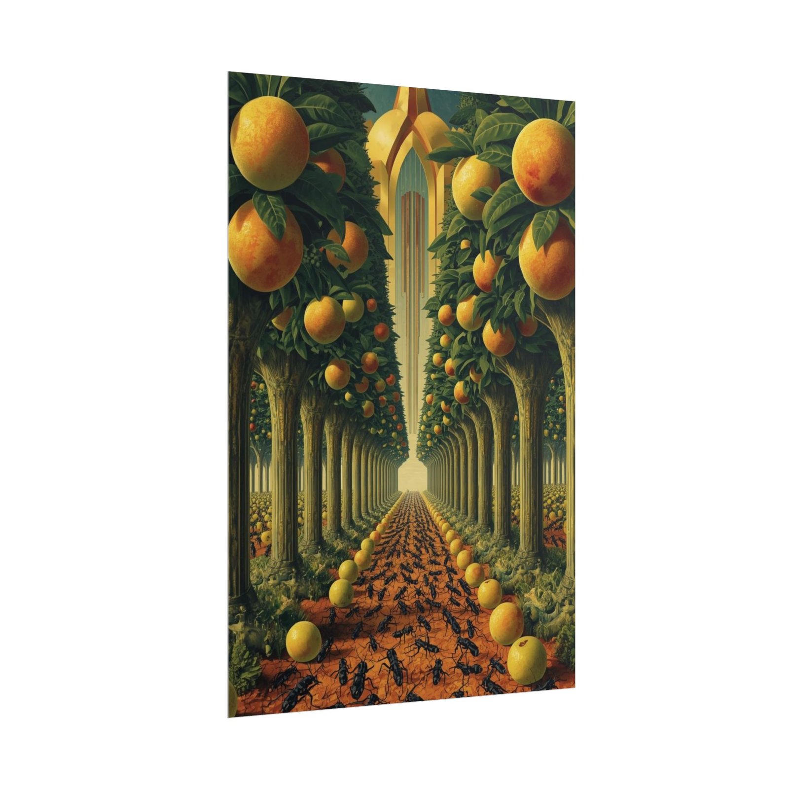 Walk down an endless orchard where ripe oranges glow like tiny suns — this rolled art print brings that quiet, uncanny warmth into your room. The vertical composition pulls your eye toward a distant light, framed by meticulously detailed trees and plush, textured fruit. Printed with archival-quality inks, the colors stay vibrant even with regular sun exposure, while your choice of fine art, semi-glossy, or matte paper changes the mood: textured and painterly, crisp and luminous, or soft and understated. Rolled for safe shipping, this piece arrives ready to be mounted or framed, adding a contemplative, storybook atmosphere to a living room wall, studio, or hallway.