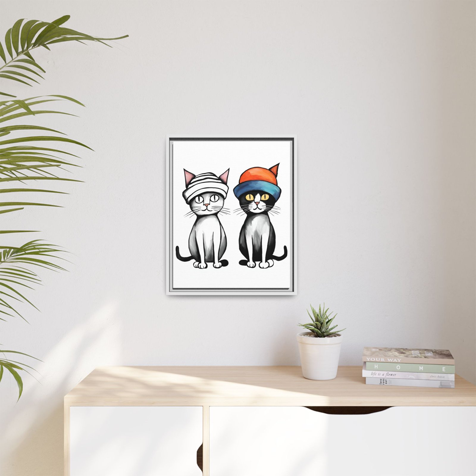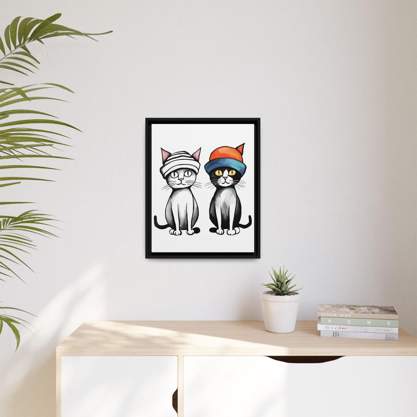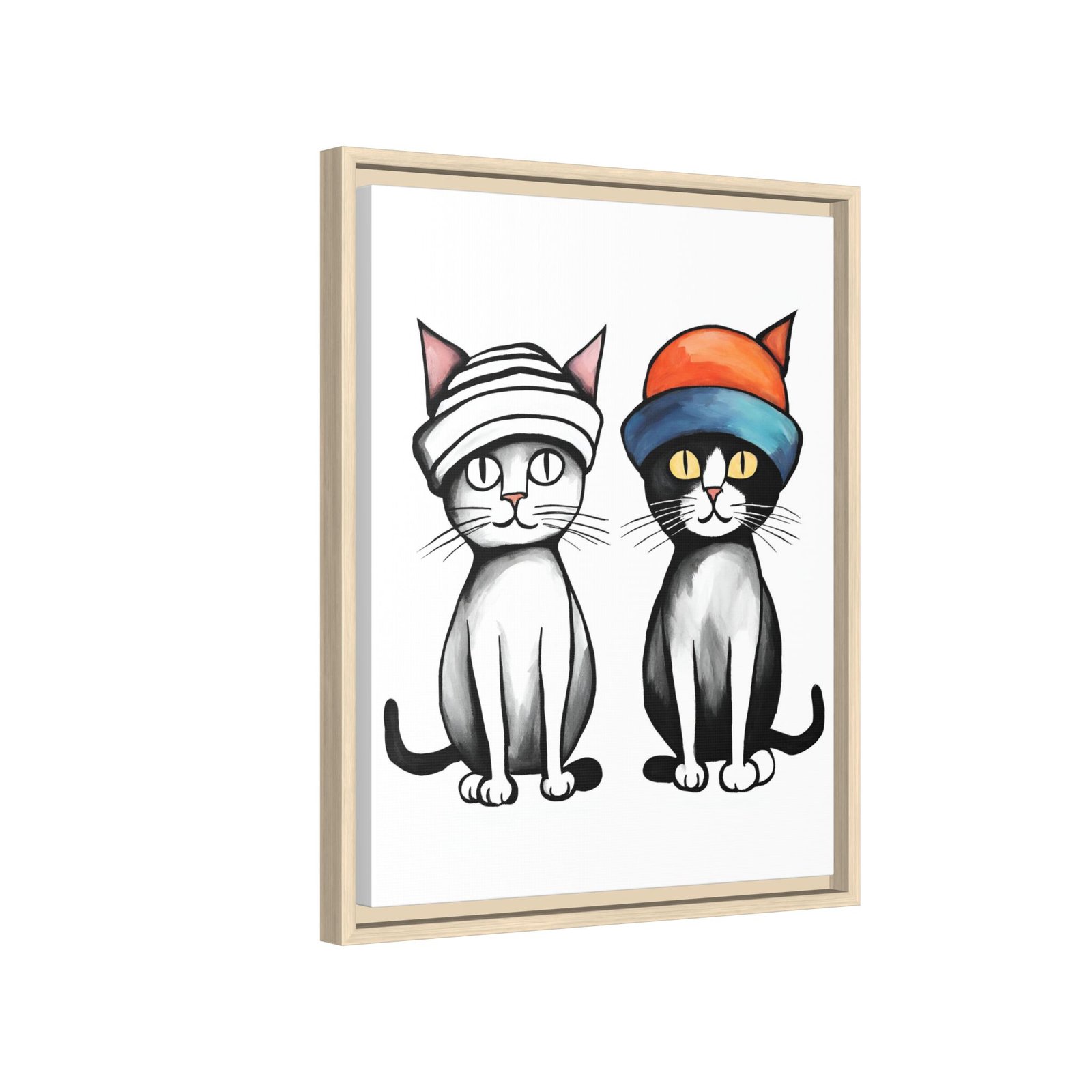 Two whimsical cats sit side by side in soft, hand-drawn lines and playful color — one bright-eyed tuxedo with a blue-and-orange beanie, the other a gentle tabby wearing a striped hat. Printed on matte canvas with vivid, fade-resistant inks and stretched over a slim pine frame, this framed canvas brings a quiet, cozy charm to walls that love personality. It reads like a small story: morning light, warm mugs, and two companions who watch the world with curious calm. Hang it in a reading nook, a hallway gallery, or above a bedroom dresser to add subtle humor and warmth that feels collected, not contrived.