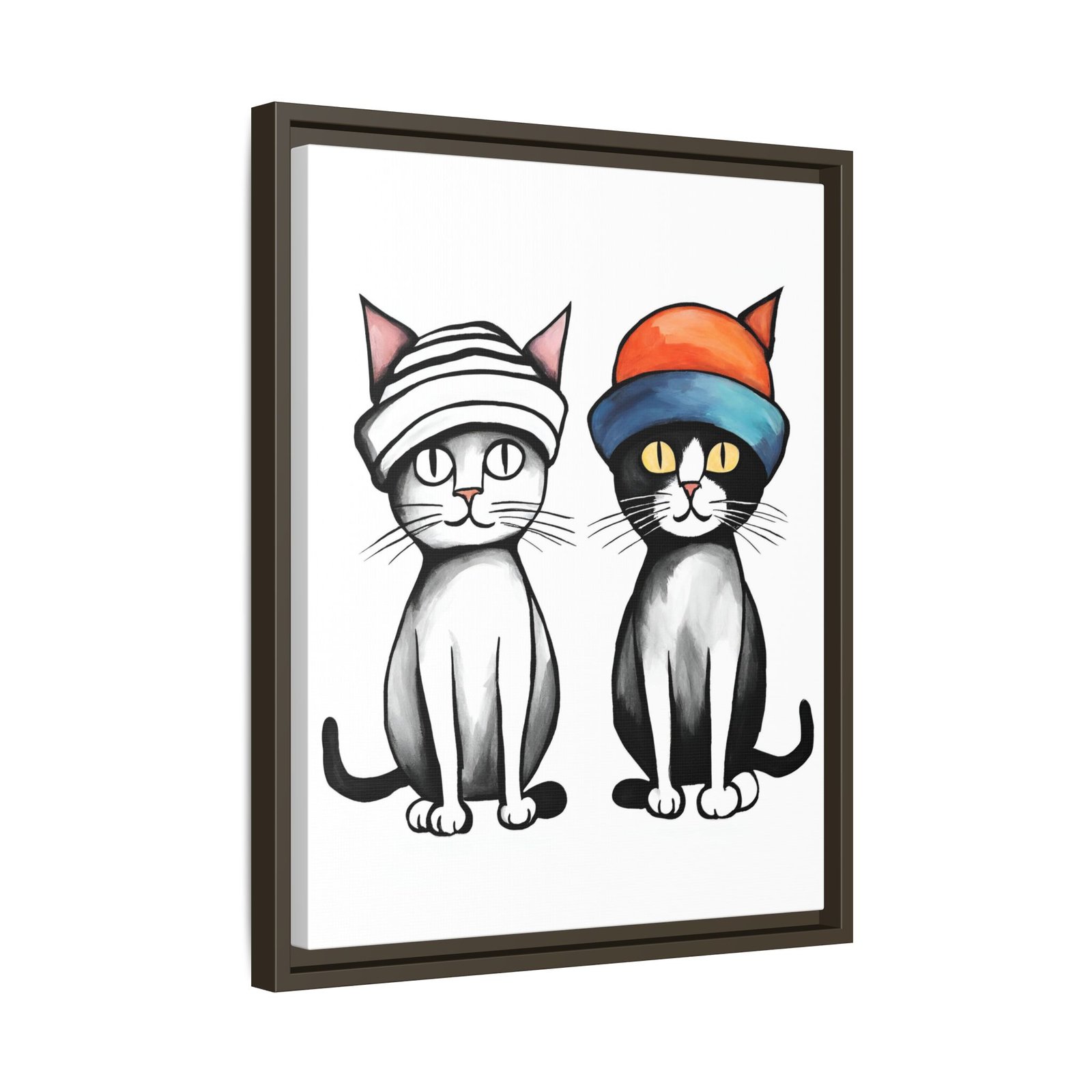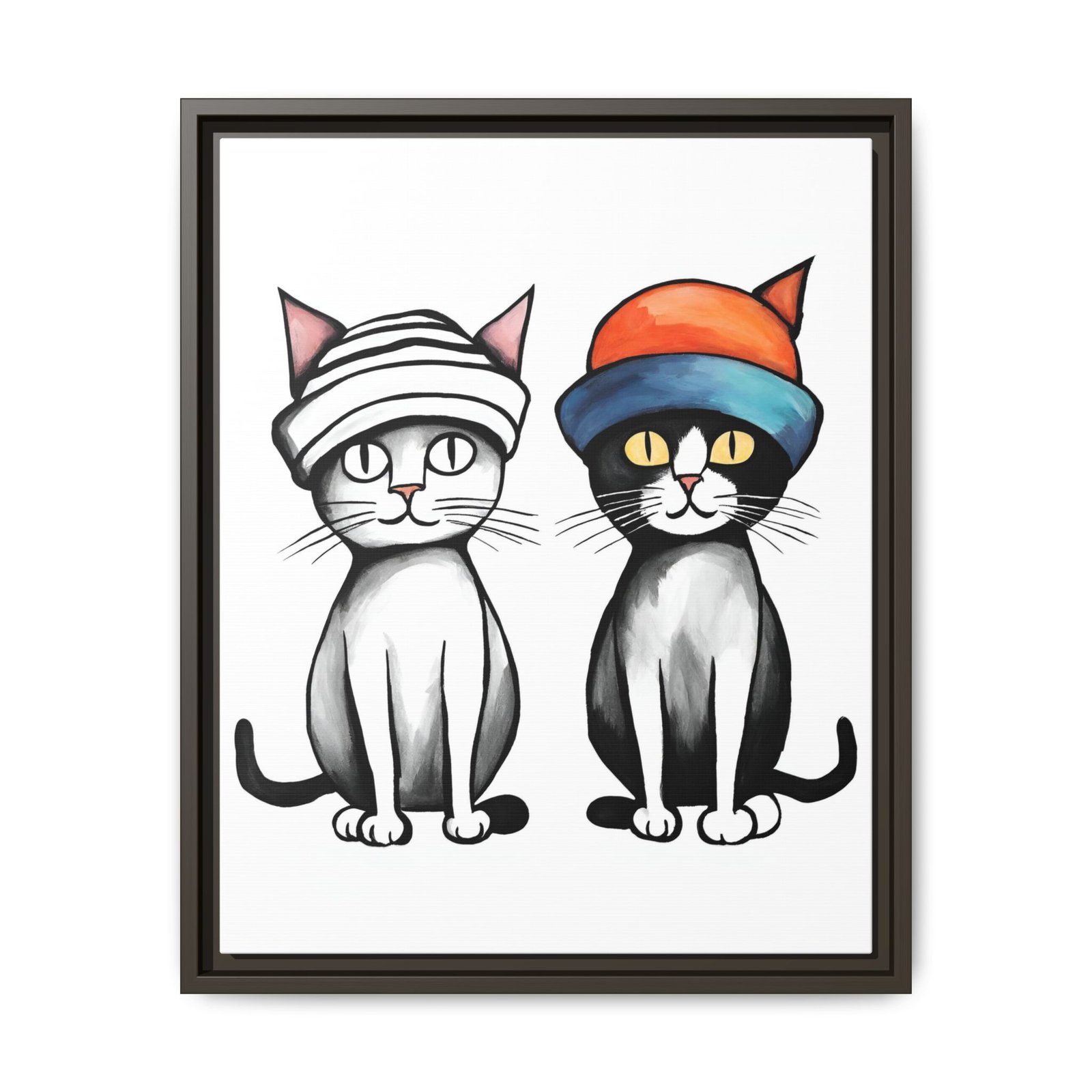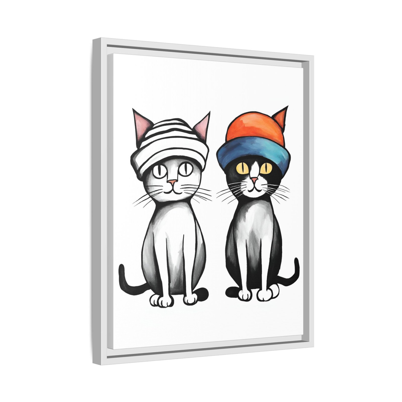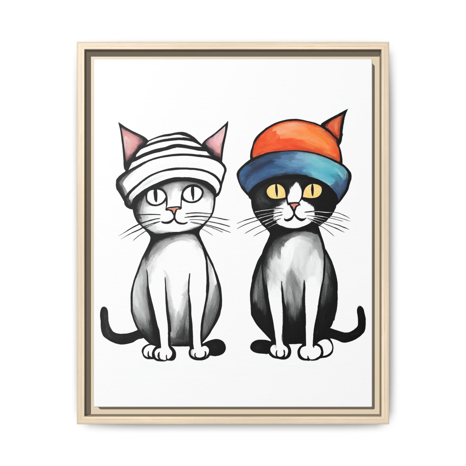 Two whimsical cats sit side by side in soft, hand-drawn lines and playful color — one bright-eyed tuxedo with a blue-and-orange beanie, the other a gentle tabby wearing a striped hat. Printed on matte canvas with vivid, fade-resistant inks and stretched over a slim pine frame, this framed canvas brings a quiet, cozy charm to walls that love personality. It reads like a small story: morning light, warm mugs, and two companions who watch the world with curious calm. Hang it in a reading nook, a hallway gallery, or above a bedroom dresser to add subtle humor and warmth that feels collected, not contrived.