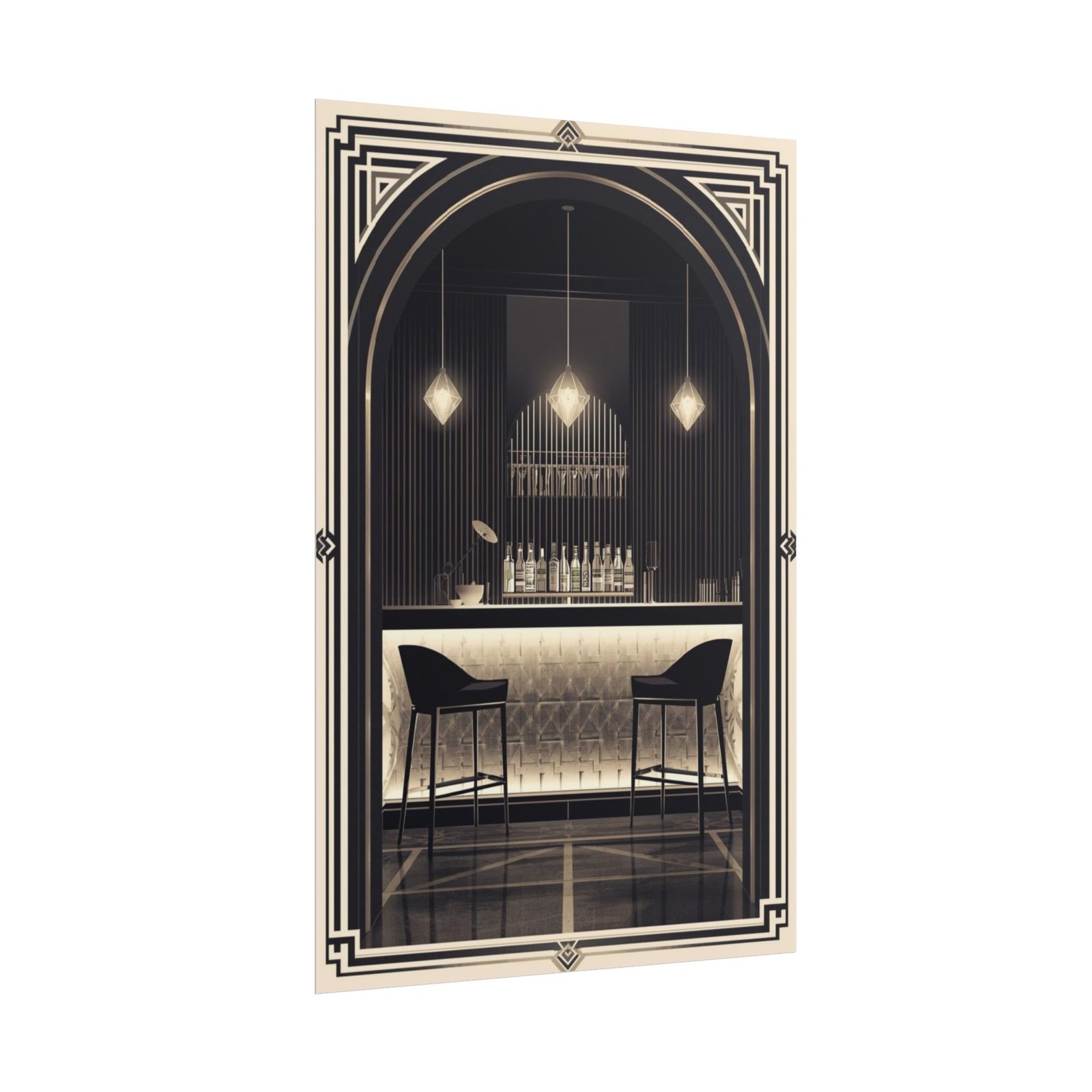 A rolled art poster that brings a quiet, vintage-nightclub mood to your walls. Deep blacks and warm cream tones form an elegant arch framing a softly lit bar scene — low pendant lights, high stools, and a mirrored back that catches the glow. The design reads like a scene from a late-night film: intimate, refined, and a little mysterious. Printed on museum-quality papers with rich giclée inks, the image keeps its depth and contrast over time. Choose a textured fine art sheet for painterly presence, a satin semi-gloss for crisp photographic detail, or a muted matte for a softer look. Ships rolled so you can frame or mount it the way that fits your space and taste.