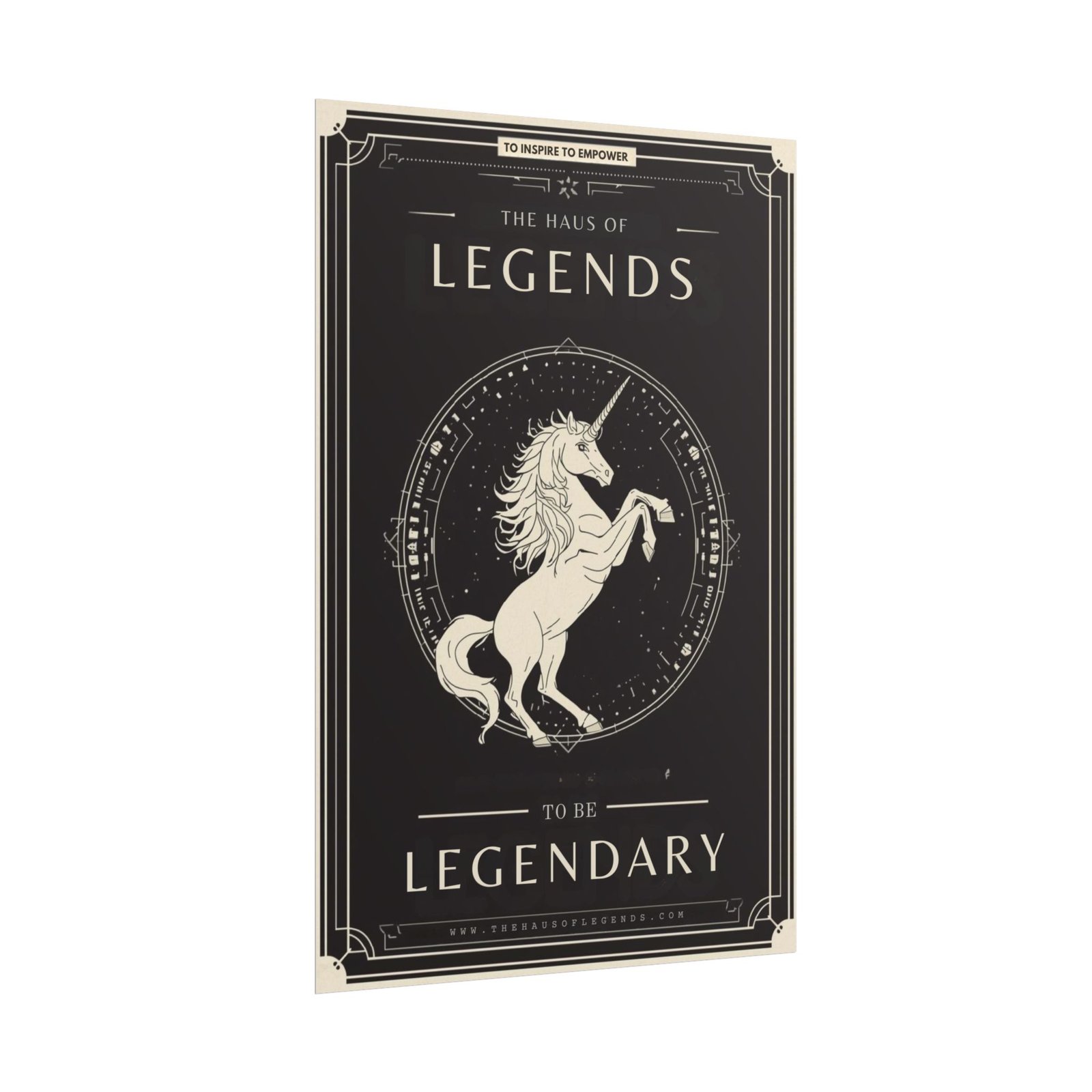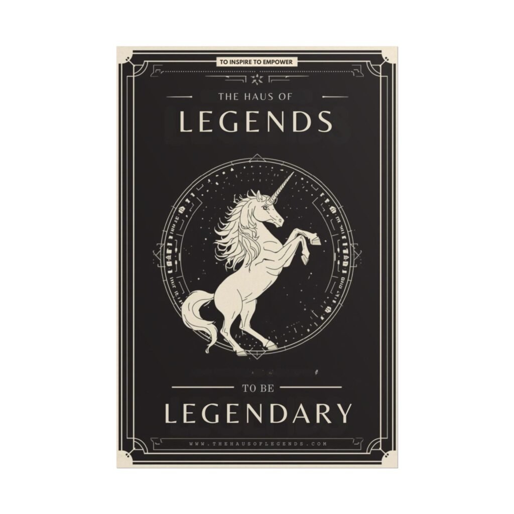A dramatic rolled art poster that brings vintage-inspired mystique to any wall. A rearing unicorn rendered in ivory tones stands at the center of a star-speckled seal, framed by ornate deco borders and bold lettering that reads “Legends” and “To Be Legendary.” The dark, matte background contrasts with crisp, giclée color reproduction so the illustration keeps its depth and detail over time. Choose fine art paper for a textured, gallery feel; semi-gloss for vivid photographic clarity; or matte for a softer, low-reflective finish. Hung in a study, game room, or creative studio, this poster reads like a declaration — quietly confident, a little mythical, and meant to inspire.