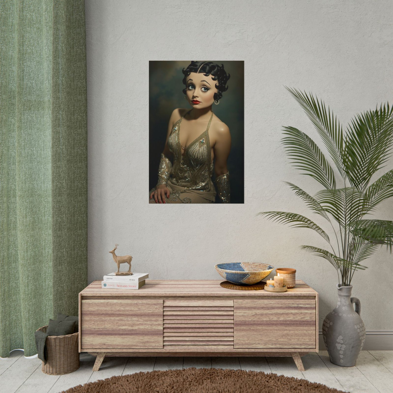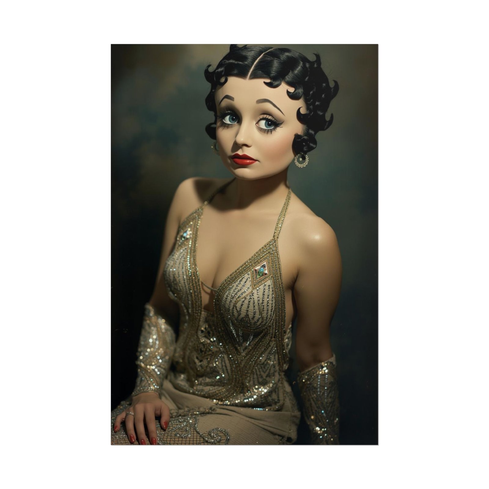 This rolled poster captures vintage glamour with a modern, slightly whimsical twist. Printed with vivid giclée inks on your choice of fine art, semi-glossy, or matte paper, the portrait’s luminous skin tones and detailed beading hold depth and clarity. Hung in a studio, dressing room, or cozy living area, the image brings a quiet drama — soft shadows, expressive eyes, and sequined highlights that catch the light just so. Choose orientation and size to suit a gallery wall or a single statement spot. The archival papers preserve color and texture, so the mood lasts.
