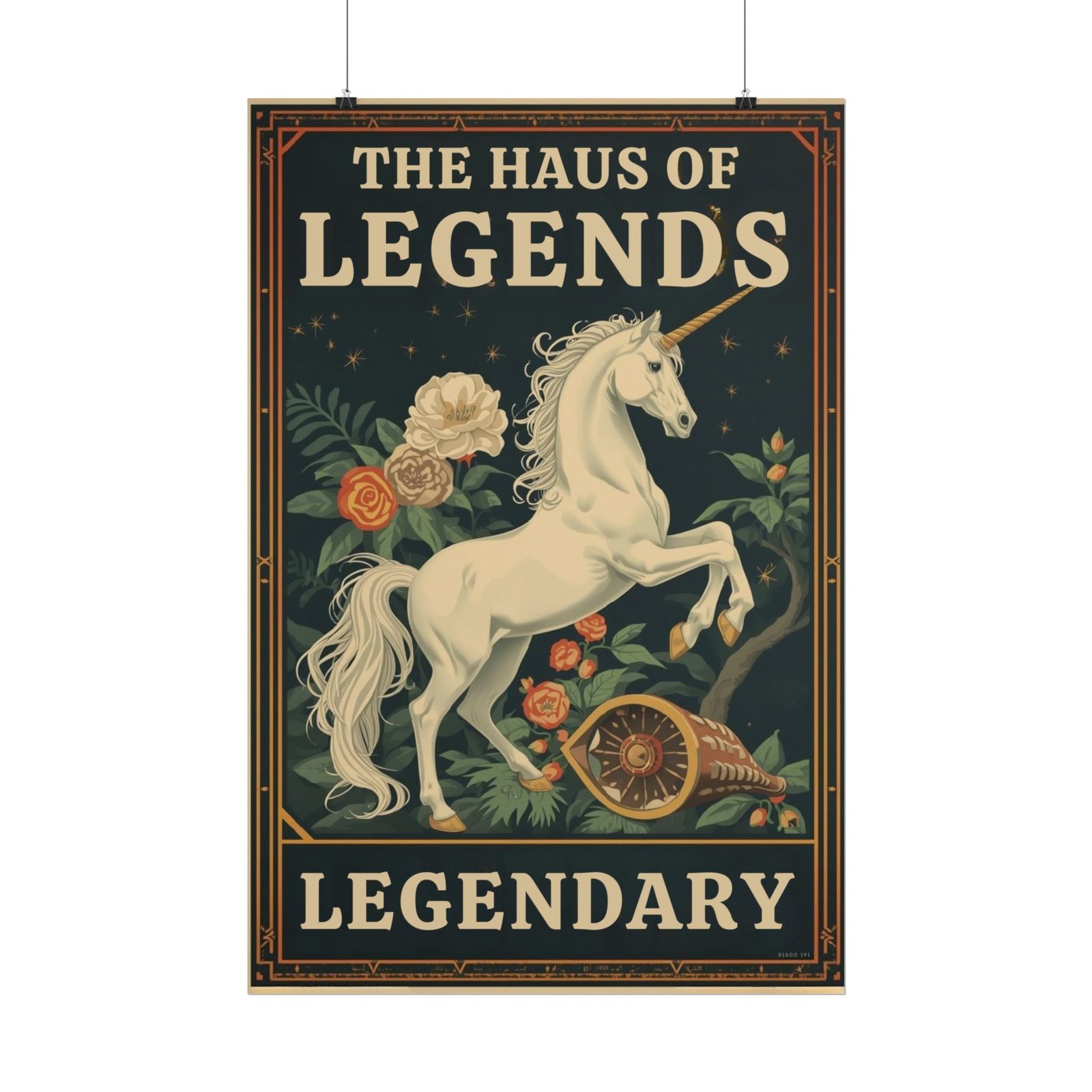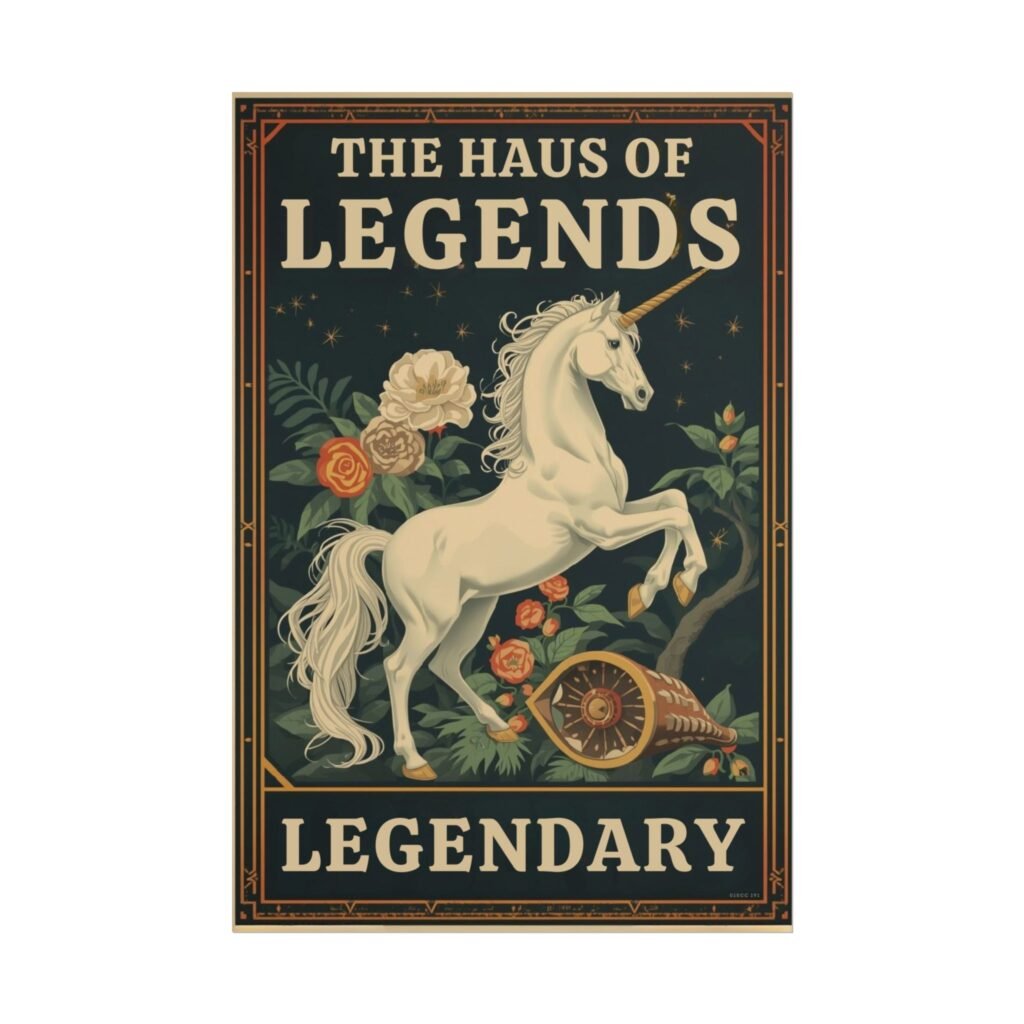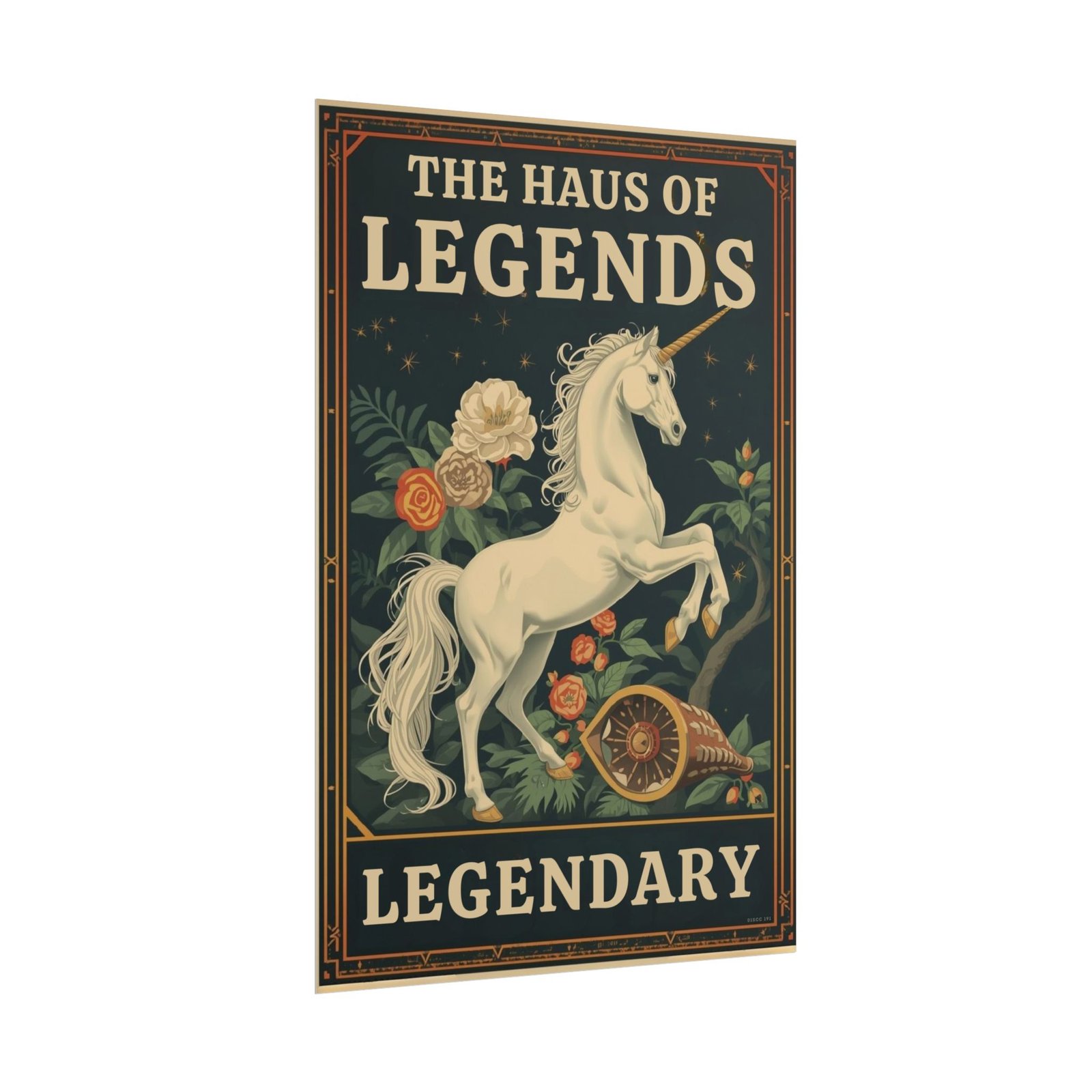 Bring a touch of myth and vintage charm to your space with this rolled poster print. A spirited white unicorn rears amid lush botanicals and antique accents, framed in art-deco borders with bold lettering that reads like an old-world proclamation. The muted, painterly palette and textured paper options create a timeless, gallery-quality look — whether you want a textured fine art finish that feels like watercolor paper, a satin semi-gloss for crisp color, or a soft matte for subdued, atmospheric tones. Hang it in a reading nook, studio, or entryway to spark curiosity and conversation. This piece feels at home where storytelling, curiosity, and a love of the fantastical meet everyday life.