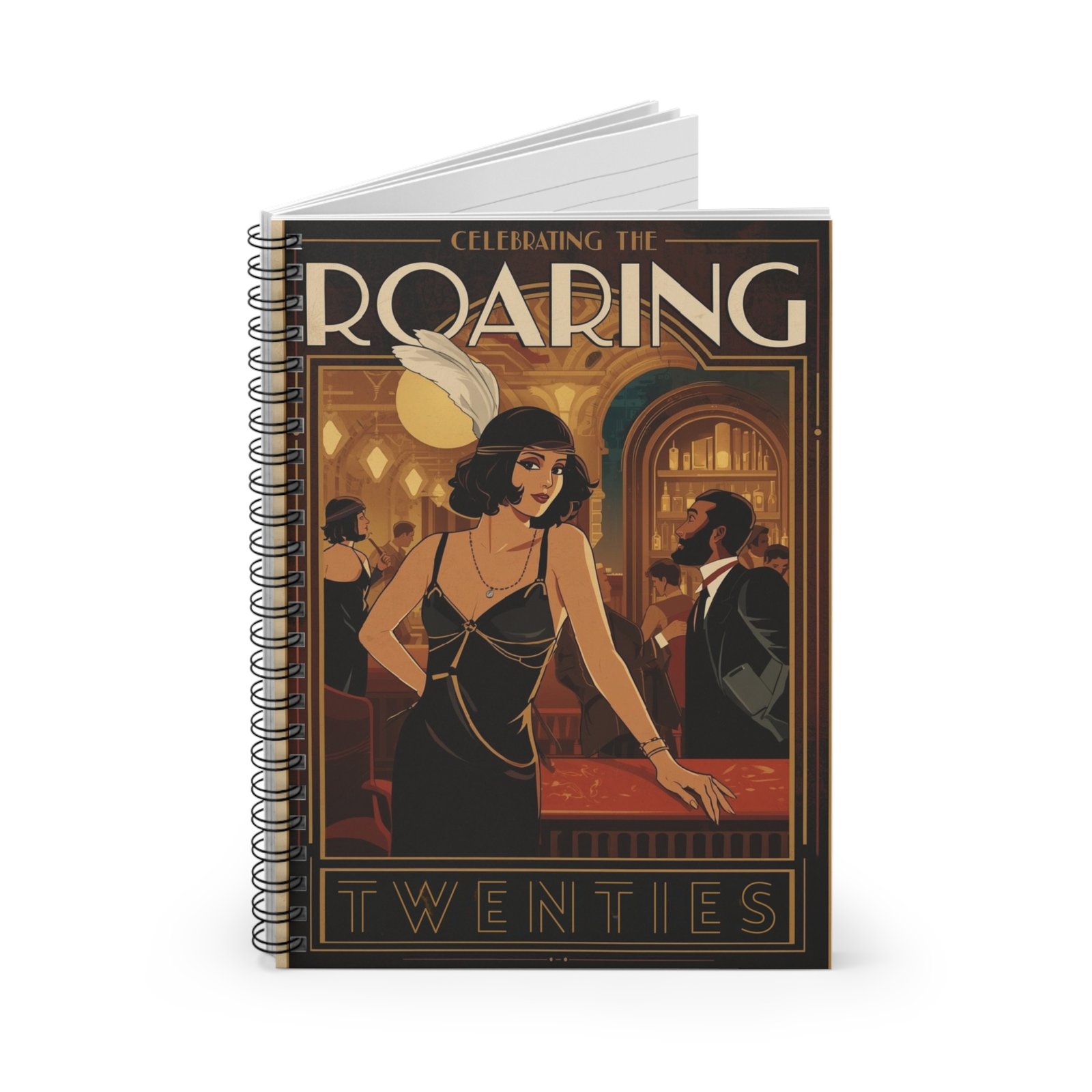 Step into a smoky jazz lounge where flapper flair meets thoughtful note-taking. This ruled spiral notebook captures the glamour of the Roaring Twenties on its front cover — a sleek, art-deco illustration that invites you to write with intention. The smooth 90gsm lined pages take pen or pencil beautifully, while the metal spiral lets the book lie flat or fold back for quick sketches, lists, or journal entries. A hidden document pocket in the back keeps receipts, ticket stubs, or loose thoughts safe. Compact and tactile at 6″ x 8″, it slips into bags for city outings, classes, or late-night creative bursts.