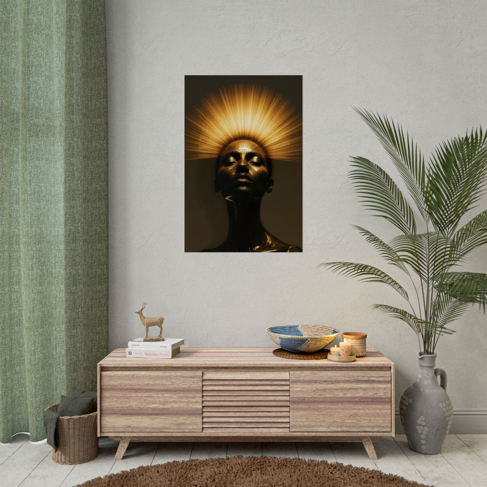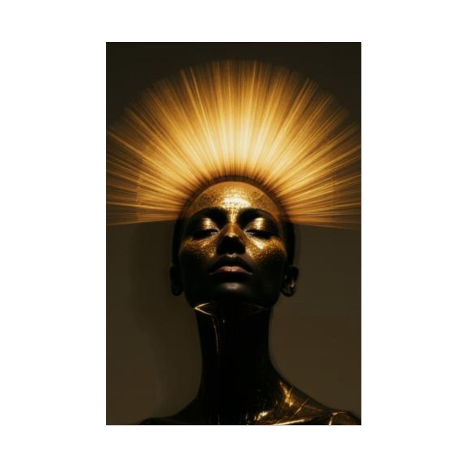 This rolled poster brings a powerful, gallery-ready presence into your space. Printed with rich giclée inks on your choice of fine art, matte, or semi-glossy paper, the image holds deep blacks and radiant gold highlights that glow against a dark background. Vertical compositions emphasize the luminous halo above the figure’s head, creating a meditative, reverent atmosphere. Choose thicker fine art paper for texture and archival longevity, or semi-glossy for vivid color fidelity—each size and orientation keeps the artwork striking whether framed or displayed loose. It’s for someone who curates with intention: collectors, modern interiors, and anyone who wants a statement piece that reads like contemporary portraiture and quiet ritual.