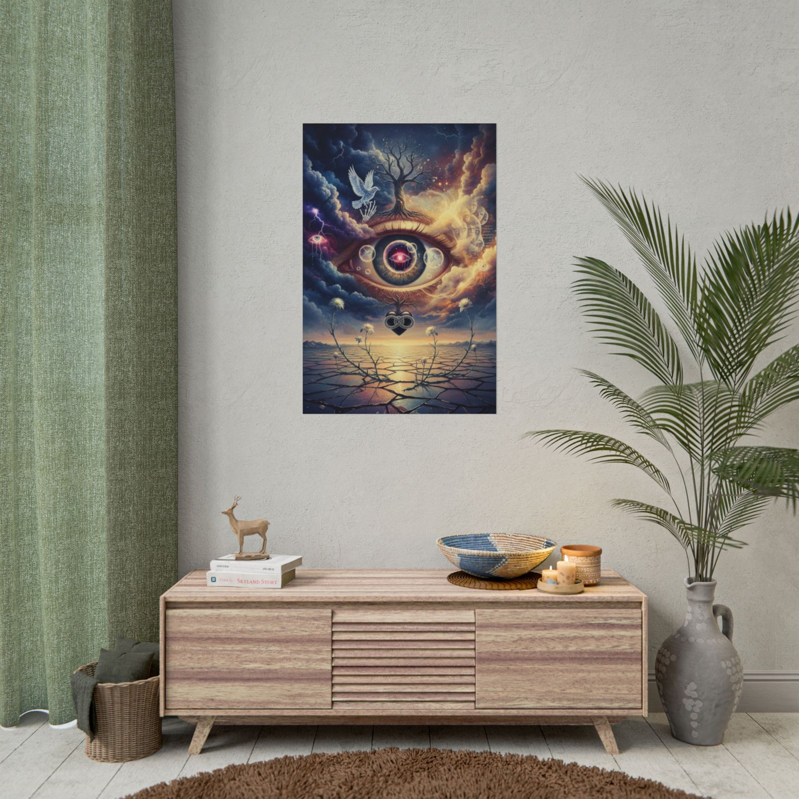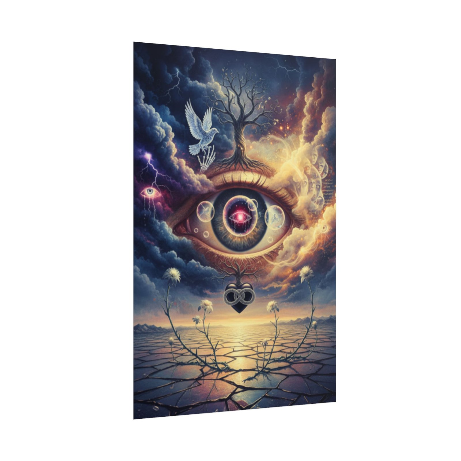 This rolled poster brings a surreal, dreamlike landscape to your wall — a single all-seeing eye framed by swirling clouds, a lone tree, and a glowing horizon. The scene feels like a memory or a vision: quiet, uncanny, and full of layered symbolism. Printed with vivid giclée inks on your choice of fine art, semi-glossy, or matte paper, the image holds deep color and detail whether you pick the textured, archival fine art or the crisp photo-like semi-gloss. Hang it vertically or horizontally to create an atmospheric focal point in a studio, meditation nook, or creative workspace. Fans of visionary art and mystical imagery will appreciate how the tones and textures shift with the light, inviting longer looks and new discoveries each time.