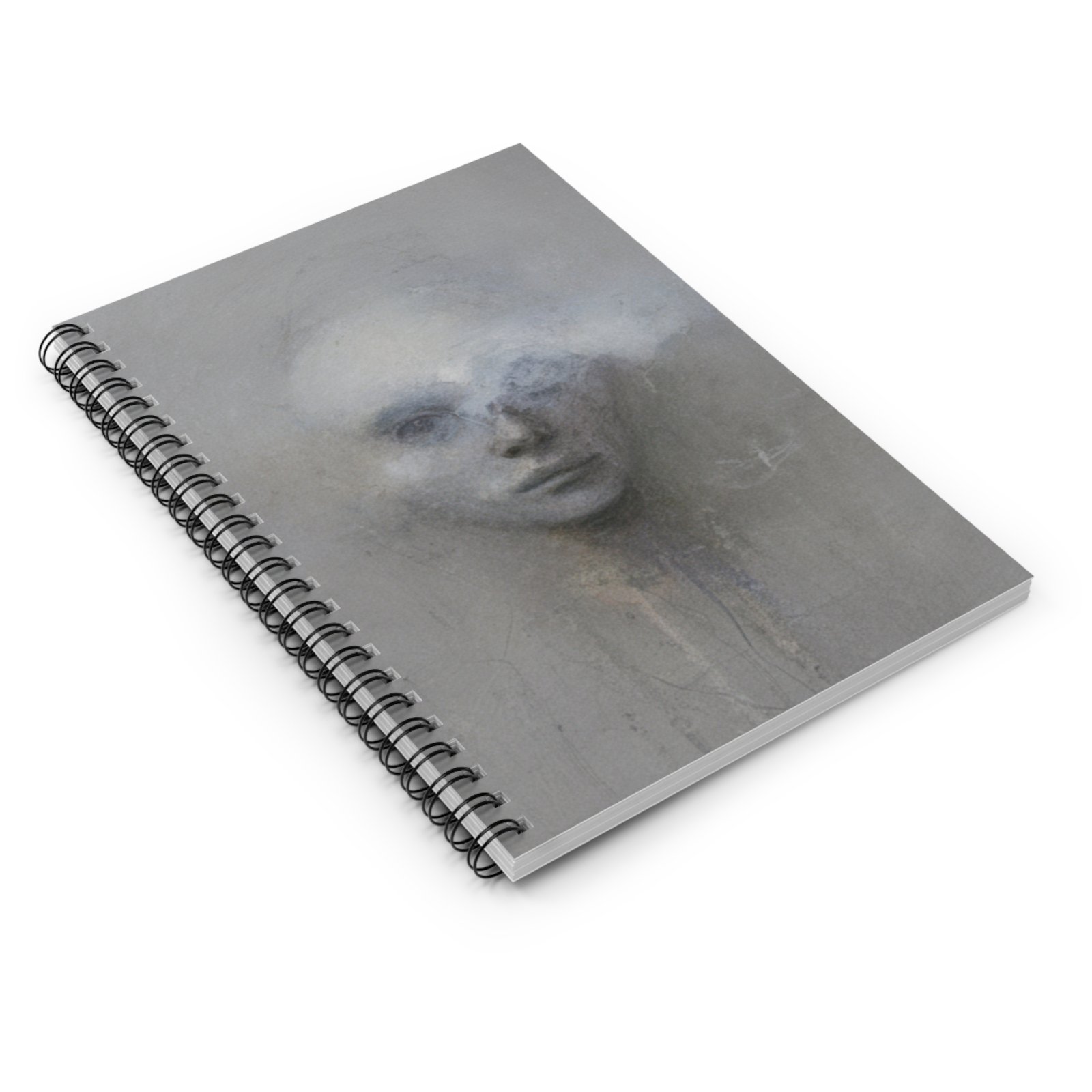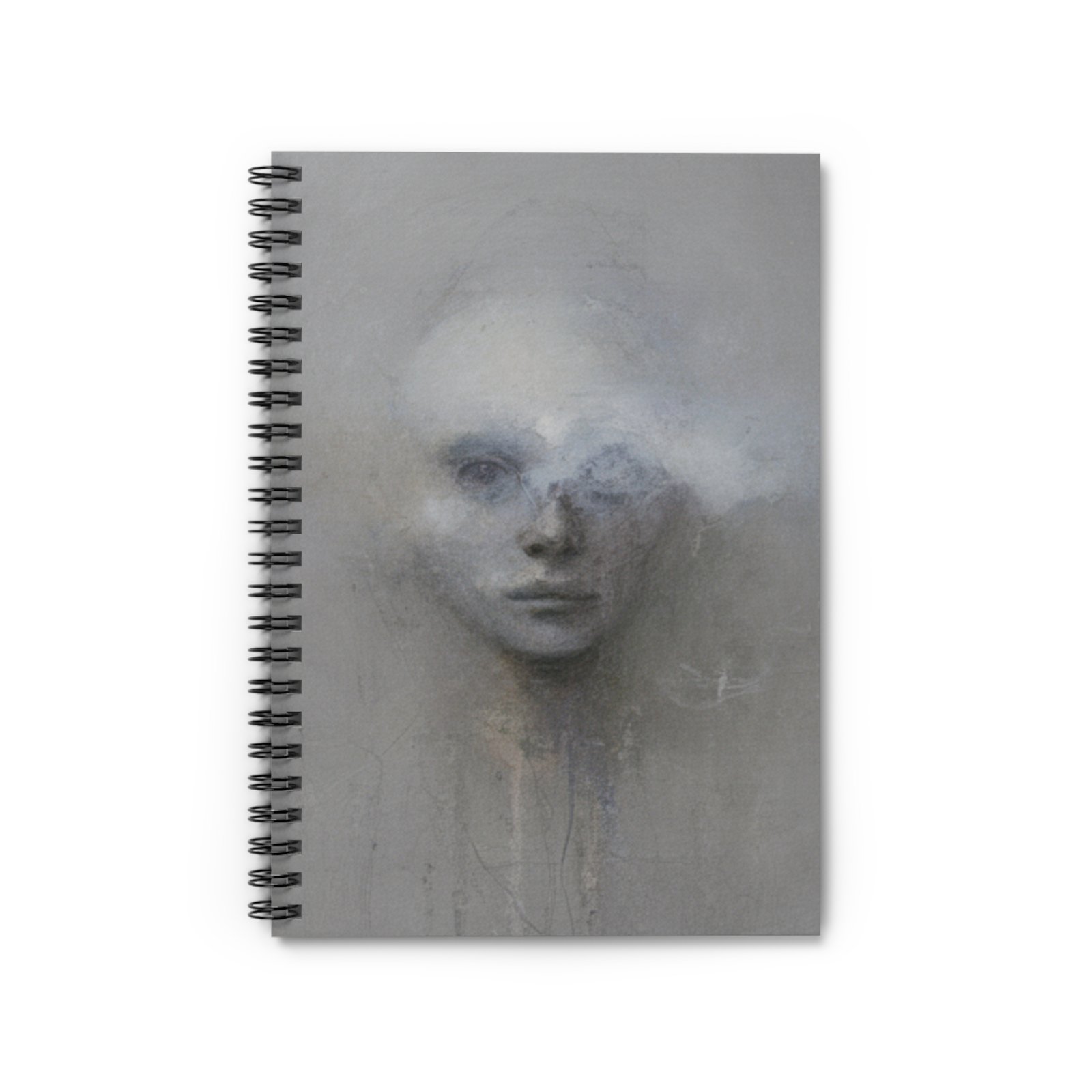 This ruled spiral notebook carries a quietly haunting portrait on the front, conjuring a misty, contemplative mood every time you reach for it. At 6″ x 8″ it slips into backpacks and tote bags, ready for sketching, journaling, or jotting down fleeting ideas. The heavy 350gsm covers protect 118 ruled pages of smooth 90gsm paper that take ink and pencil cleanly. A sturdy metal spiral lays flat for comfortable writing across spreads, and an inner document pocket keeps loose notes or reference clippings secure. The dark grey back cover and subtle, ethereal artwork make this notebook feel personal — the kind you return to when you need quiet focus or a place to explore deeper thoughts.