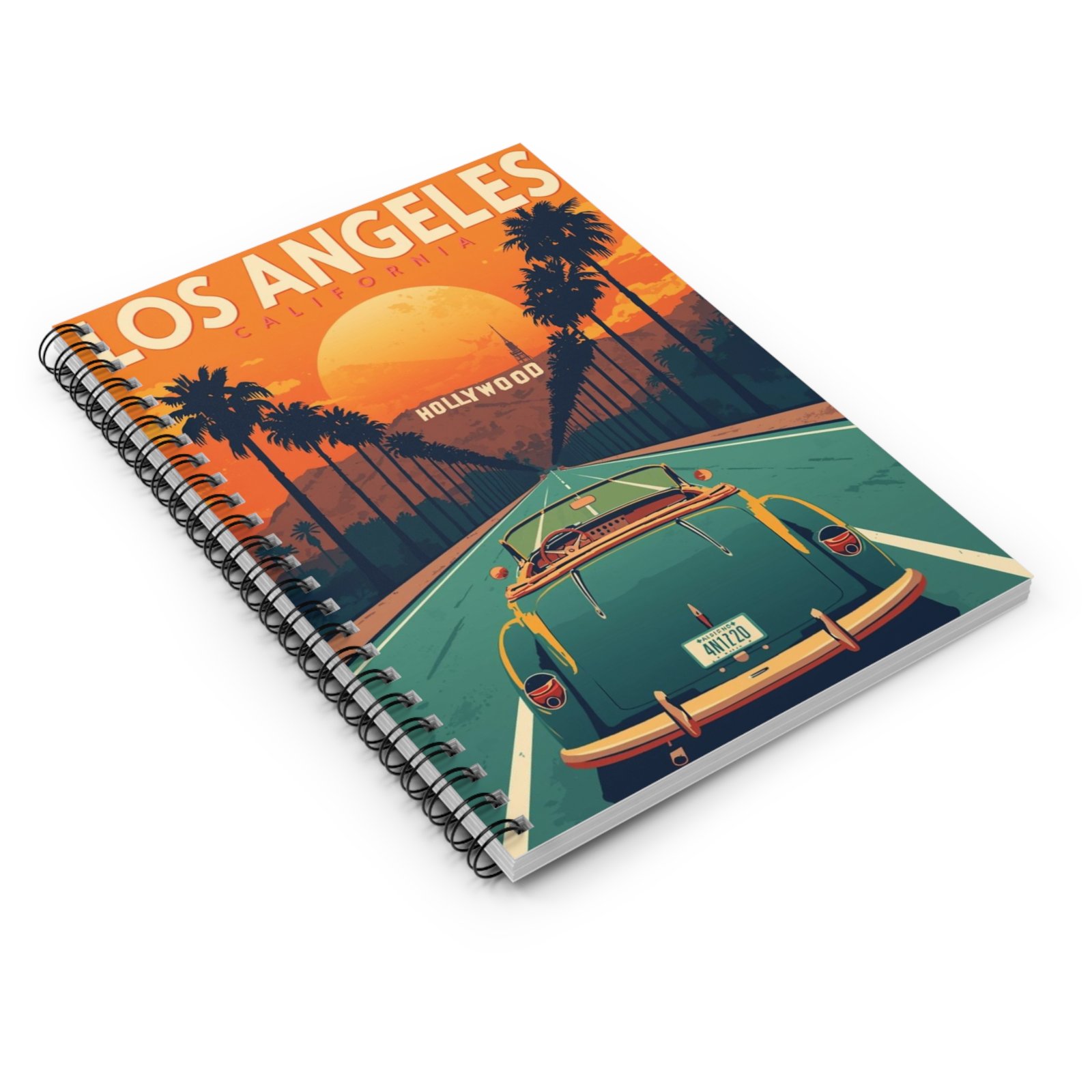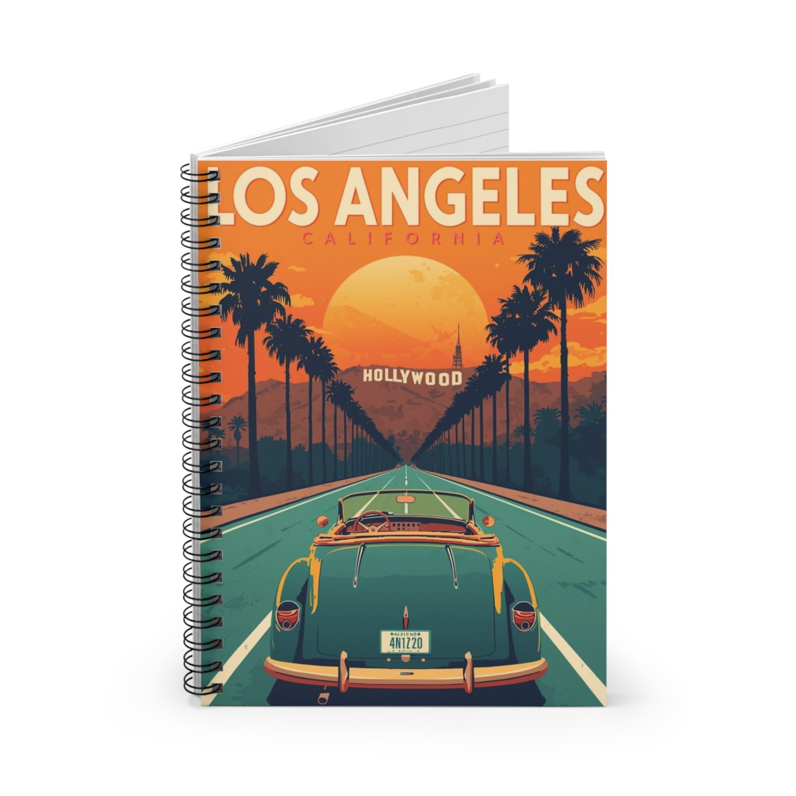 This ruled spiral notebook carries a sun-drenched Los Angeles scene that invites you to plan, sketch, and daydream. The heavy front cover shows a vintage convertible cruising a palm-lined boulevard toward a glowing sunset and the Hollywood sign — a small, tactile escape you can carry in a bag. Inside, smooth 90gsm lined pages take ink without bleed, and a document pocket on the inside back cover keeps receipts, tickets, or loose notes safe. The sturdy metal spiral lays flat for easy writing and makes removing pages simple when you want to share a page or tuck a sketch into a folder. Compact at 6″ x 8″, it slips into backpacks and tote bags for writing on the go or for a quiet moment at a café.