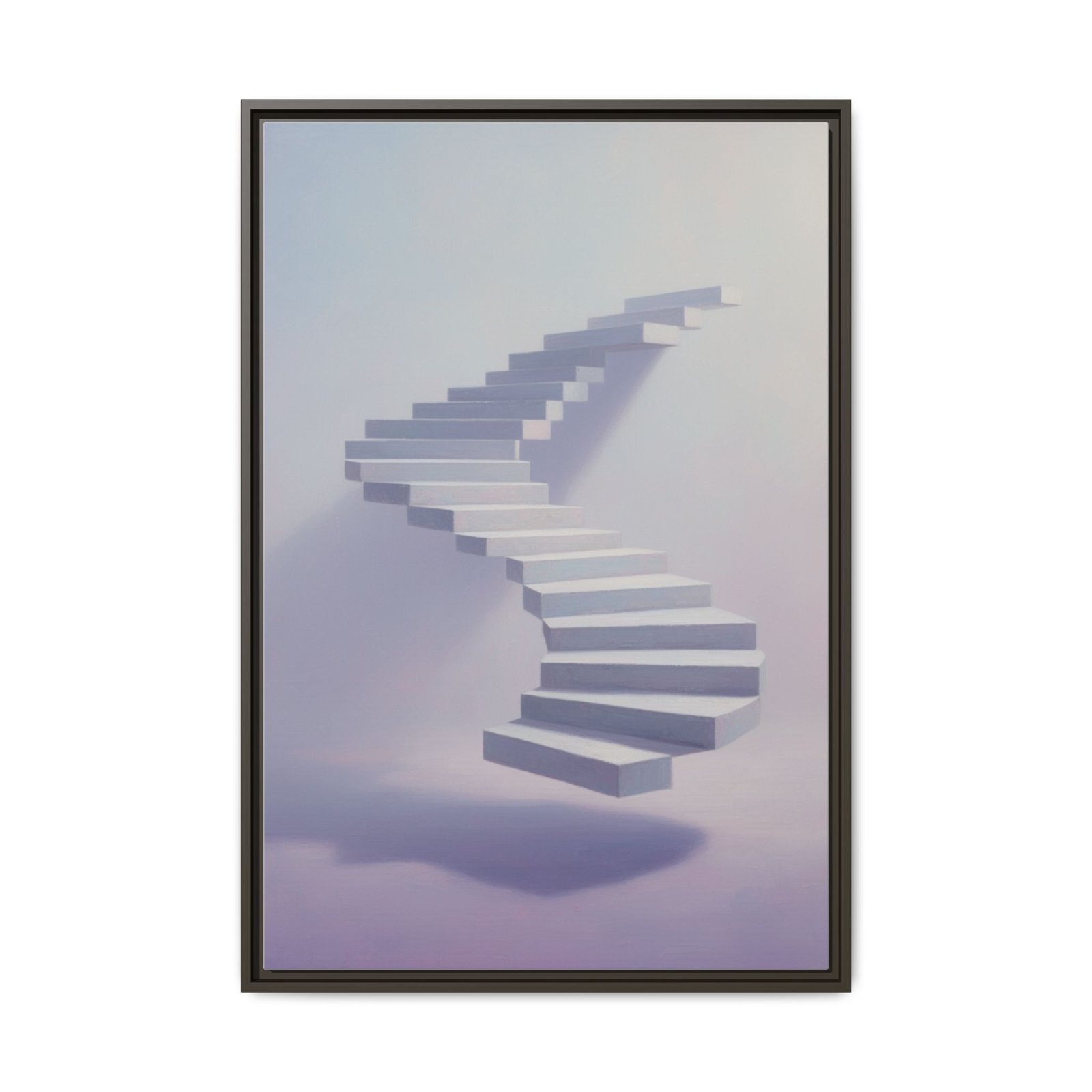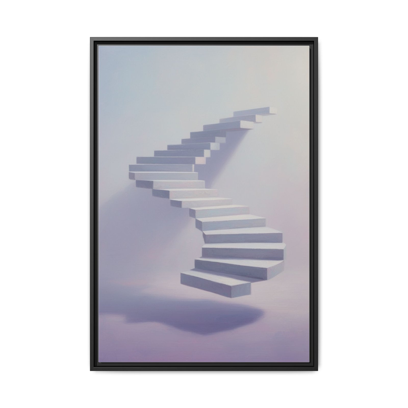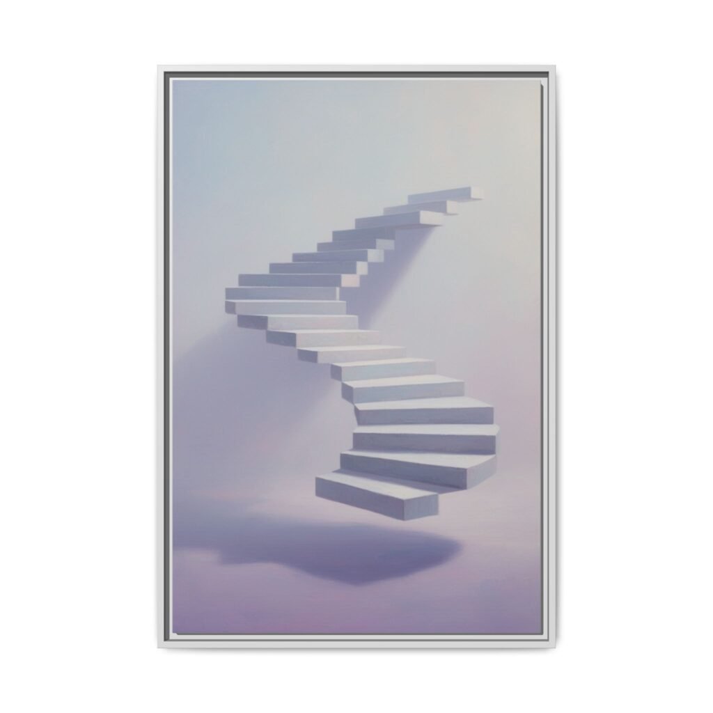 Soft, surreal light drifts across a floating staircase captured on matte canvas. The framed print balances dreamy pastels with crisp detail—each step rendered with depth and a delicate shadow that seems to hover above the page. Hung in a hallway, studio, or bedside nook, this piece invites calm and quiet curiosity. It reads like a visual whisper: contemplative, modern, and slightly otherworldly—an artwork that nudges the room toward slow mornings, reflective afternoons, and late-night thinking sessions.