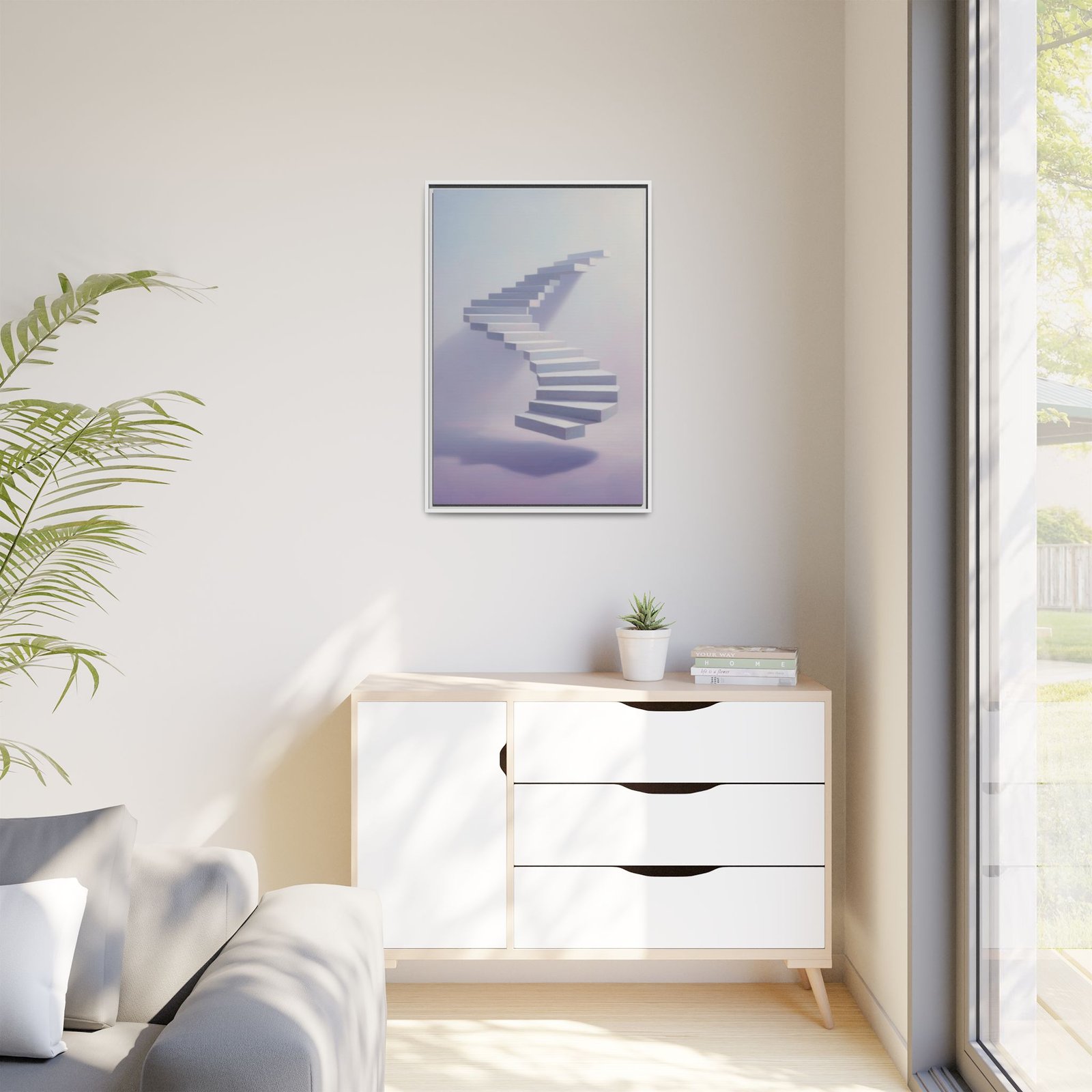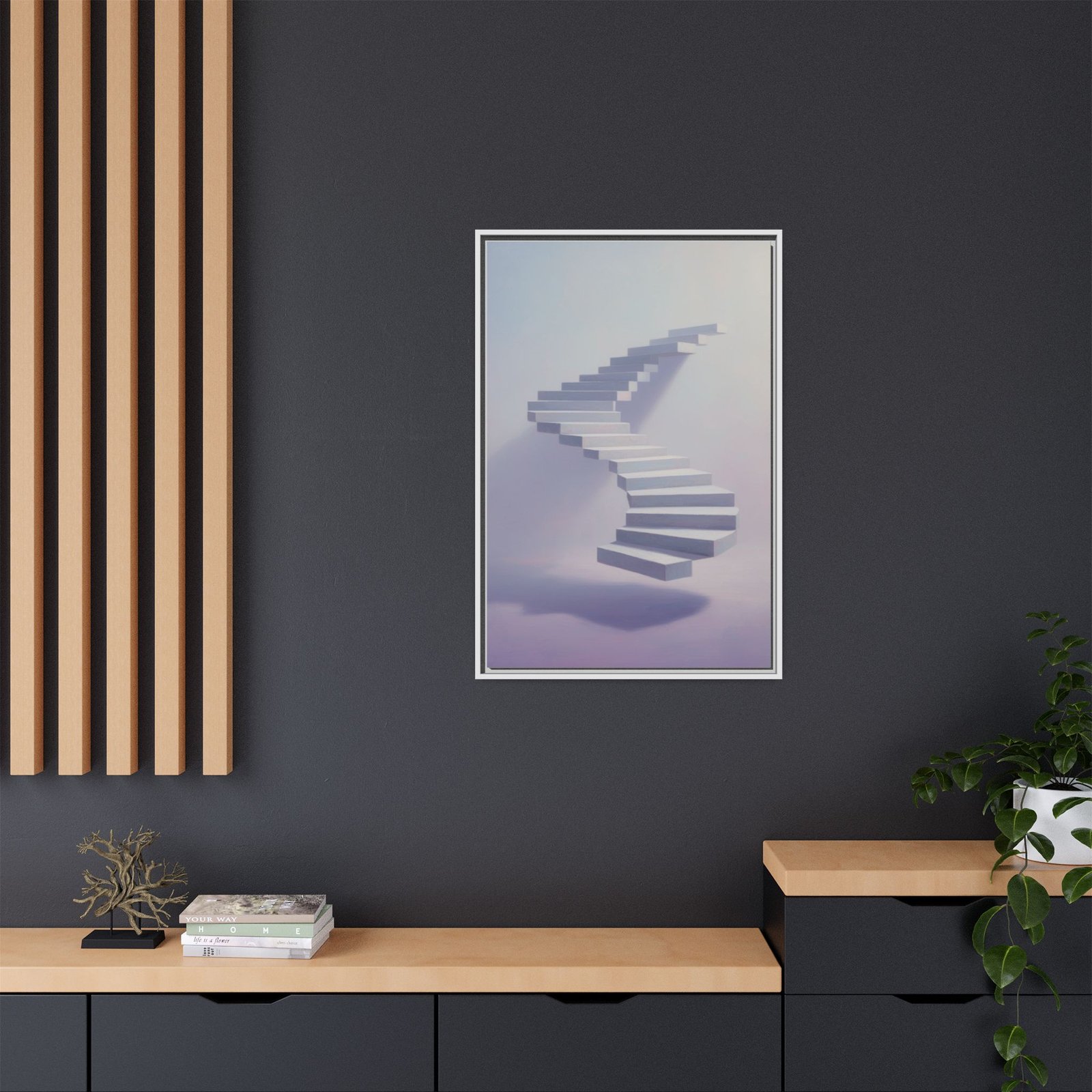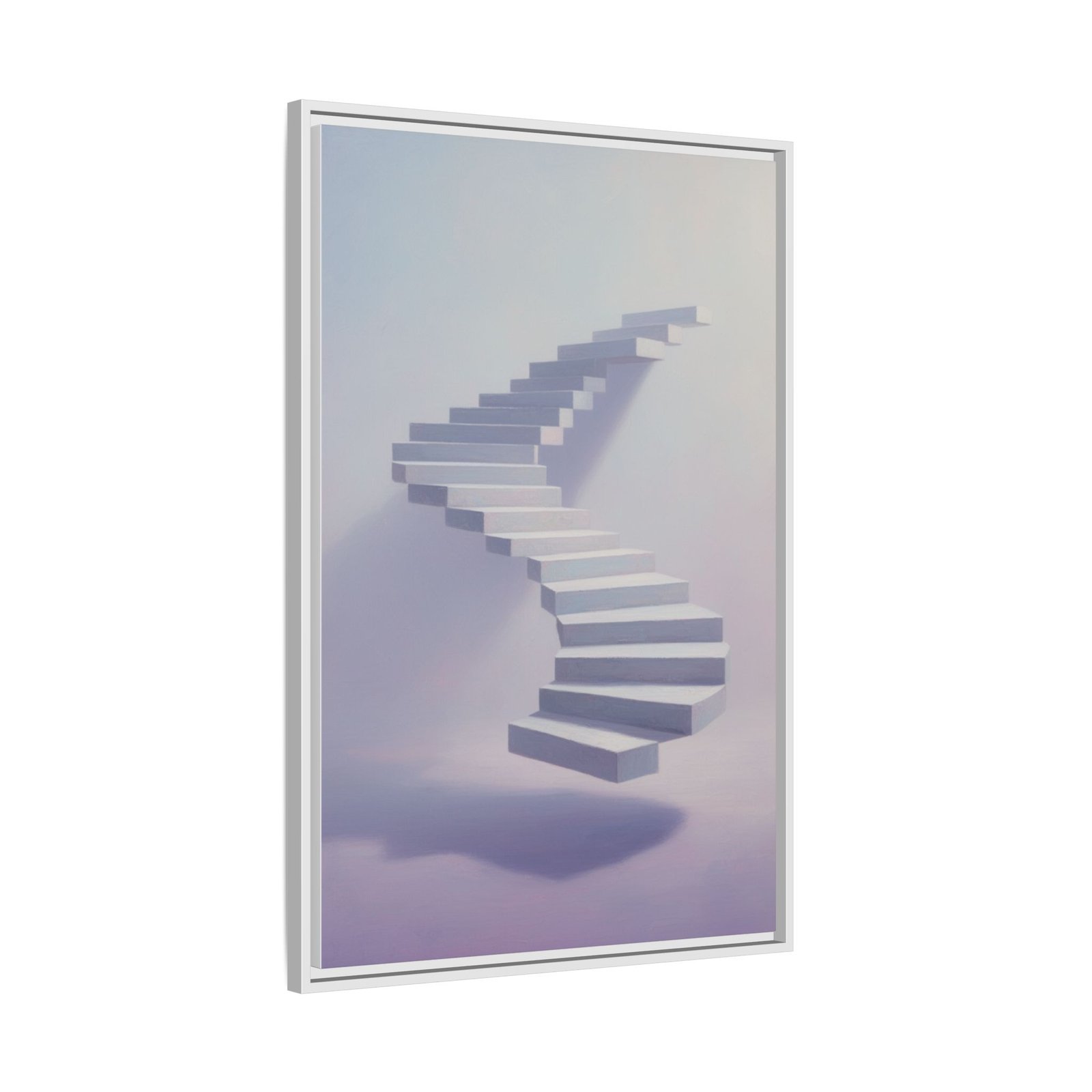 Soft, surreal light drifts across a floating staircase captured on matte canvas. The framed print balances dreamy pastels with crisp detail—each step rendered with depth and a delicate shadow that seems to hover above the page. Hung in a hallway, studio, or bedside nook, this piece invites calm and quiet curiosity. It reads like a visual whisper: contemplative, modern, and slightly otherworldly—an artwork that nudges the room toward slow mornings, reflective afternoons, and late-night thinking sessions.