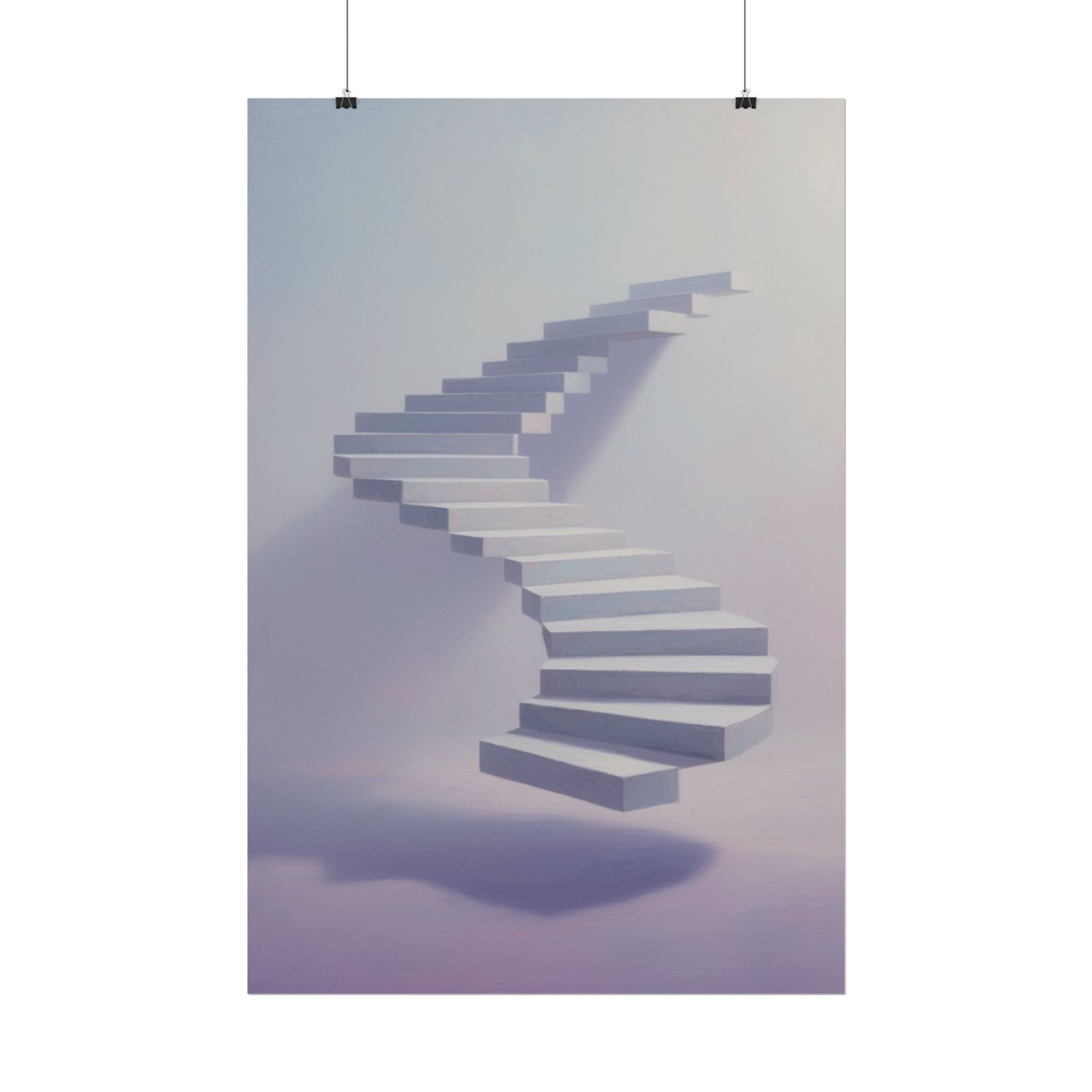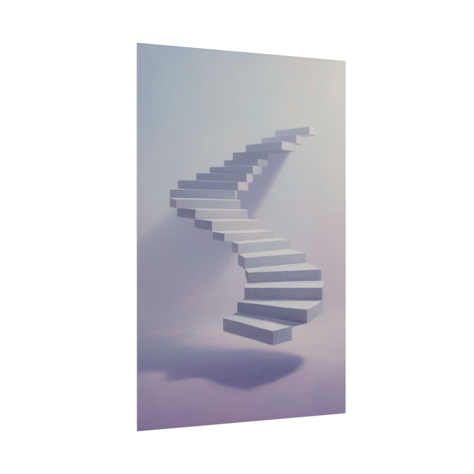 A soft, dreamy art print that lifts the room with quiet surrealism. Pale lavender and misty blue blend into a floating spiral staircase that seems to climb into light and possibility. Printed with archival-quality inks on your choice of matte, or semi-glossy paper, the image keeps its delicate gradients and soft shadows without glare or color loss. It hangs easily in living rooms, studios, or bedroom nooks to create a contemplative corner — a subtle focal point that invites a slow breath and a second look.