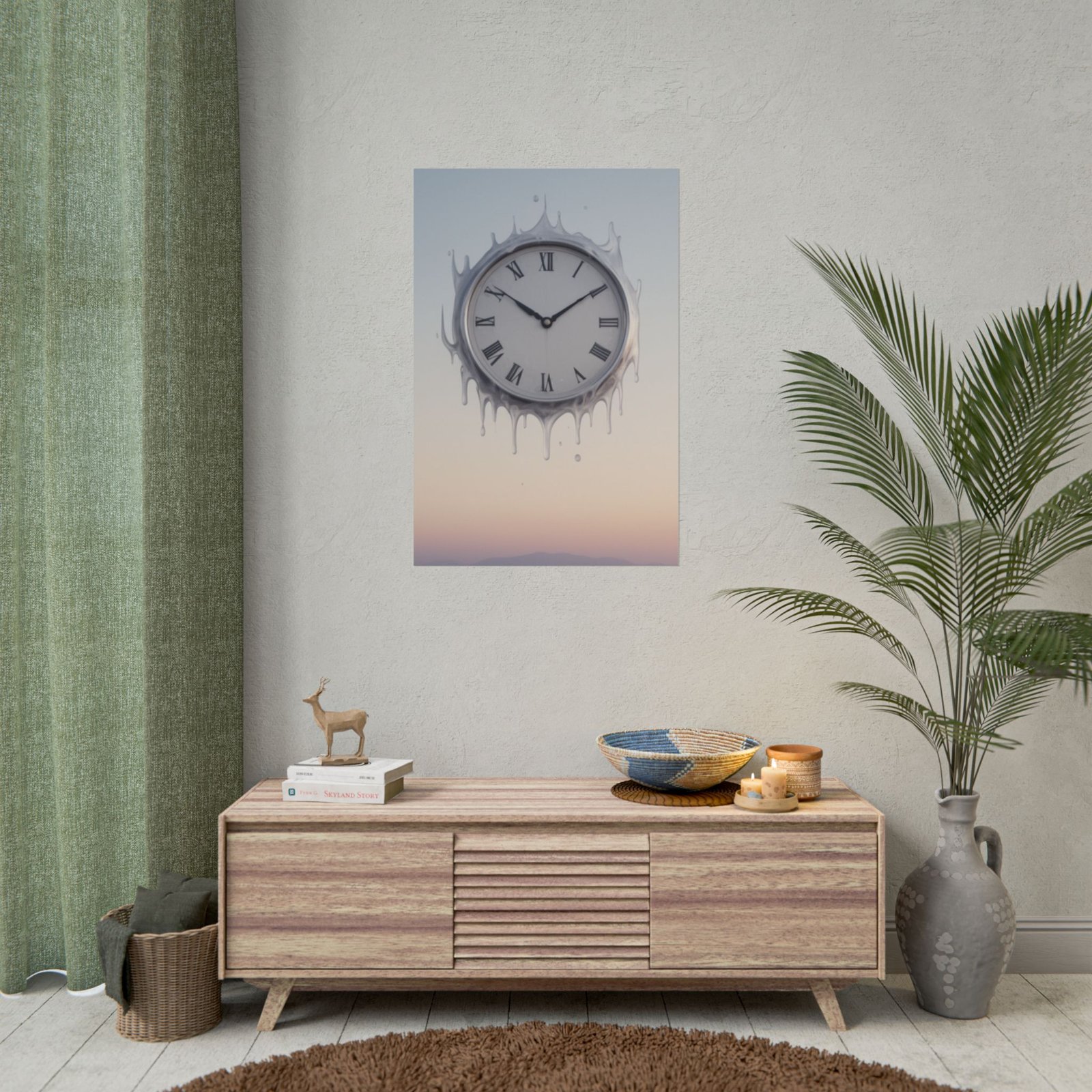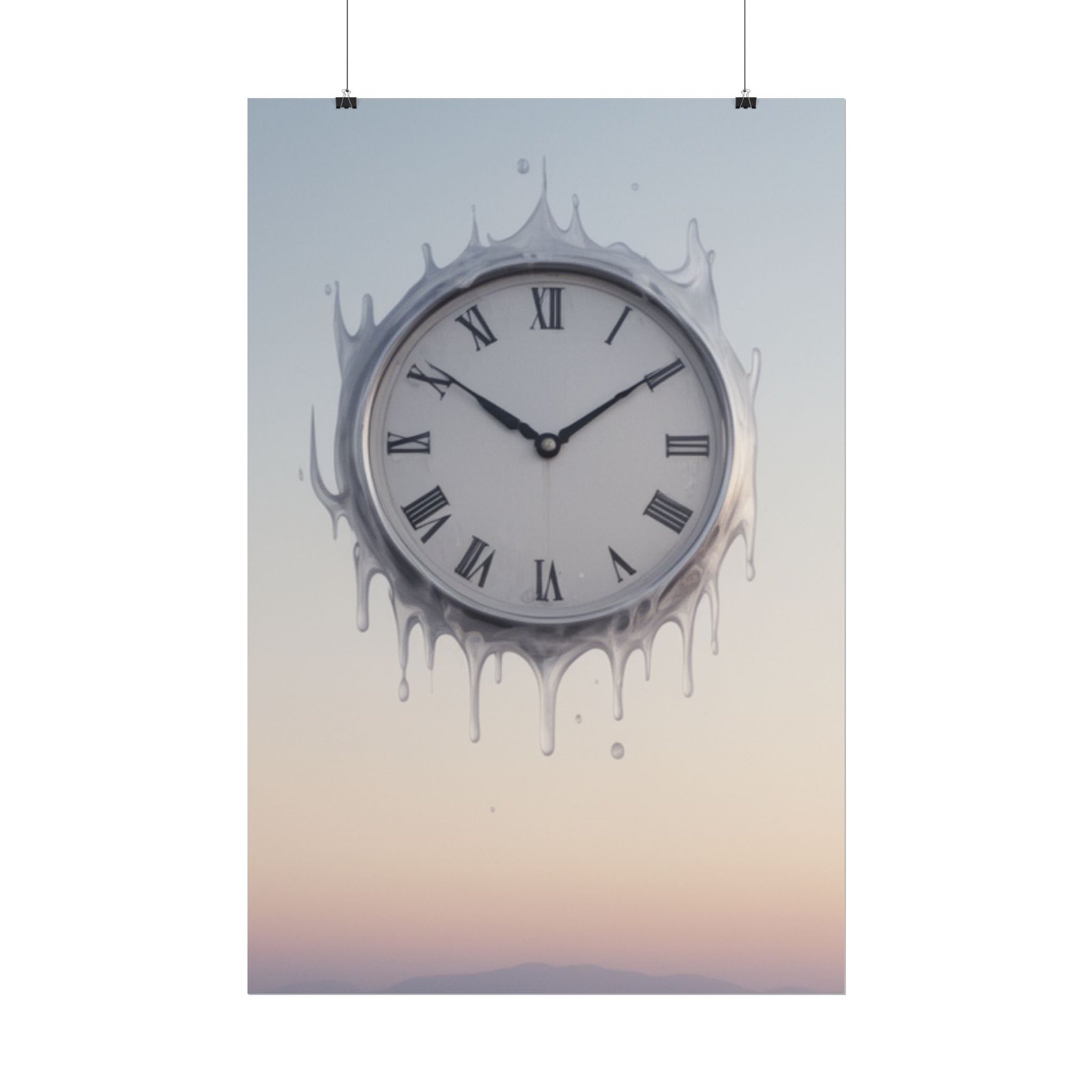 A dreamy, artful rolled poster that captures a melting clock set against a soft pastel horizon. The scene feels like a quiet, suspended moment — time softened at the edges, colors blending like dawn. This print brings a calm, surreal energy to a bedroom, studio, or reading nook and pairs especially well with minimalist or modern vintage decor. Choose from fine art, matte, or semi-gloss paper to match your preferred texture and color depth; sizes and orientations are available so you can find the right scale for a gallery wall or a single focal piece.