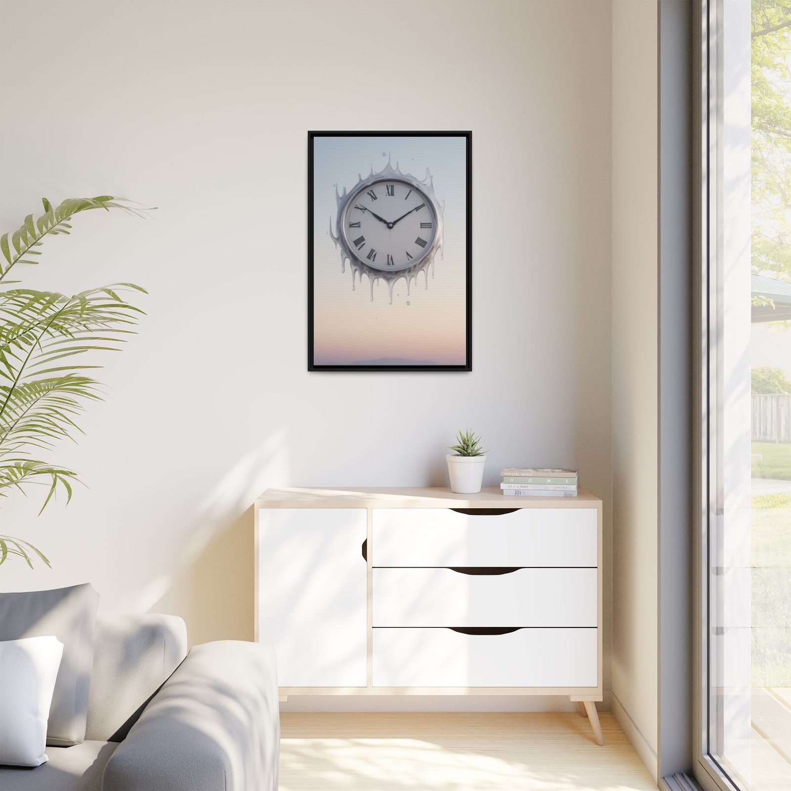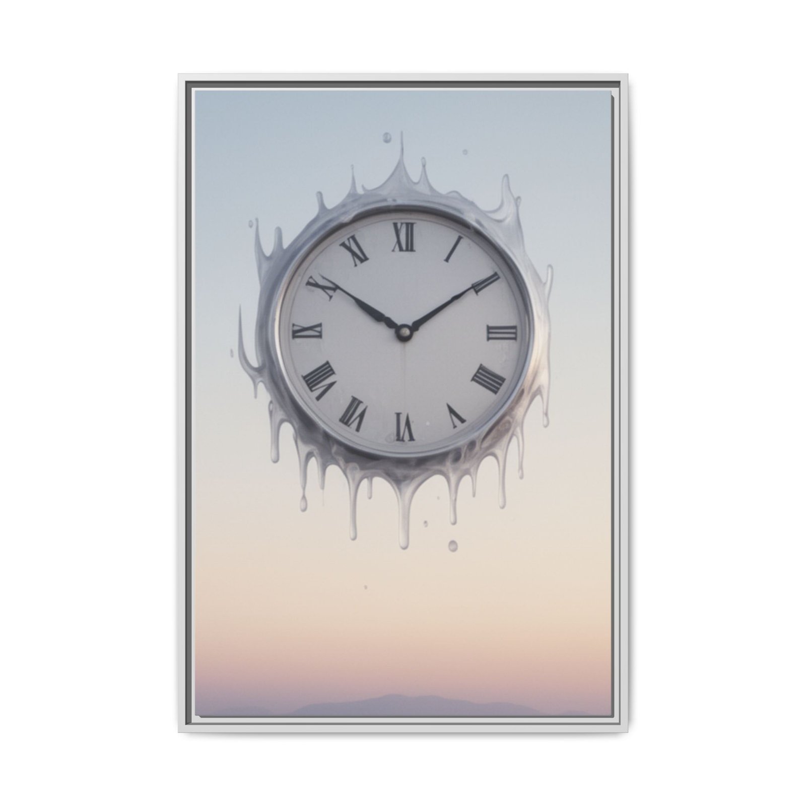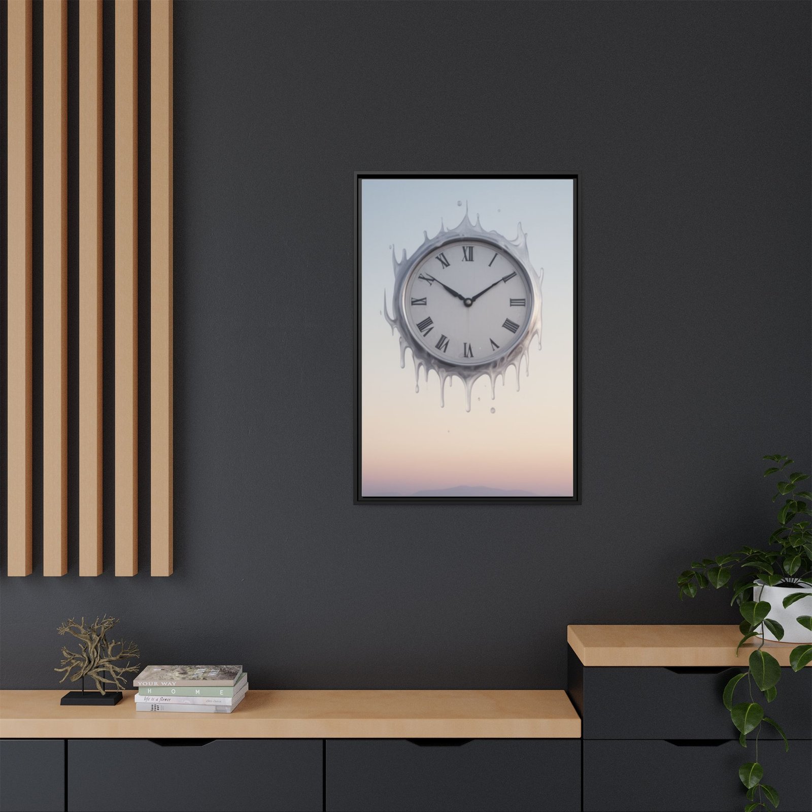 A framed matte canvas print that captures a surreal moment where time itself seems to melt into a soft dawn. The composition pairs a classic clock face with delicate, dripping edges that blend into a pale gradient sky — cool silvers and warm pastels meet in quiet balance. Mounted on sustainably sourced pine and finished with a slim black frame, this piece brings a contemplative hush to living rooms, studios, or bedroom nooks. It’s for anyone who collects quiet, thoughtful art that invites slow looks and gentle conversation.
