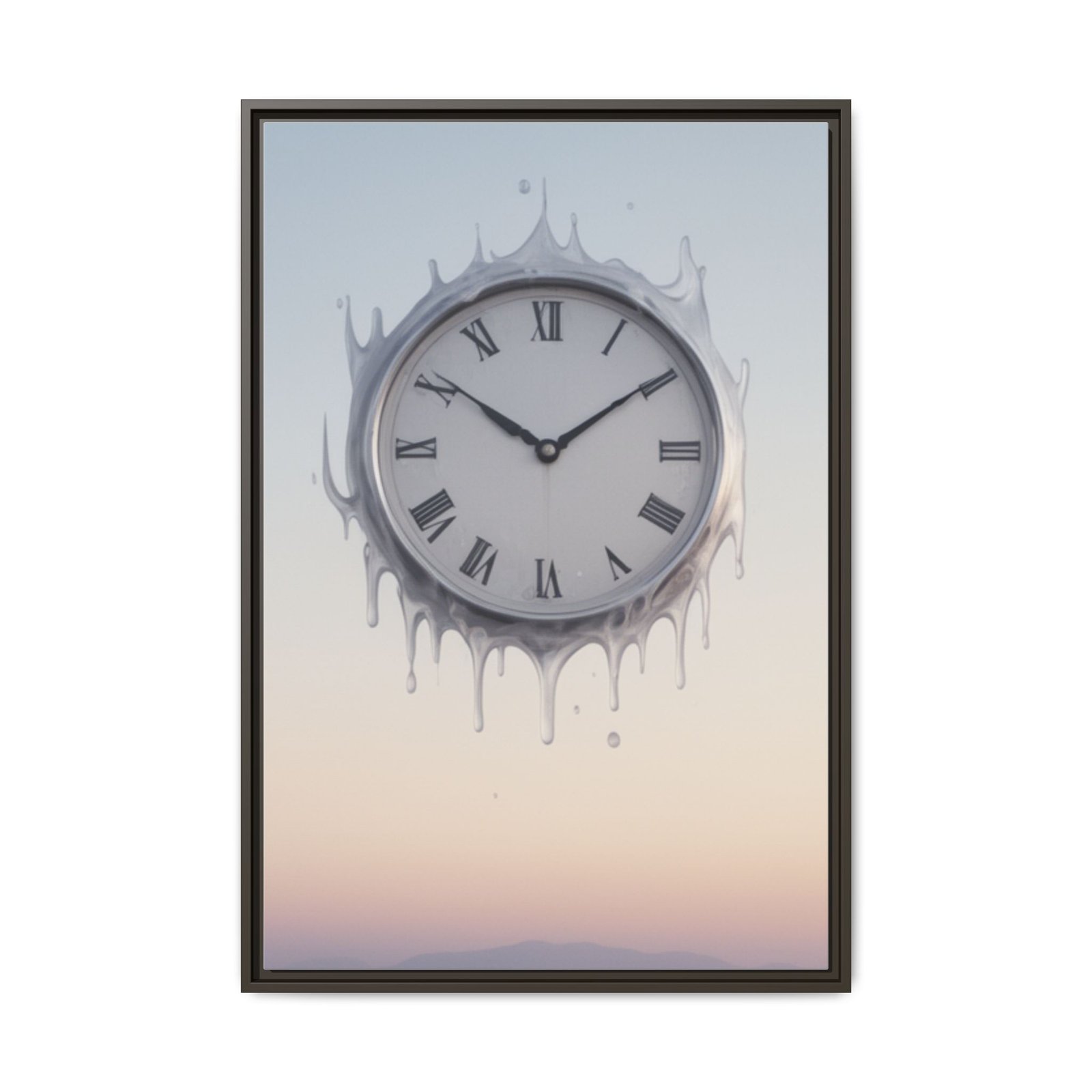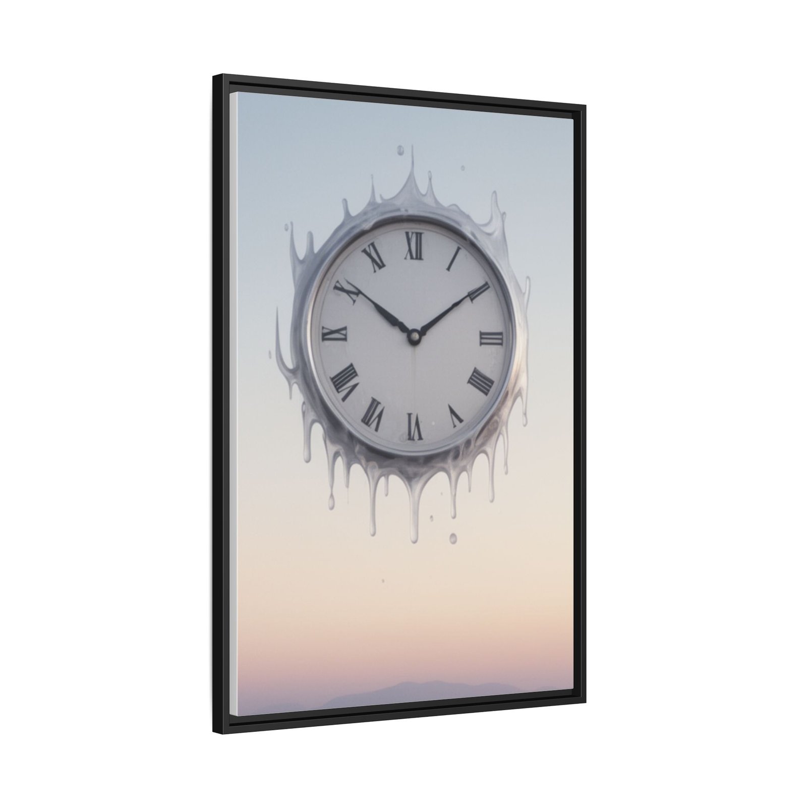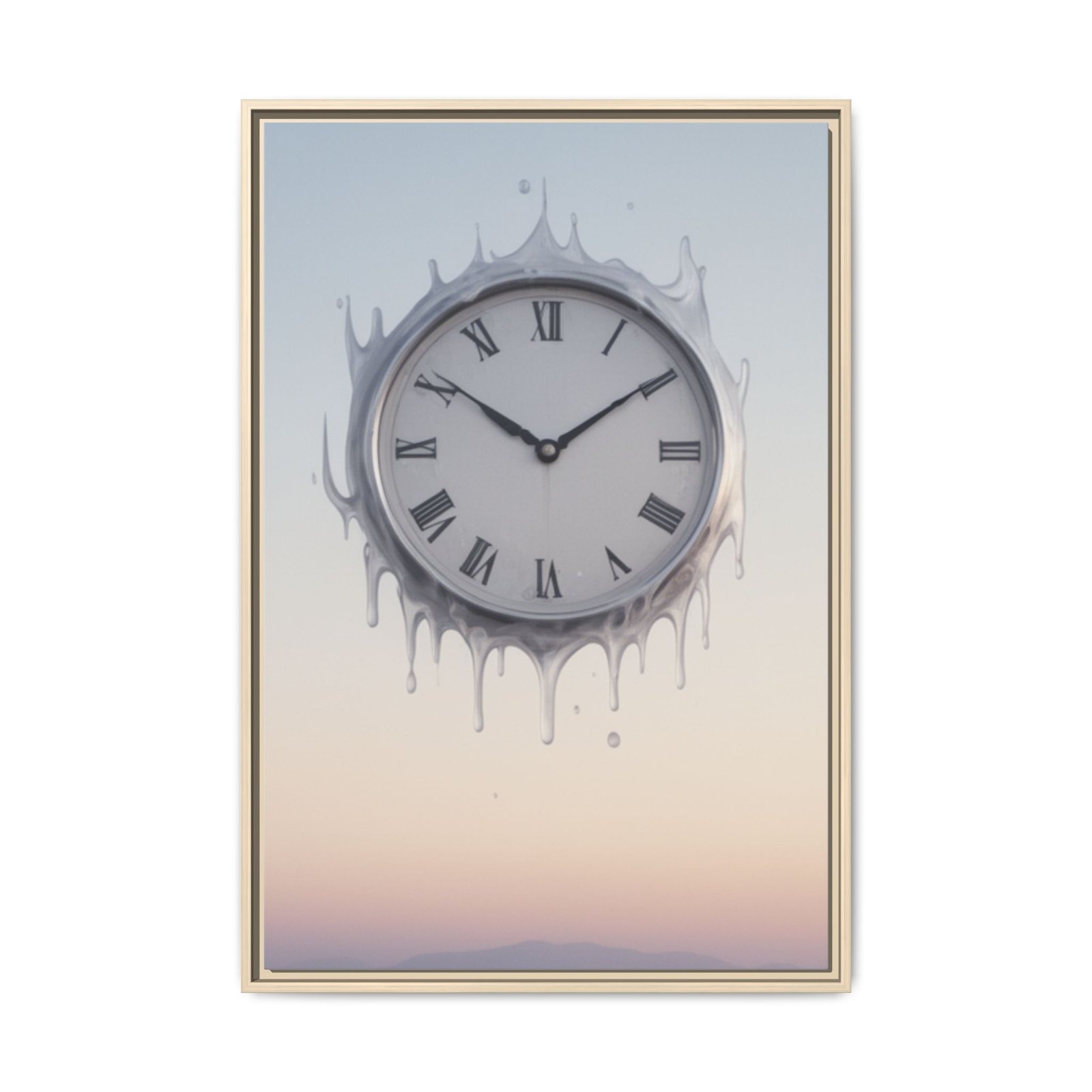 A framed matte canvas print that captures a surreal moment where time itself seems to melt into a soft dawn. The composition pairs a classic clock face with delicate, dripping edges that blend into a pale gradient sky — cool silvers and warm pastels meet in quiet balance. Mounted on sustainably sourced pine and finished with a slim black frame, this piece brings a contemplative hush to living rooms, studios, or bedroom nooks. It’s for anyone who collects quiet, thoughtful art that invites slow looks and gentle conversation.