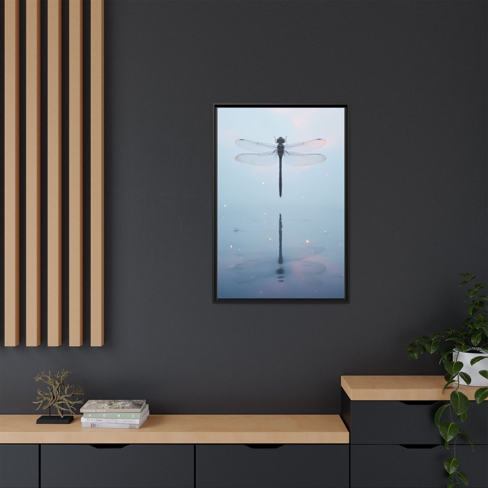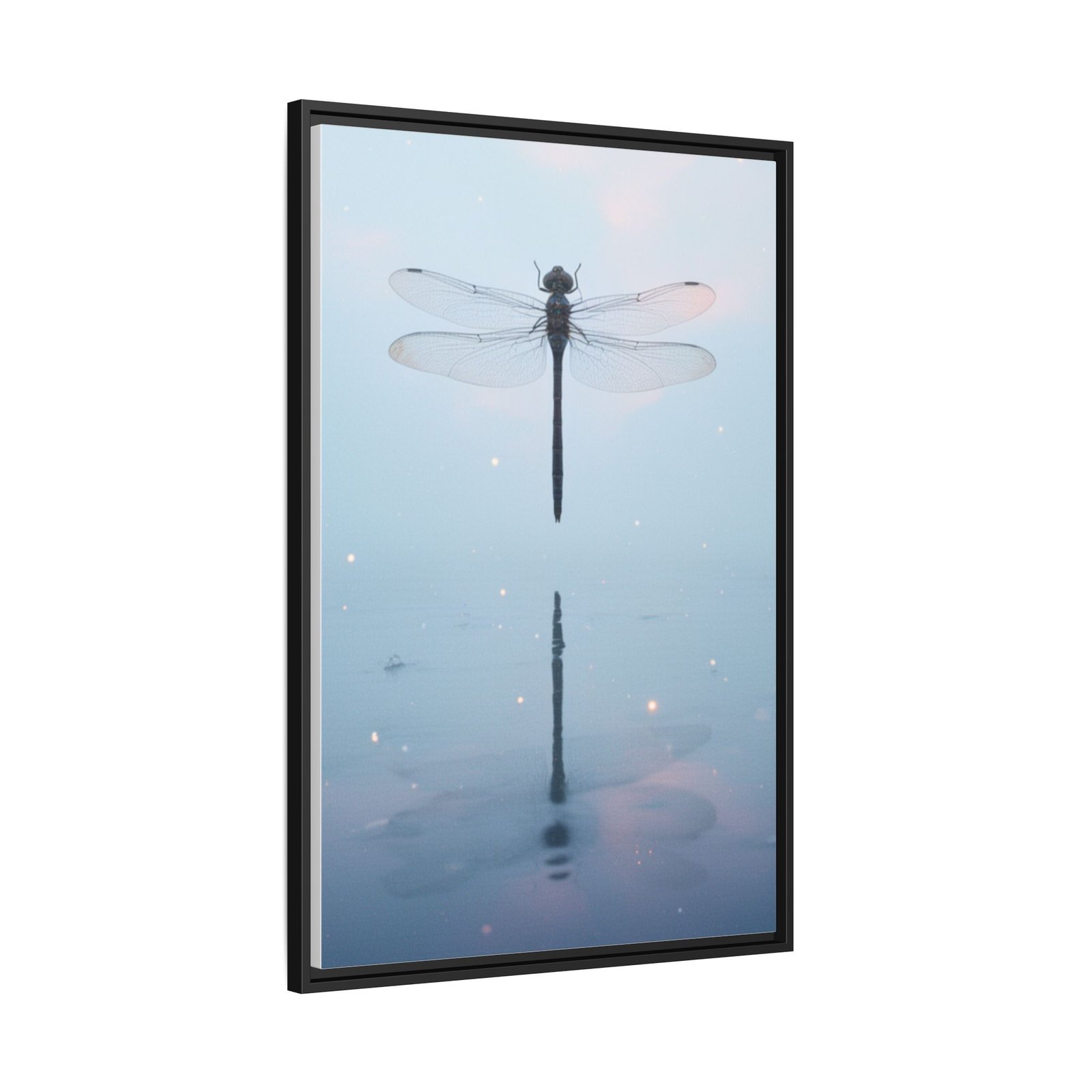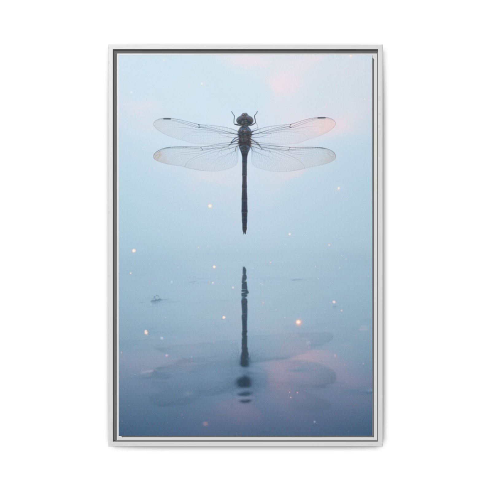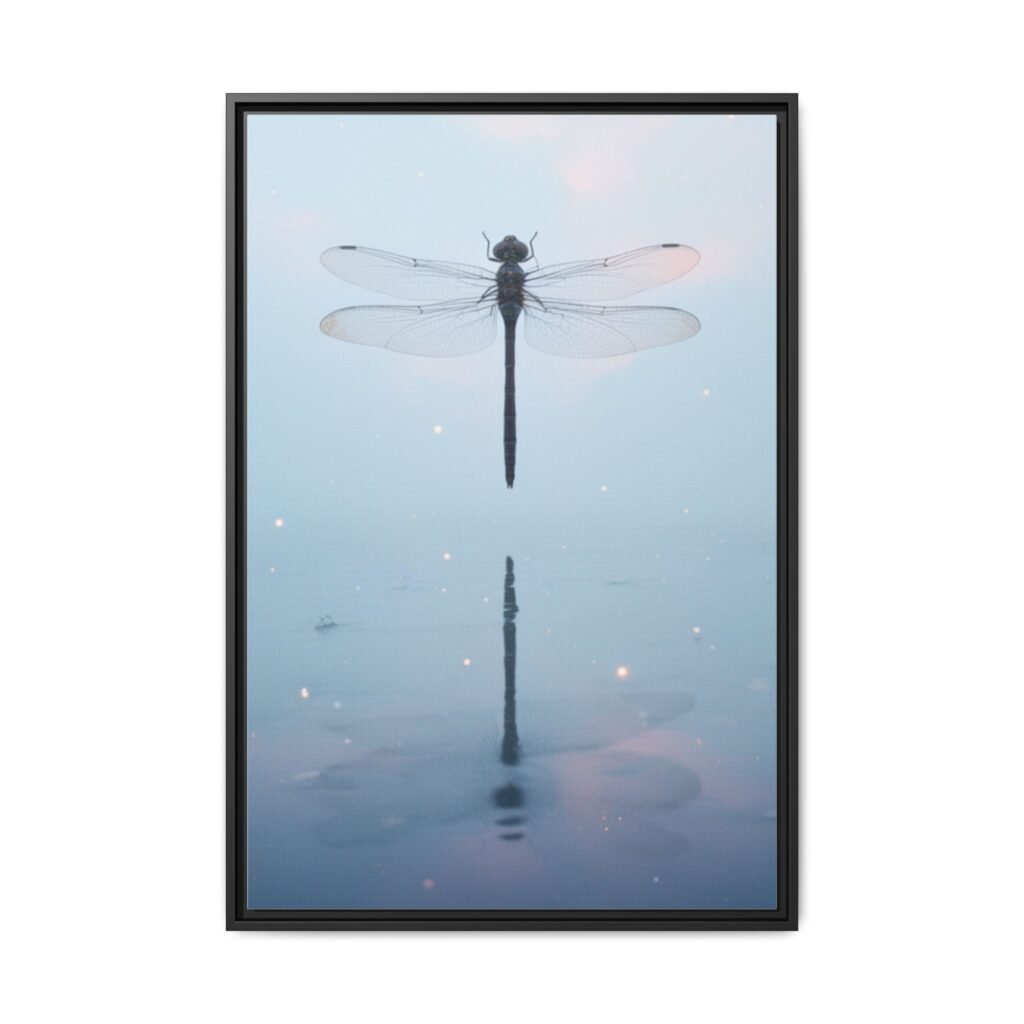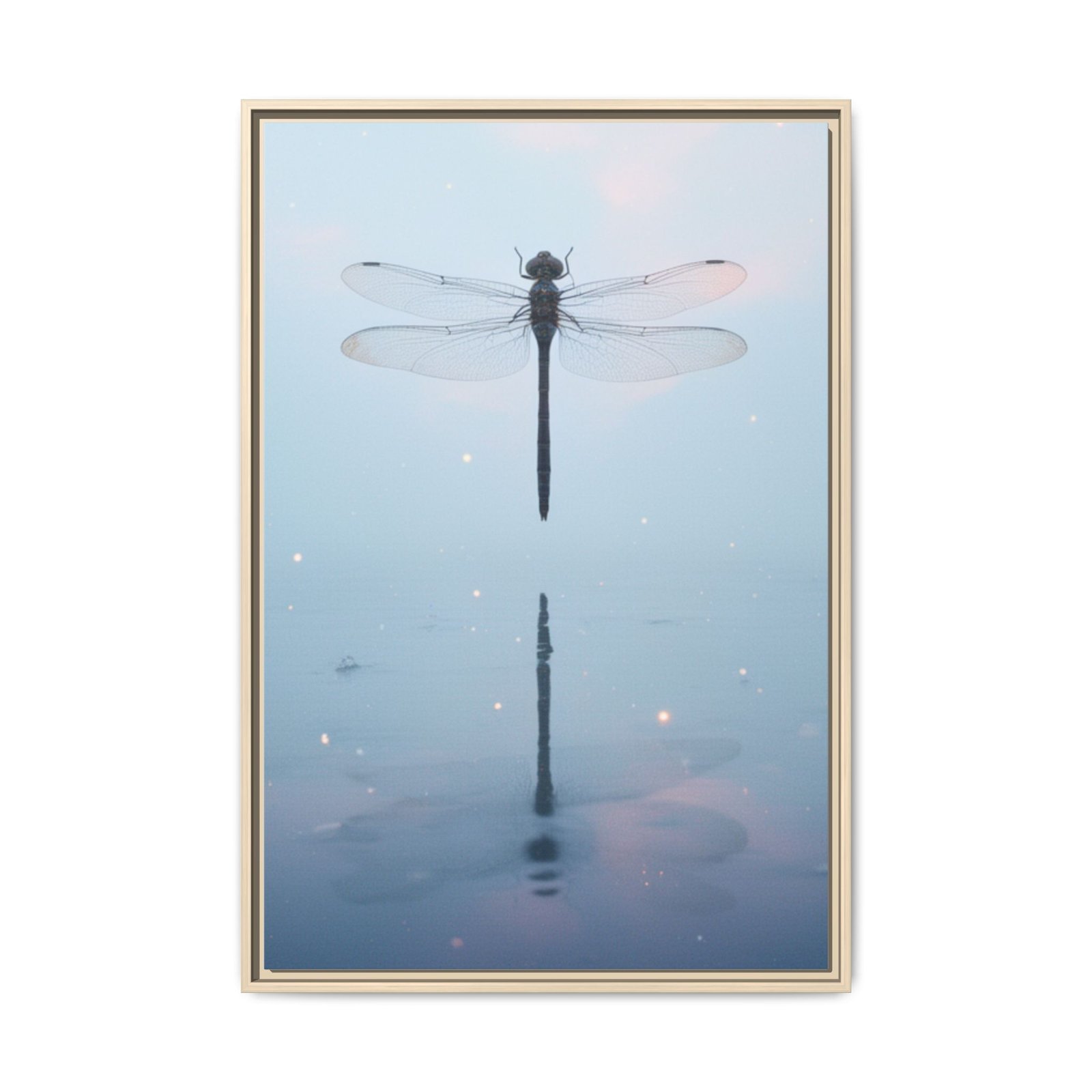 A tranquil matte canvas print that captures a single dragonfly hovering over still water, its delicate wings and mirrored reflection rendered in soft blues and pale pinks. The slim pine frame adds warmth and a clean, modern outline while preserving the muted, ethereal atmosphere. Hang it in a quiet corner to invite calm — the subtle sparkle details and high-fidelity inks keep the image luminous without glare. This framed canvas feels like a small, restful moment you can return to each day.