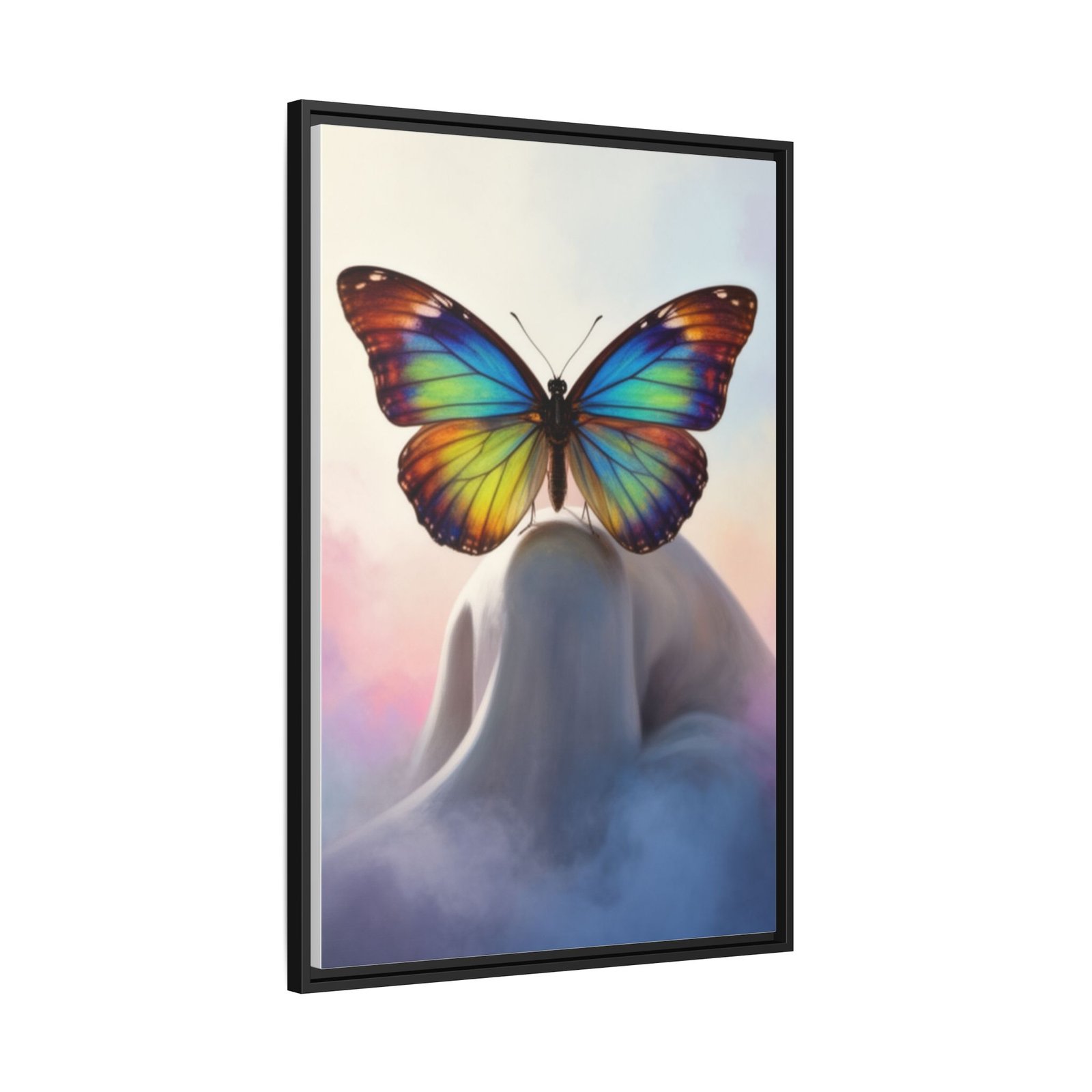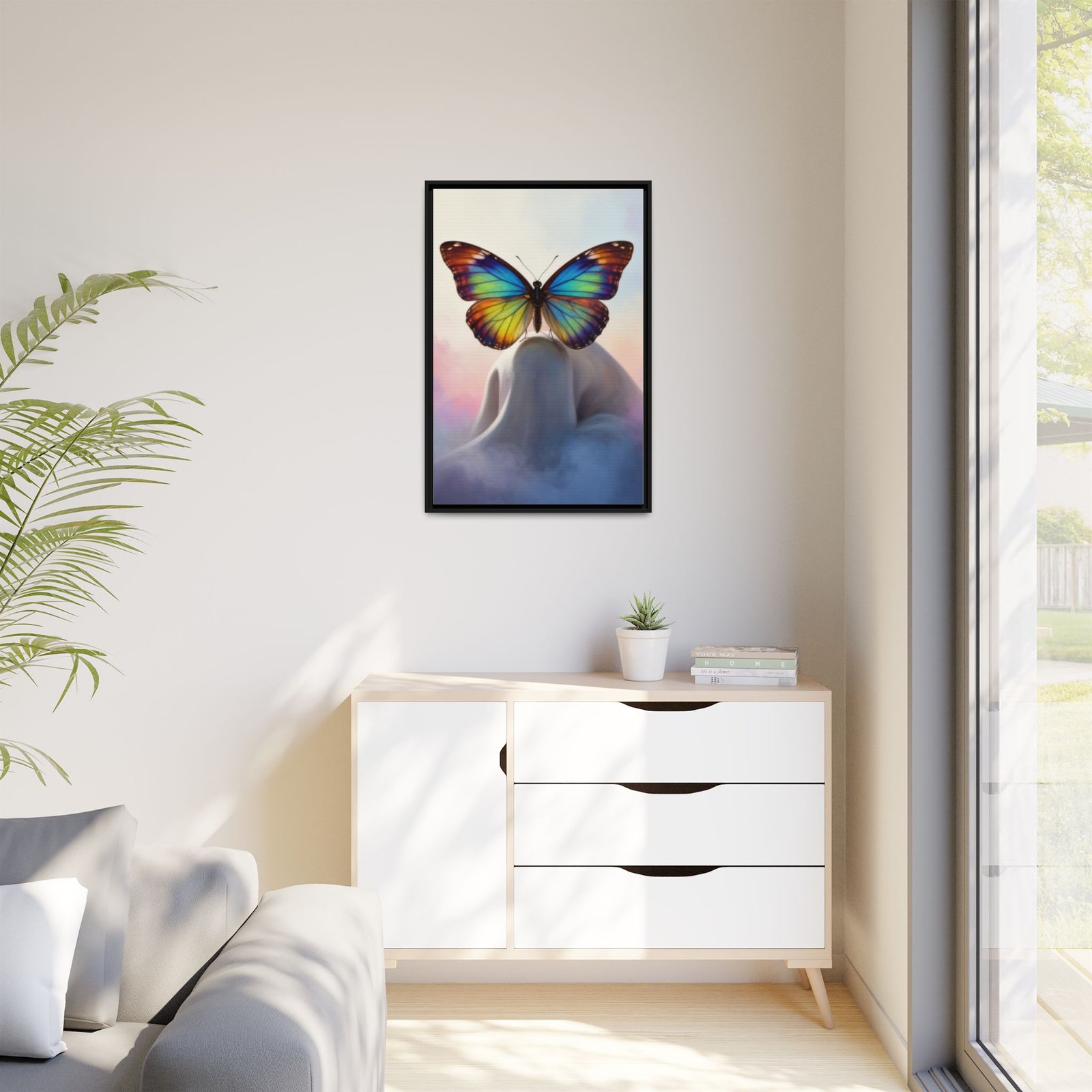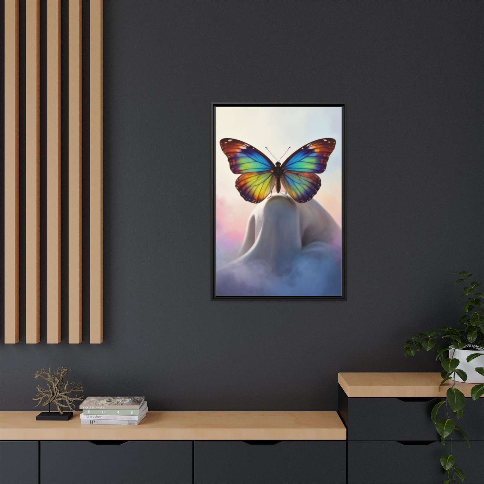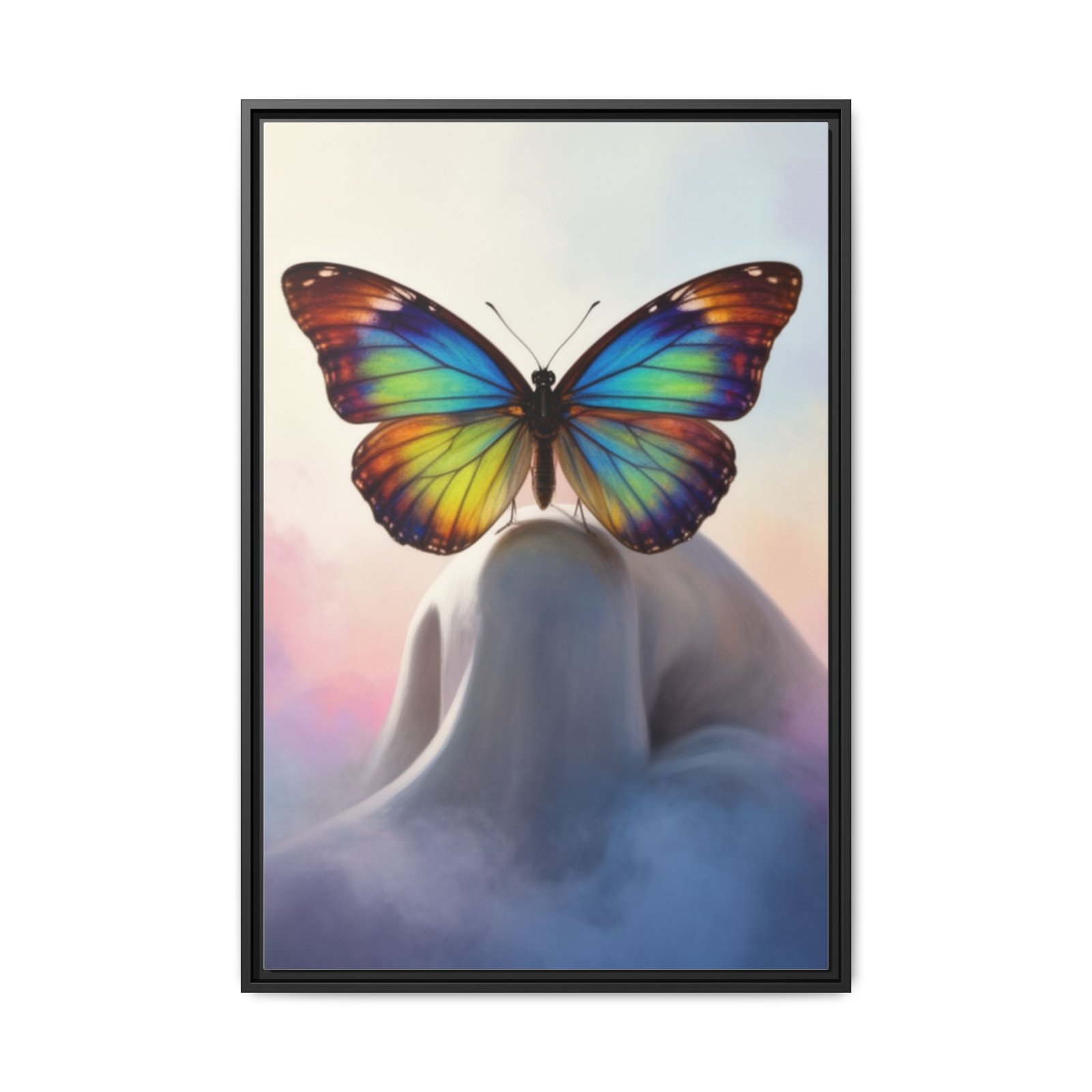A framed matte canvas print that brings a quiet, uplifting moment into any room. The artwork shows a luminous rainbow butterfly poised above soft, cloudlike forms, rendered in vibrant, fade-resistant inks that hold bright, jewel-like color. Lightweight pine framing and a subtle matte finish keep the focus on the image while adding a clean, modern edge. Hang it in a reading nook, bedroom, or studio to introduce warmth, gentle movement, and a whisper of wonder to everyday life.