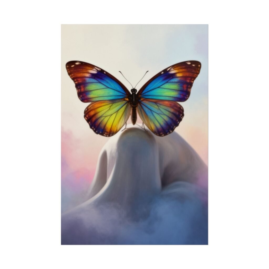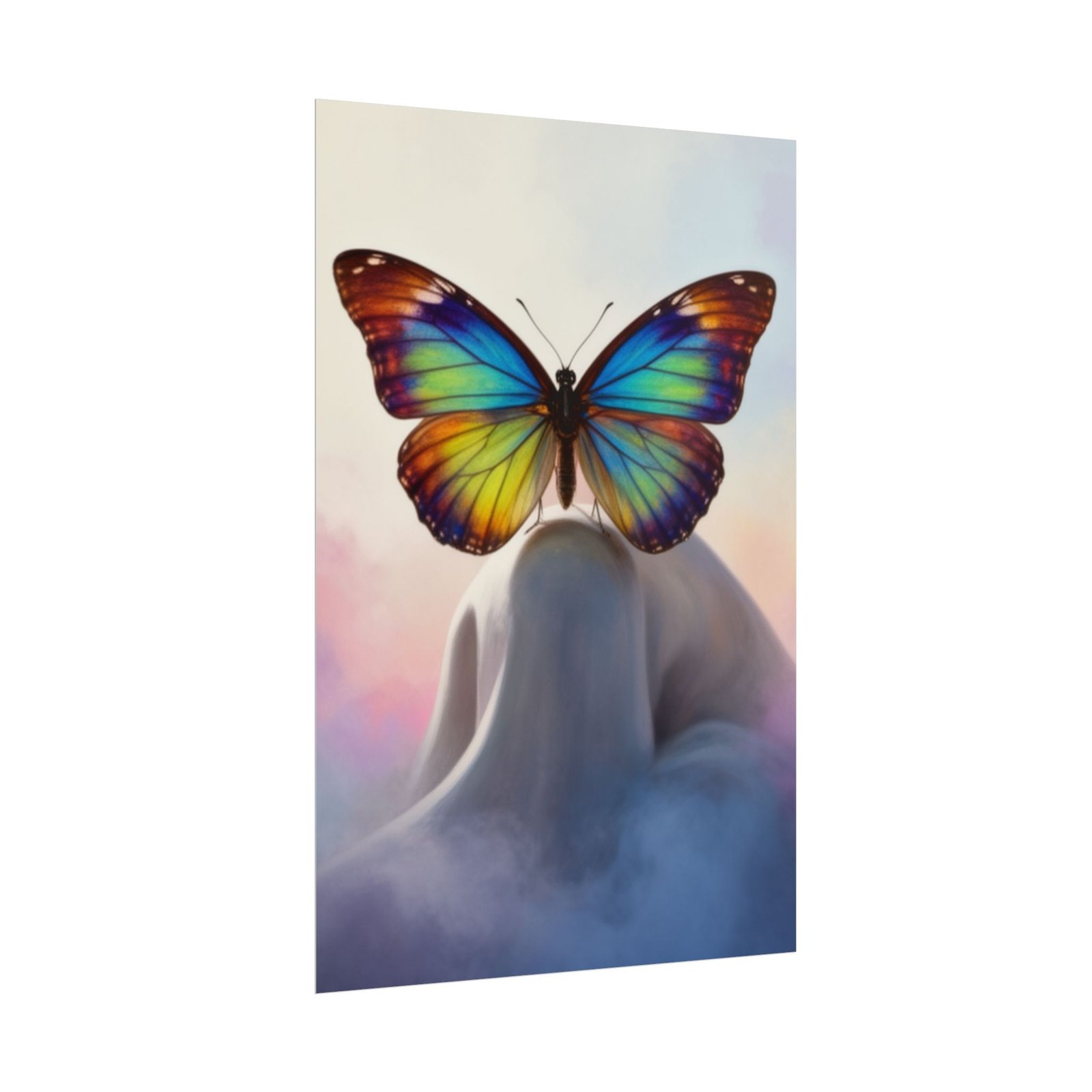 A rolled art poster that brings calm and color into a quiet corner. A luminous rainbow butterfly rises above soft, cloudlike forms, rendered with painterly light and a gentle, dreamlike palette. The print’s subtle texture and vivid inks keep the wings bright while the matte or fine art surface preserves the soft atmospheric shading. It turns a reading nook, studio wall, or bedroom into a small, meditative scene that invites slow breaths and lingering looks.