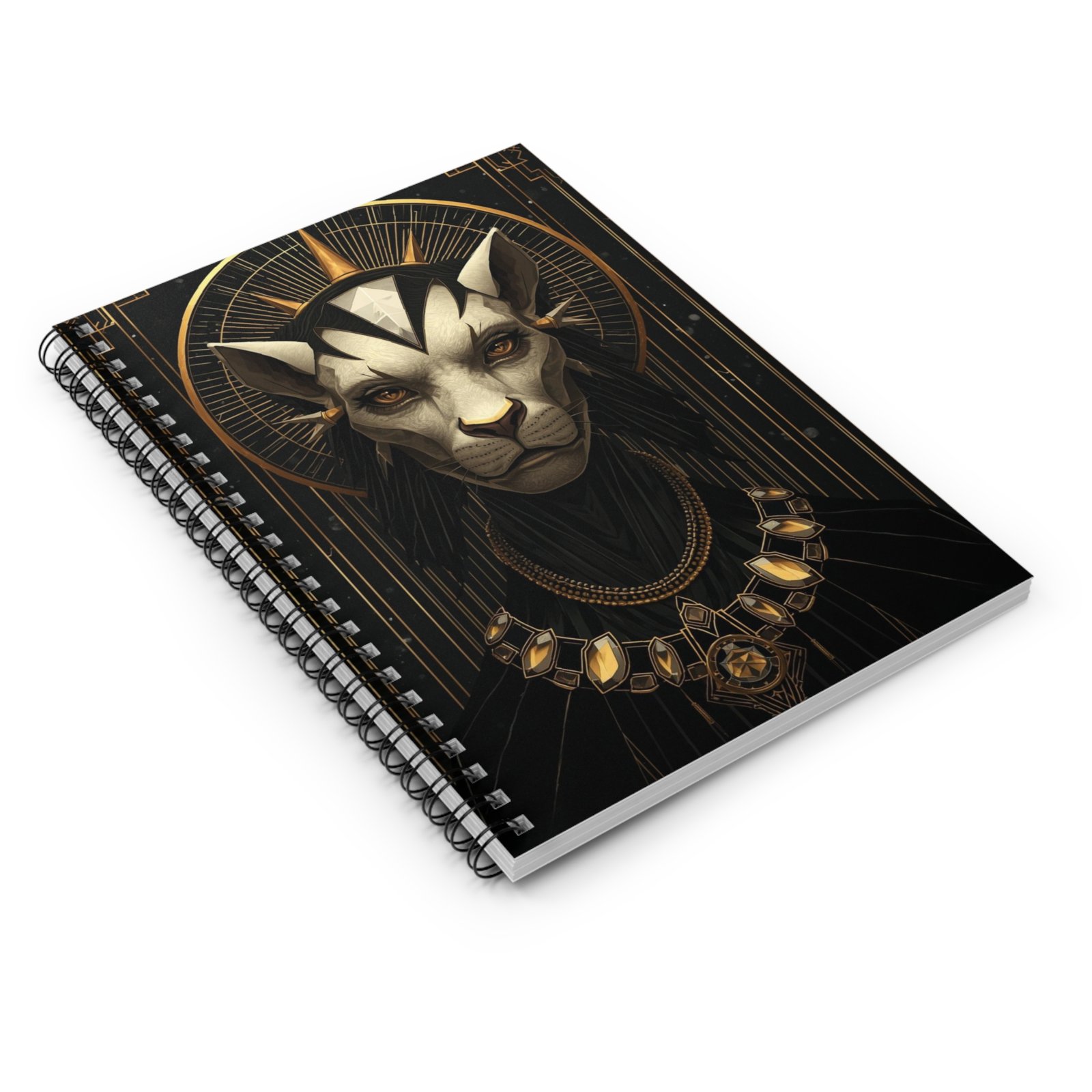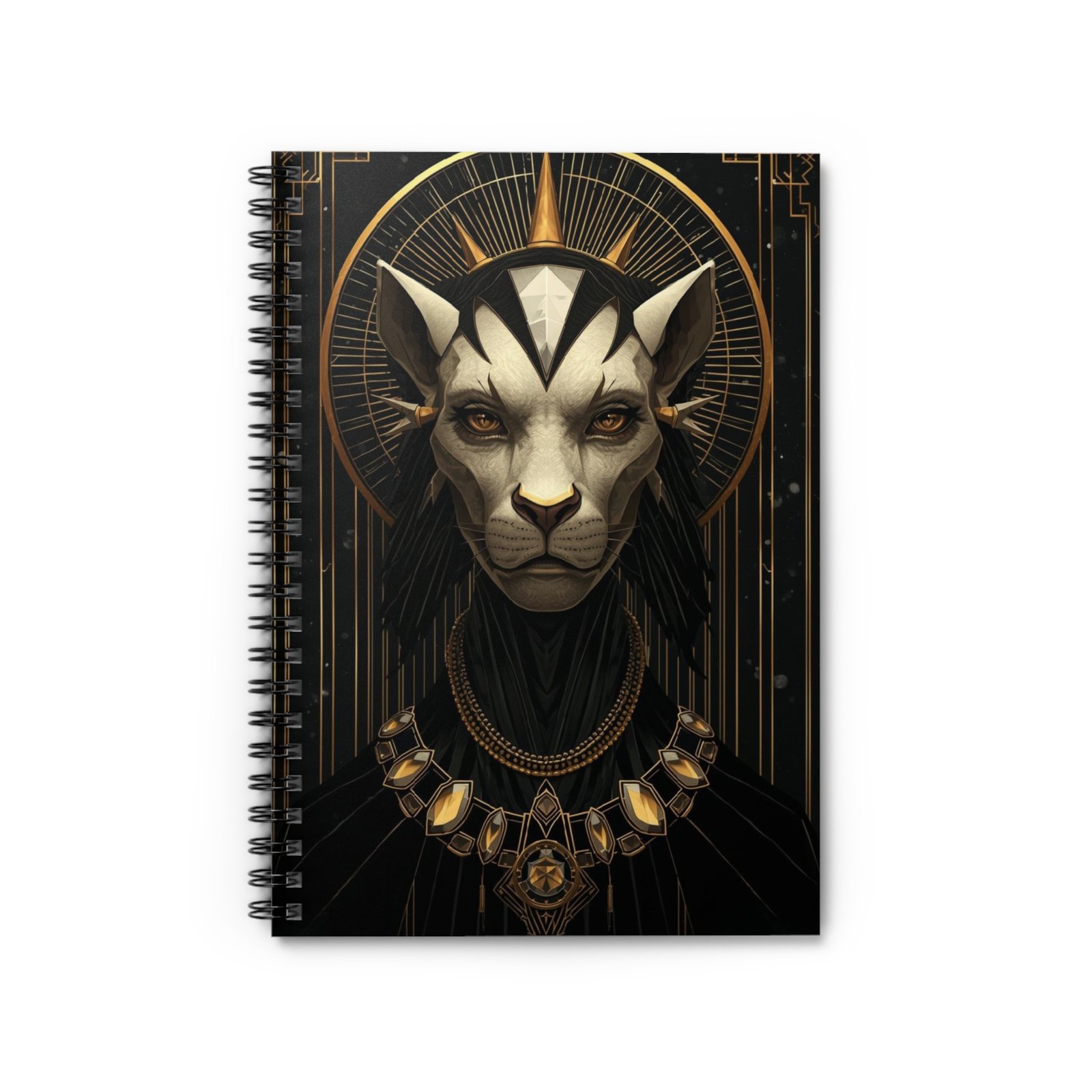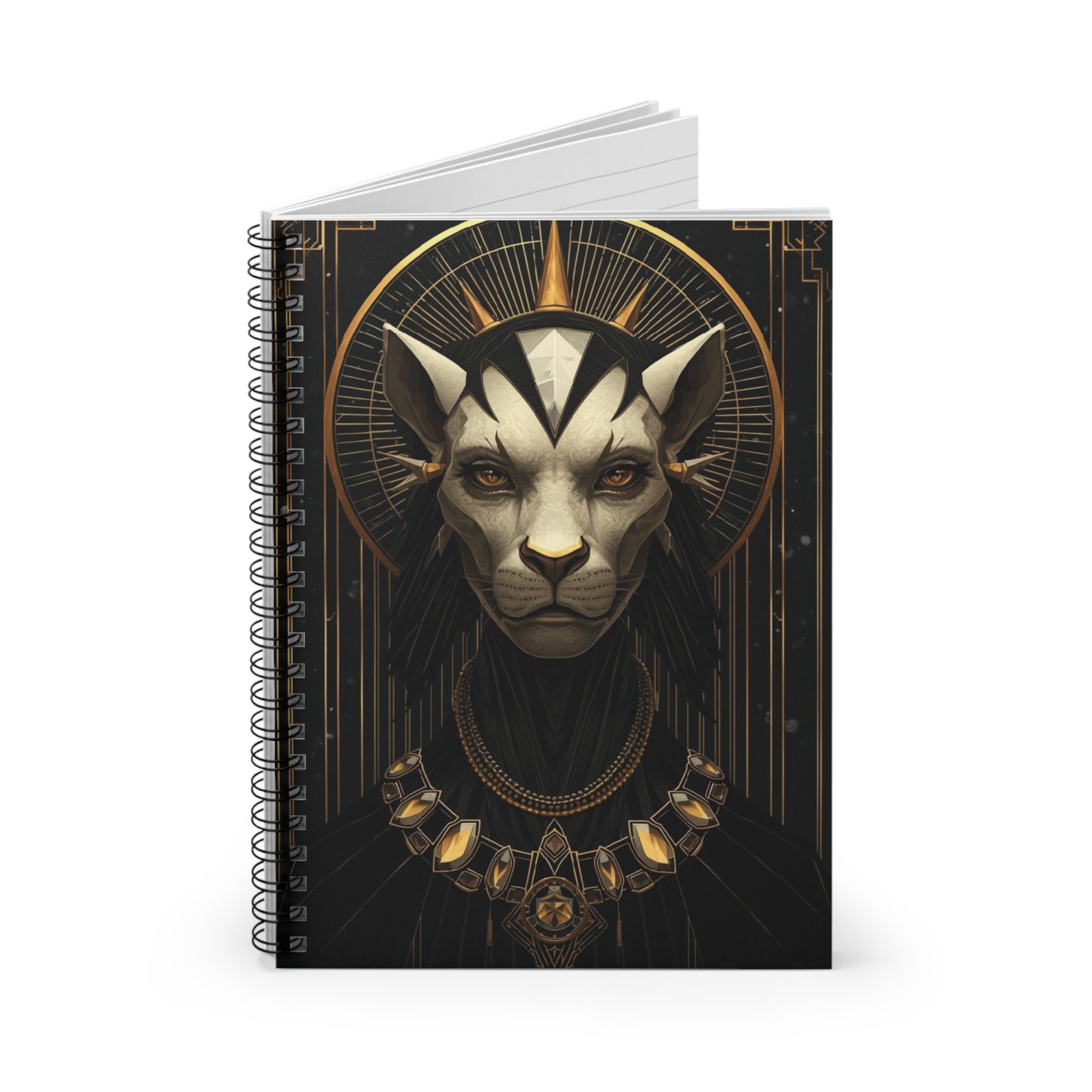 This ruled spiral notebook brings a bold, artful presence to everyday writing. The cover features a striking, regal feline portrait set against art-deco gold accents — a design that feels both mysterious and refined. At 6″ x 8″, it slips easily into tote bags and backpacks while offering sturdy 350gsm covers and 118 lined pages of smooth 90gsm paper for comfortable, confident handwriting. A metal spiral lets the notebook lay flat or fold back for quick notes, and an inside back document pocket keeps receipts, sketches, or loose pages safe. Use it as a journal for ideas, a sketchbook for ink studies, or a place to plan creative projects—its dramatic cover invites you to take your work seriously and with style.