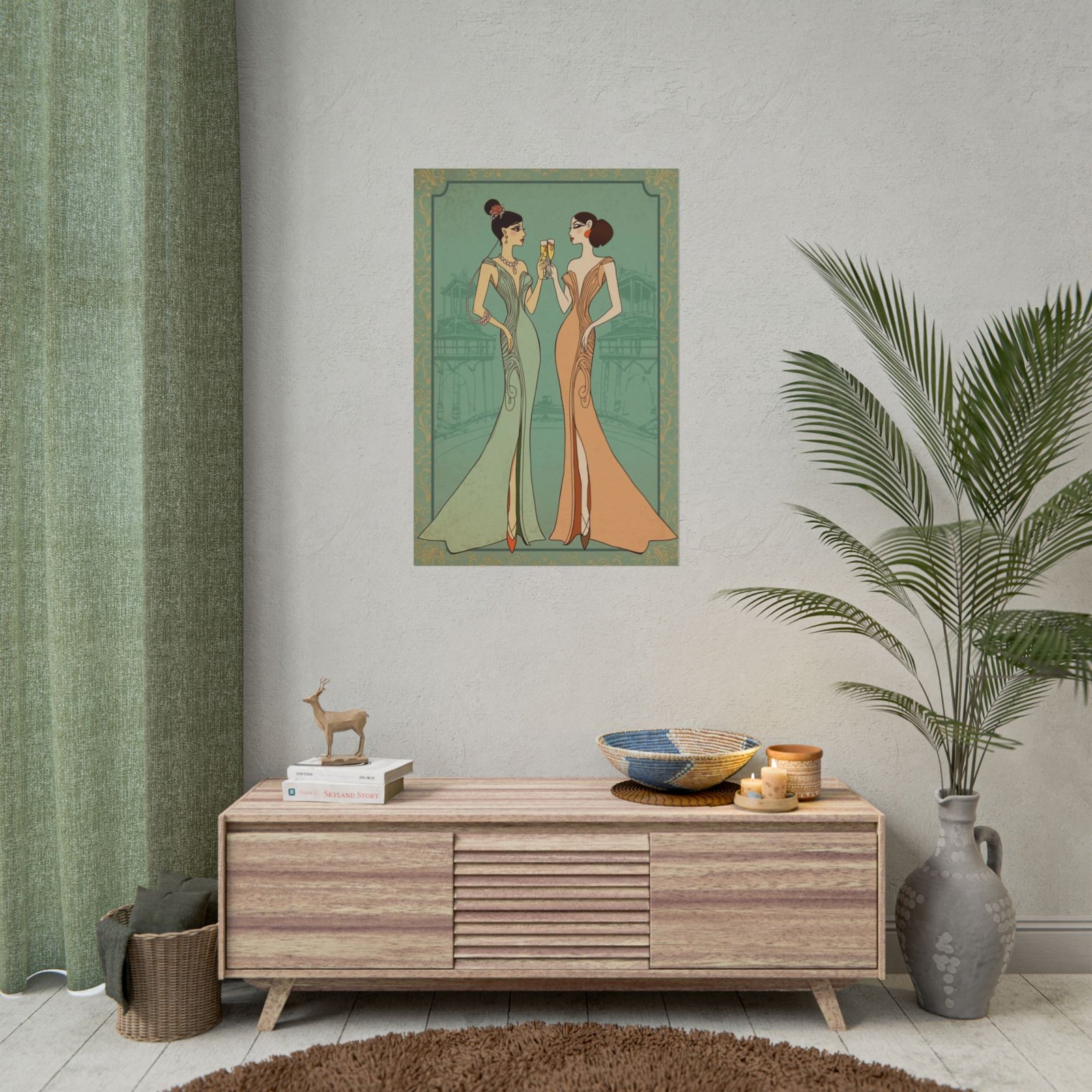 Two elegant figures raise flutes in a quiet Art Deco moment — soft champagne tones, flowing gowns, and delicate linework that feels like a page pulled from a 1920s salon. This rolled poster brings that intimate, vintage atmosphere into your space. Hung above a narrow console or leaned against a bookshelf, it quietly elevates a corner with old-world glamour and easy conversation-starting style. The muted teal background and warm apricot dress create a calming, sophisticated palette that pairs well with natural wood, brass accents, and velvet textiles.