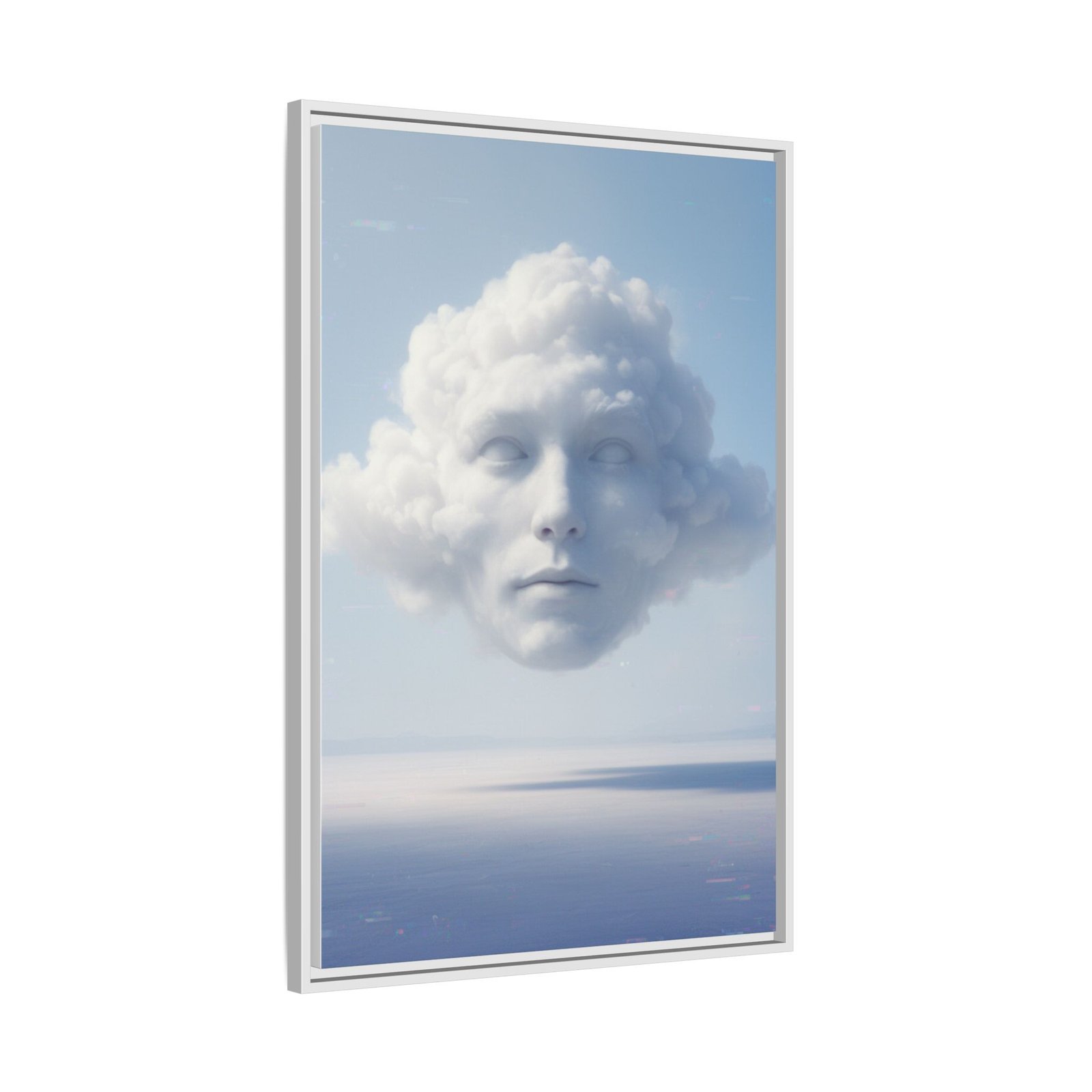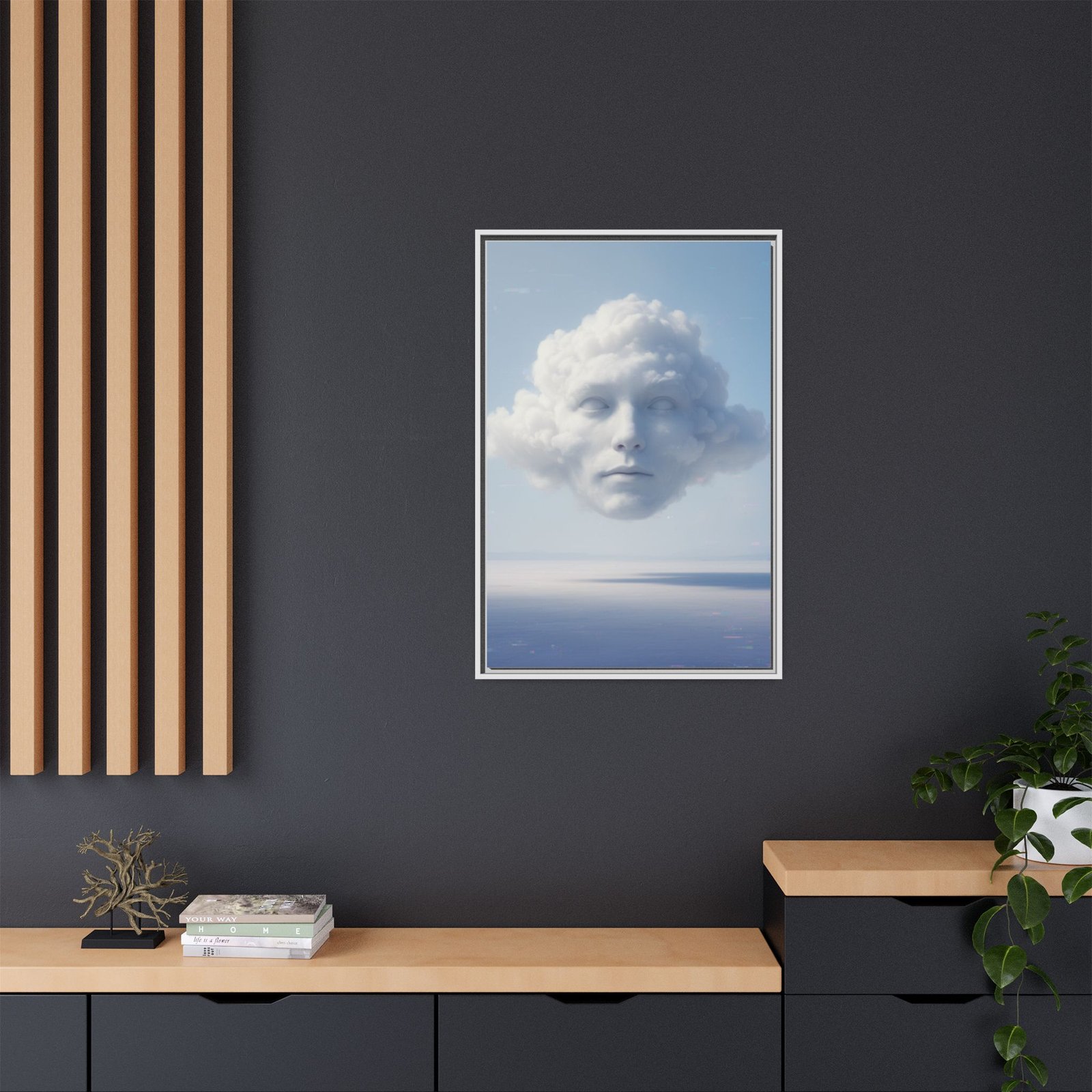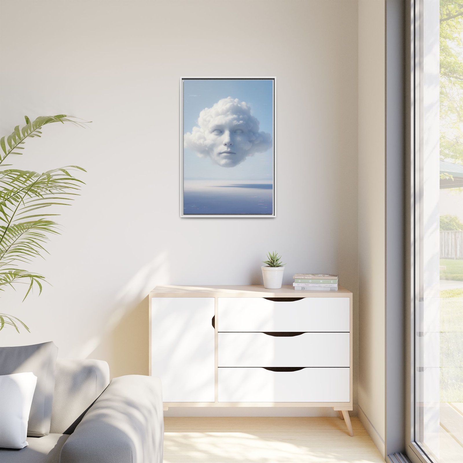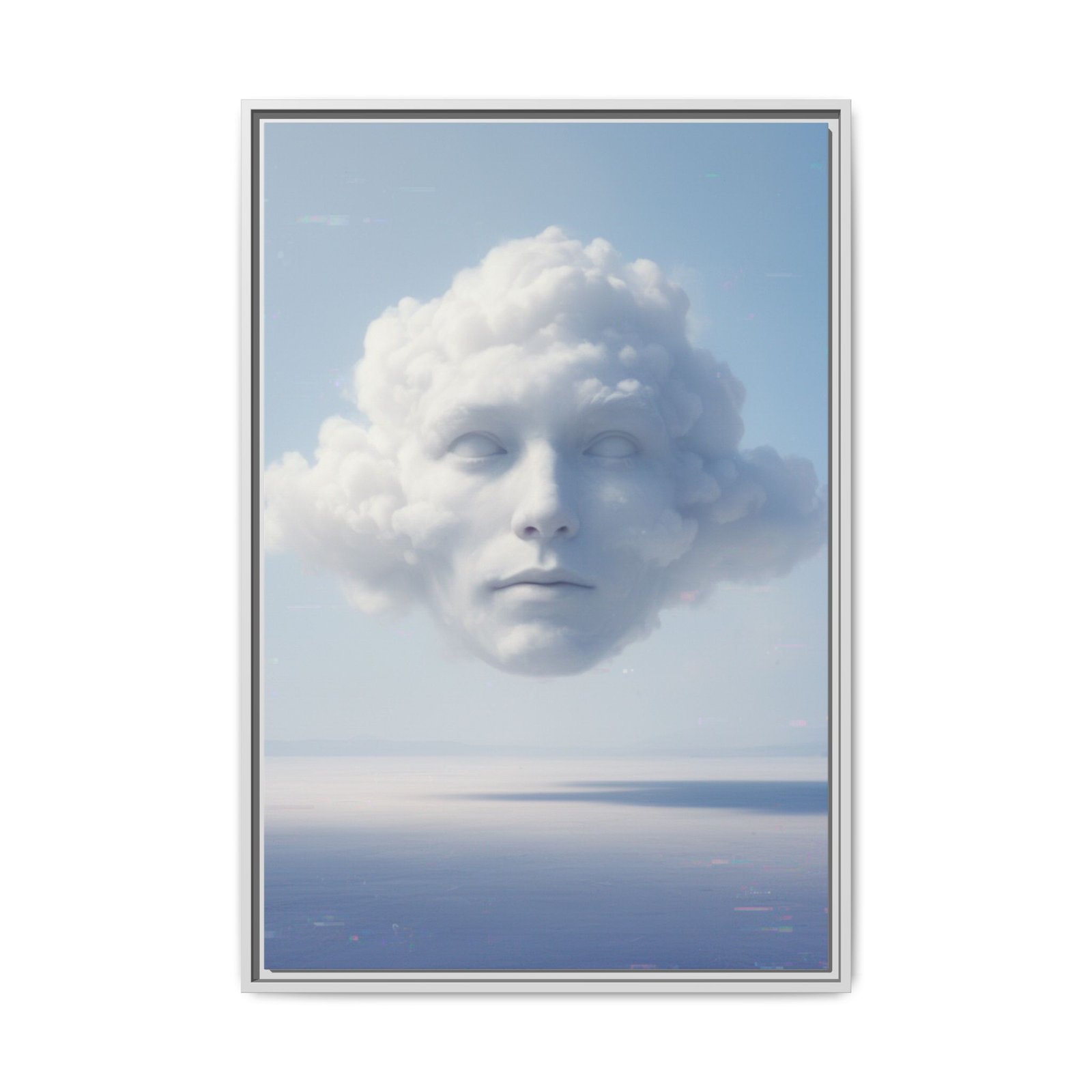 A matte canvas print framed in sleek pine that holds a quiet, surreal moment — a sculpted human face formed from clouds, hovering above a calm, sea-sky horizon. Soft blues and creamy whites draw the eye inward, offering a meditative focal point that calms a room and invites reflection. The fine matte finish mutes glare and enhances subtle tonal shifts, while the narrow pine frame gives a refined, gallery-ready look that suits modern, minimalist, and contemplative interiors. Hang it in a reading nook, studio, or above a bedside table to bring a gentle, dreamlike presence into everyday life.