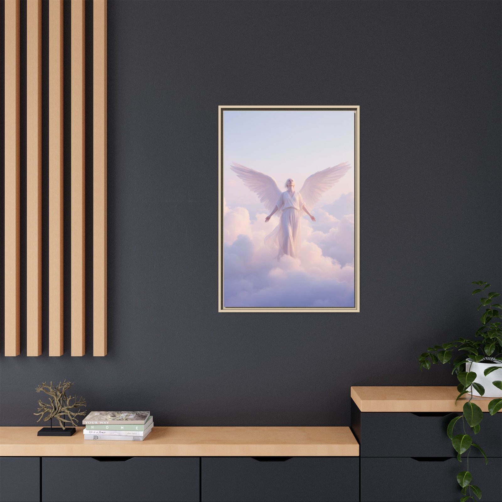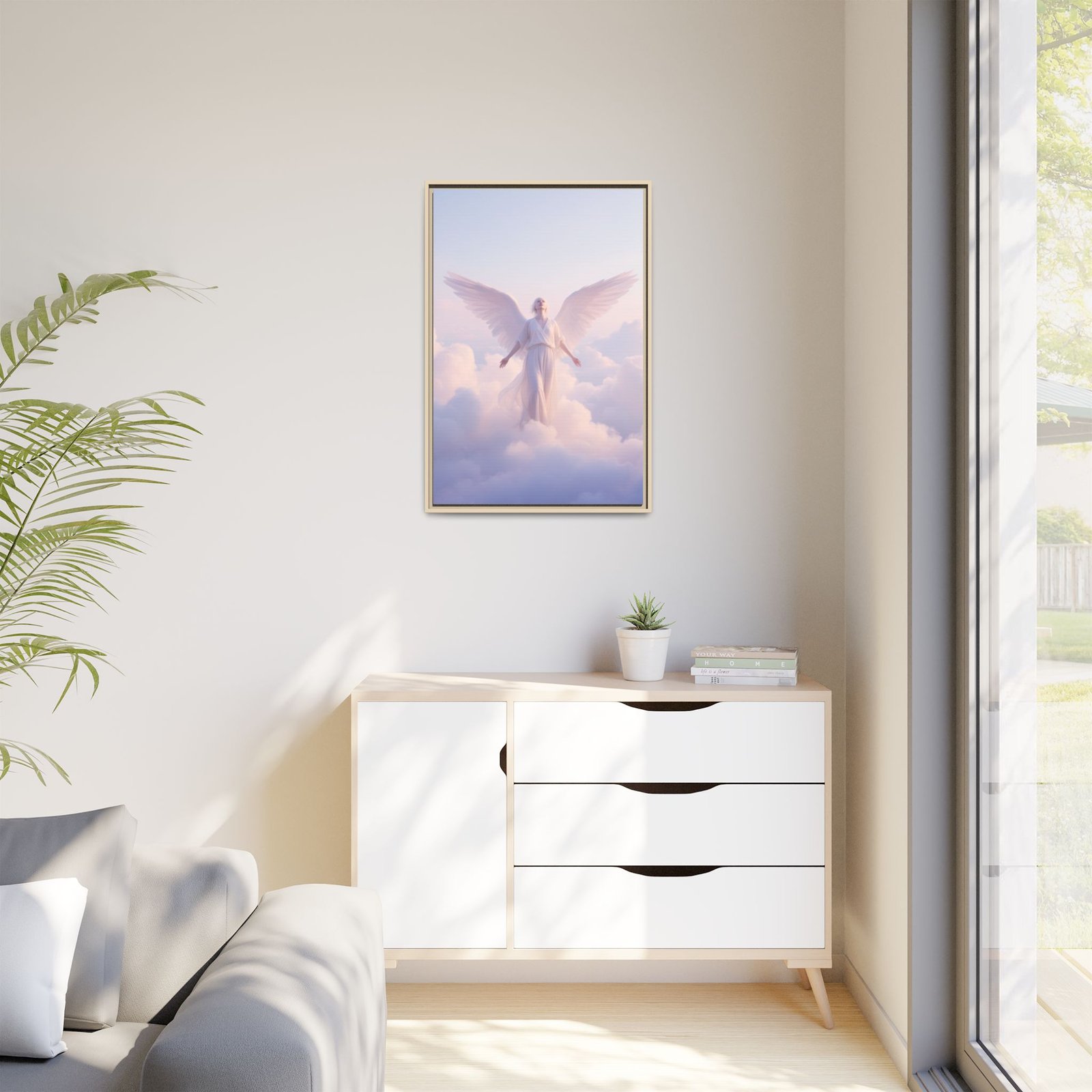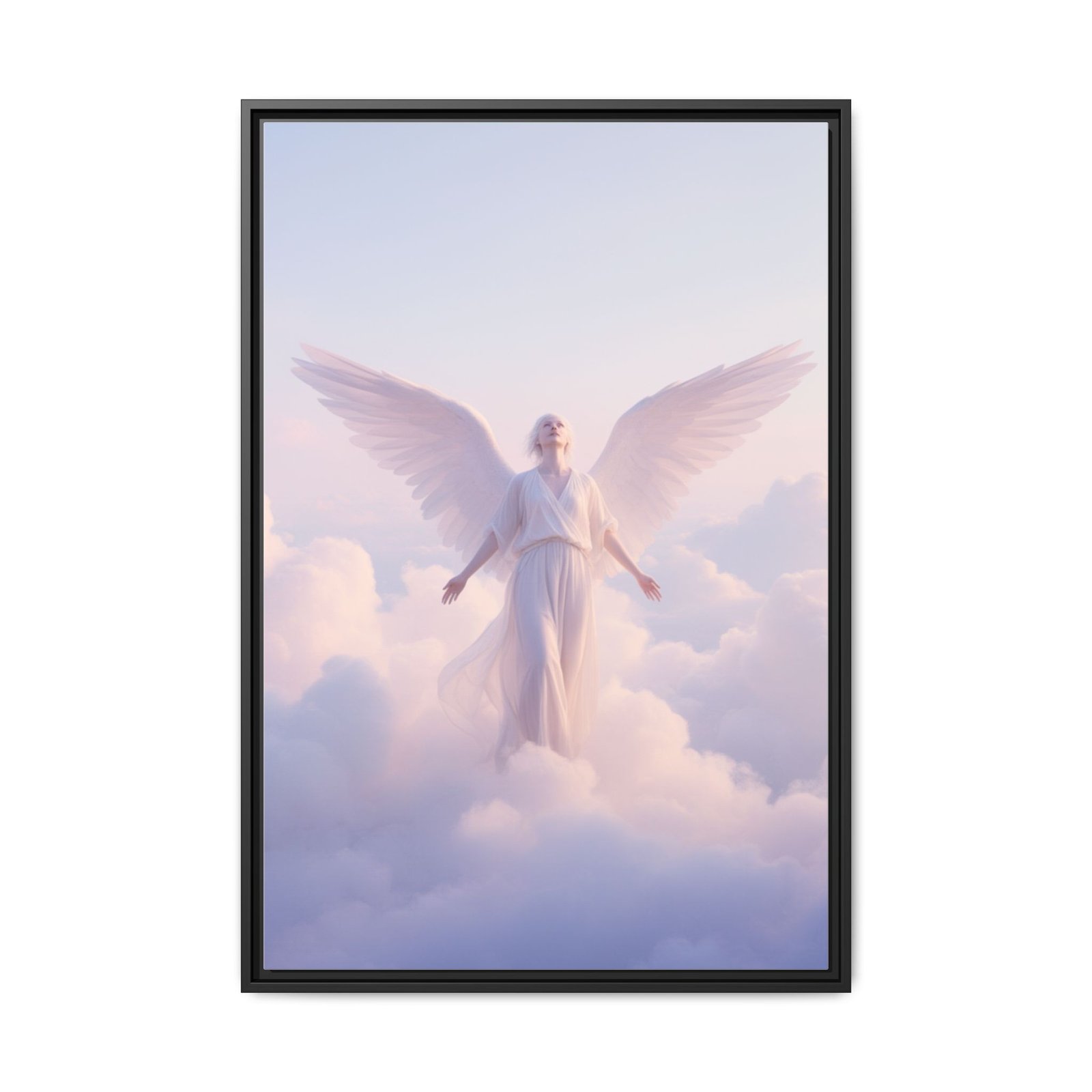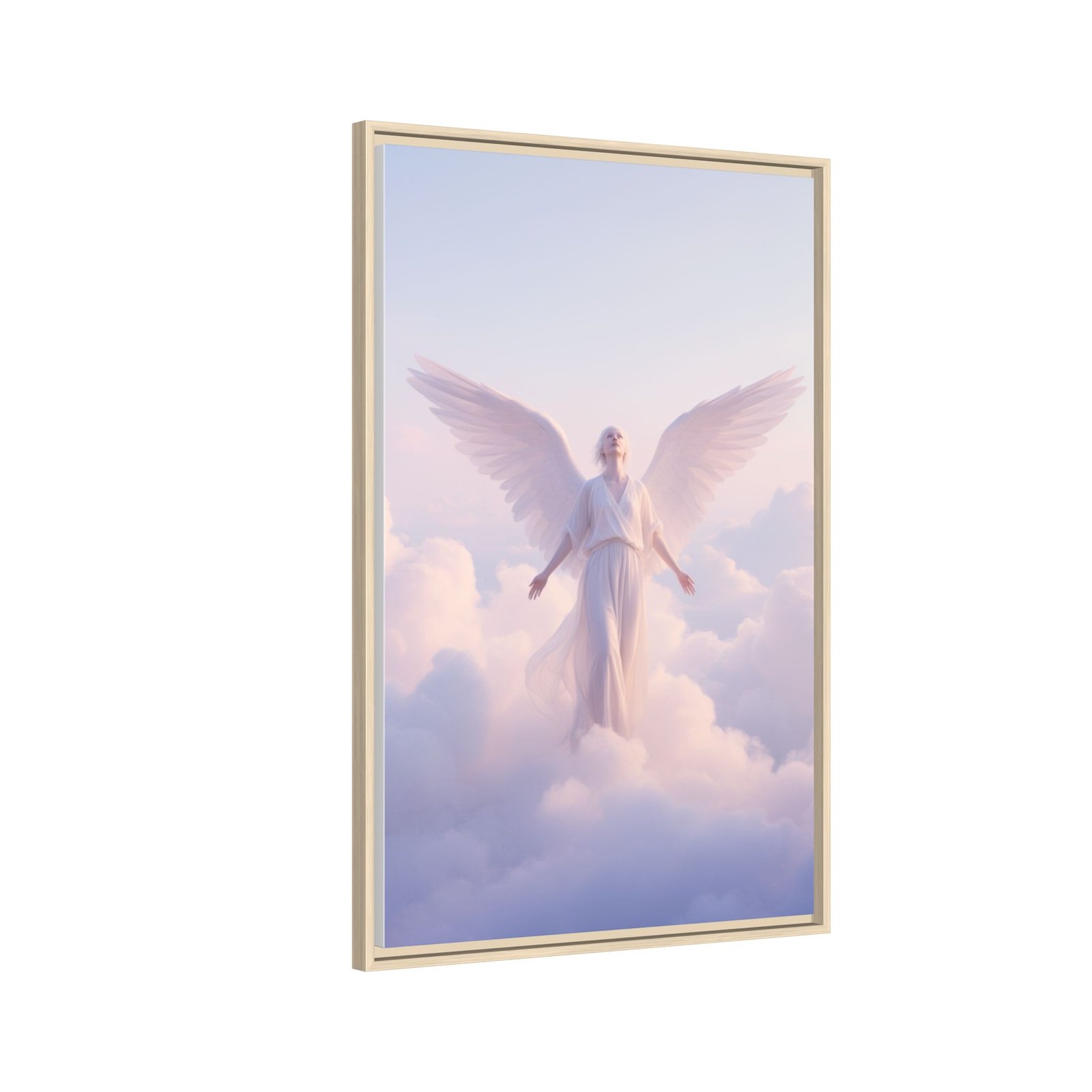 A serene matte canvas print, framed in slender pine, that brings a quiet, luminous presence to any room. Soft pastel clouds and a gentle angel figure float toward warm morning light, rendered in vivid, true-to-life color thanks to Greenguard Gold-certified inks. The textured canvas finish reduces glare and adds depth, while the slim frame gives a contemporary, gallery-ready look. Hang it above a bedside table or in a meditation corner to invite calm and reflection into daily life.
