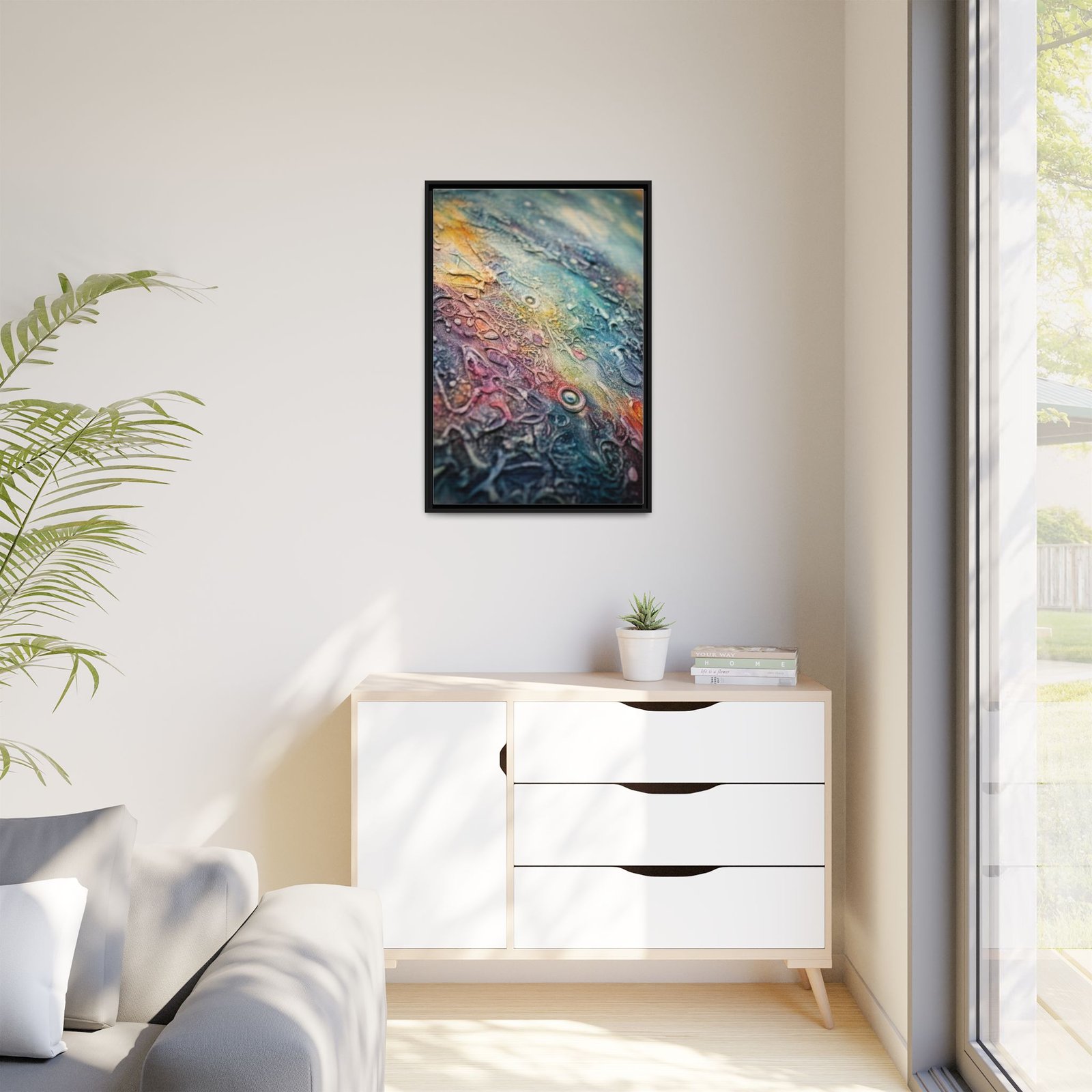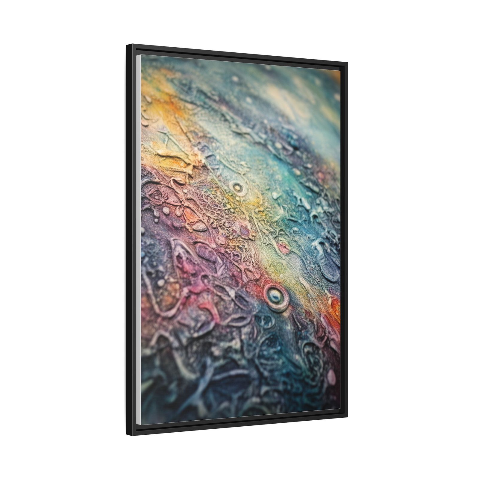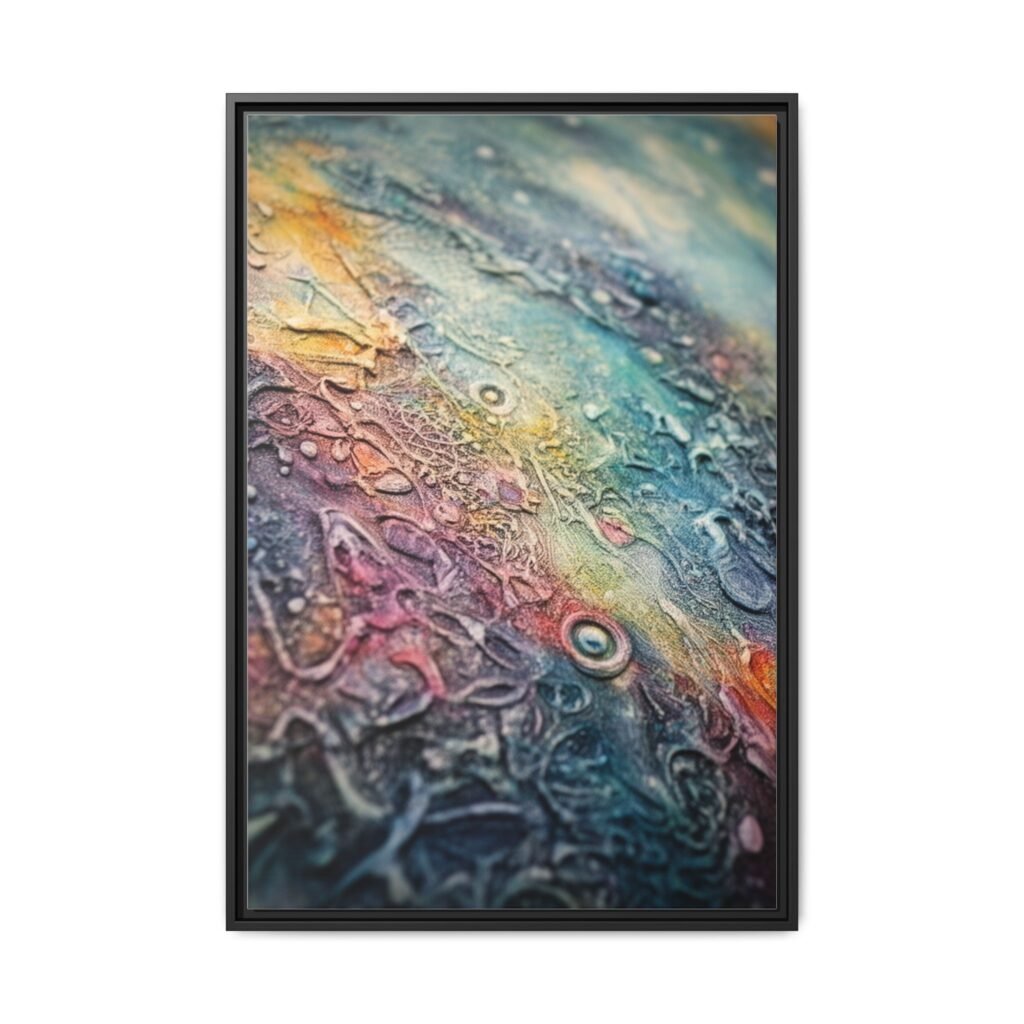 This framed matte canvas brings an intimate, tactile world into your home. Layers of color and texture ripple across the surface like a close-up of a living landscape — teal and amber mingling with soft magentas and inky shadows. The narrow pine frame keeps the focus on the artwork while giving it an earthy, gallery-ready presence on the wall. Hang it where you slow down: a reading nook, above a desk, or in a hallway that collects quiet moments. The print’s rich, durable coating and Greenguard Gold inks keep the tones vivid without glare, so the small details and subtle textures stay luminous over time.