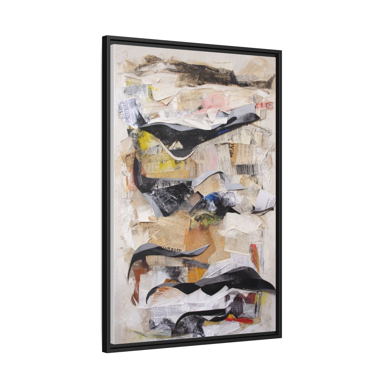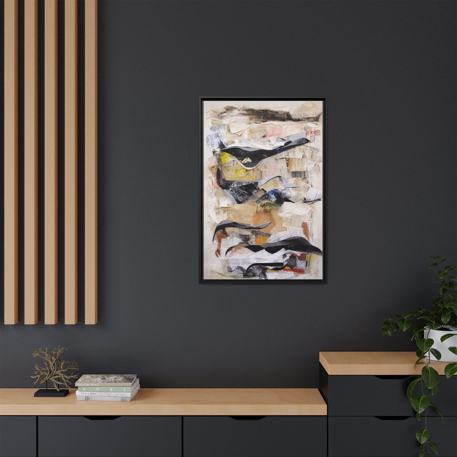 This framed matte canvas brings layered abstraction into your living space with a calm yet kinetic presence. Soft neutrals and muted pastels sit beneath bold, sweeping strokes of black and charcoal, creating depth and movement that reward a closer look. The slim pine frame gives it a contemporary, gallery-ready silhouette that complements minimalist, mid-century, or eclectic interiors. Hang it vertically to lead the eye upward in an entryway, beside a sofa to anchor a seating area, or in a bedroom to introduce quiet texture and understated drama.