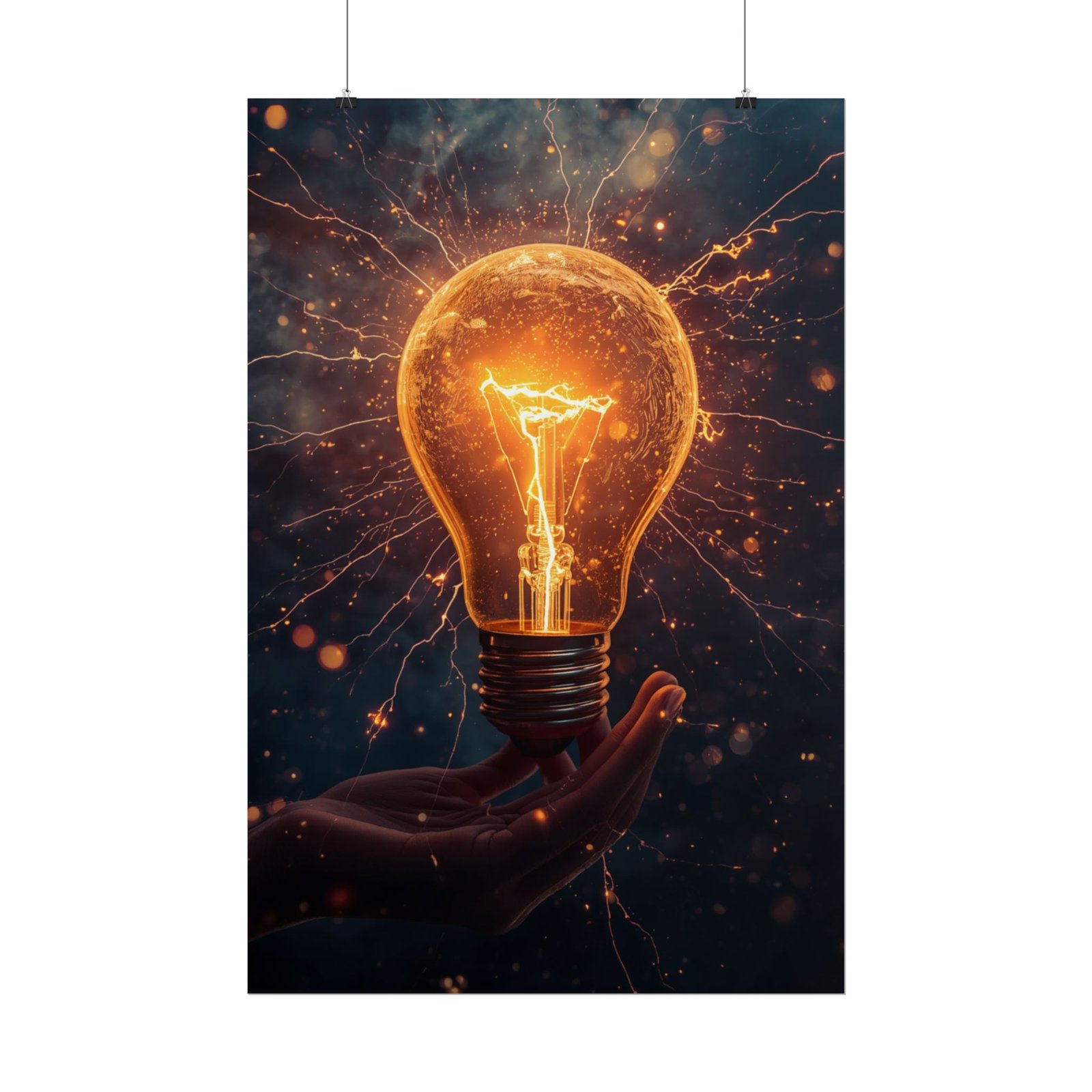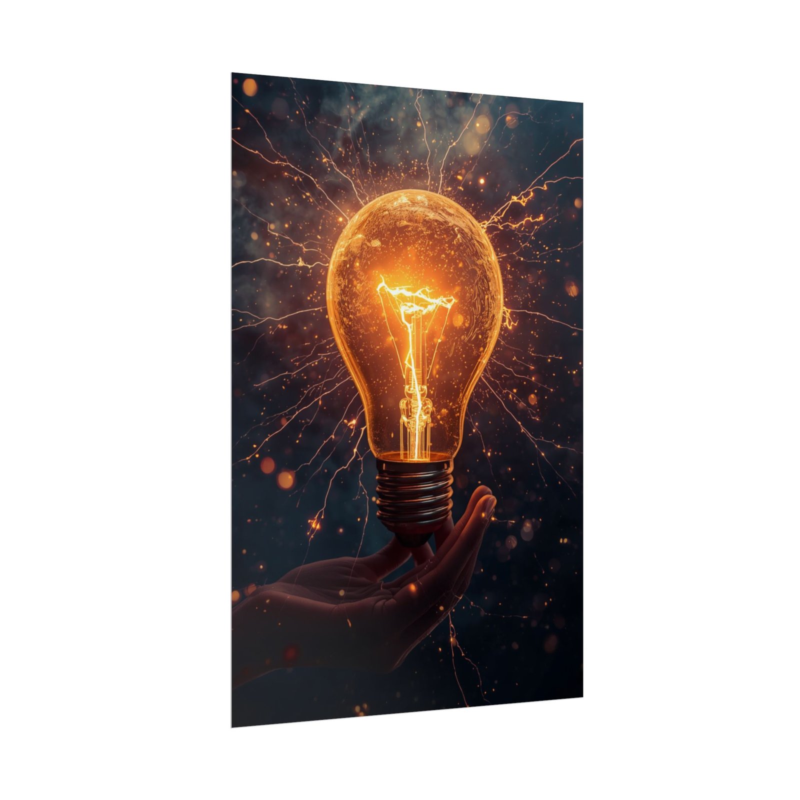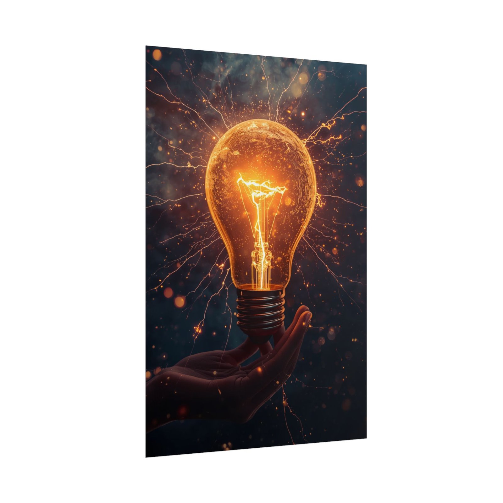 Electric Sparks presents a glowing light bulb cradled in a hand, its filament alight and electric tendrils radiating into a deep, moody background. Warm amber illumination contrasts with shadow, emphasizing the glass’s texture and the dynamic web of sparks. The composition conveys sudden creativity and forward motion, pairing an intimate human touch with energetic force. A striking focal point that brings warmth and momentum to a workspace or living area.