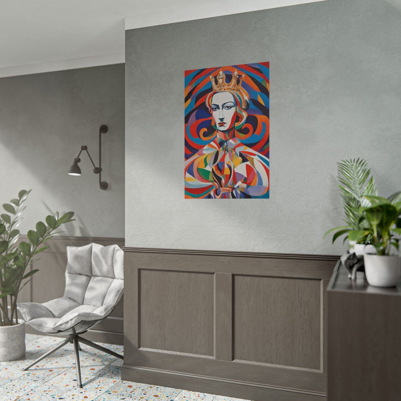 Rolled poster art that brings bold color and quiet authority into a room. This print shows a crowned figure rendered in sweeping, layered shapes and saturated hues — a modern, painterly portrait that feels both regal and contemporary. Hung above a mantel, leaned against a bookshelf, or framed for a gallery wall, the piece changes a space with its movement and color temperature. Choose matte or semi-glossy photo paper for a cleaner, sharper finish. The result is a statement piece that reads like a conversation starter and settles into the room as something intentional and deeply felt.