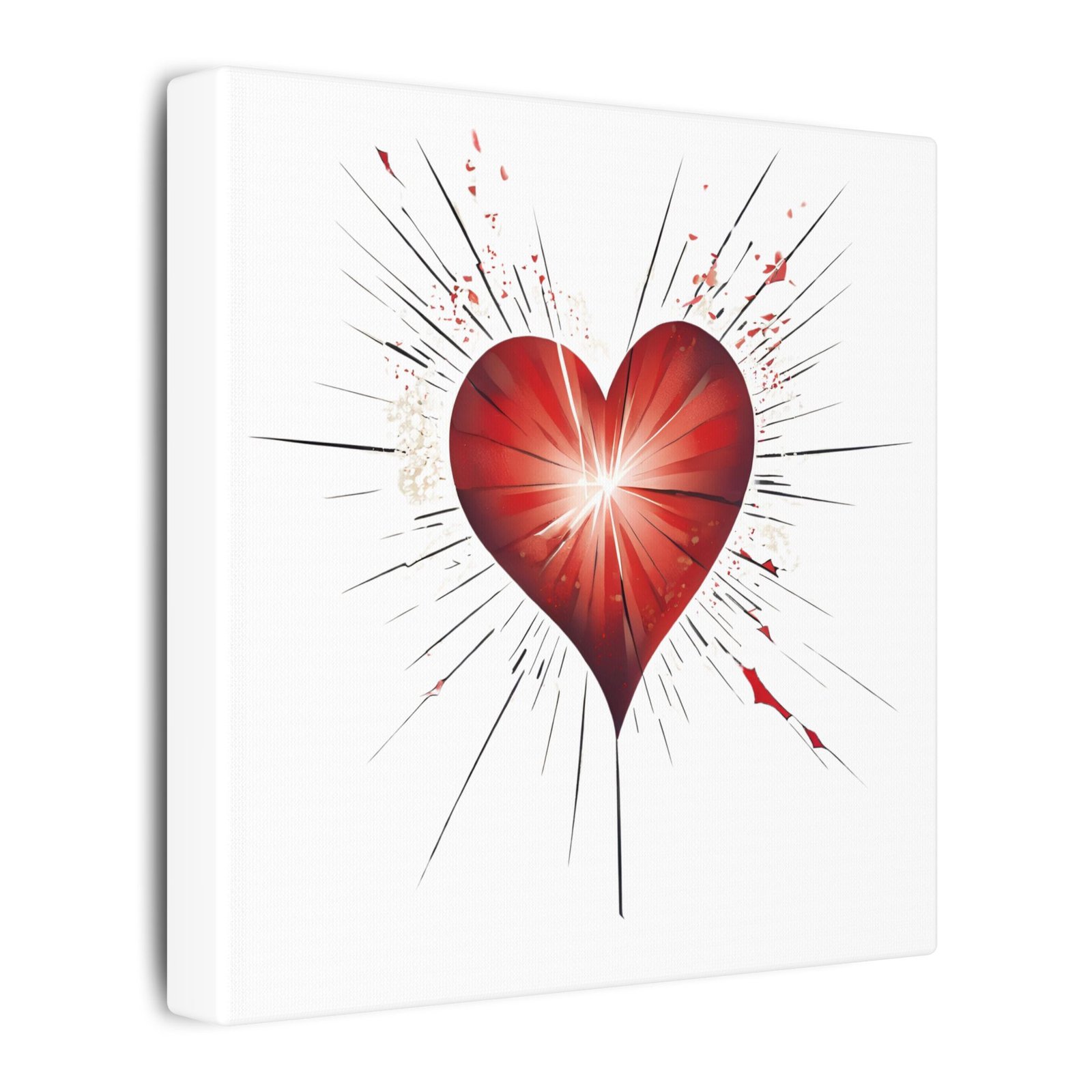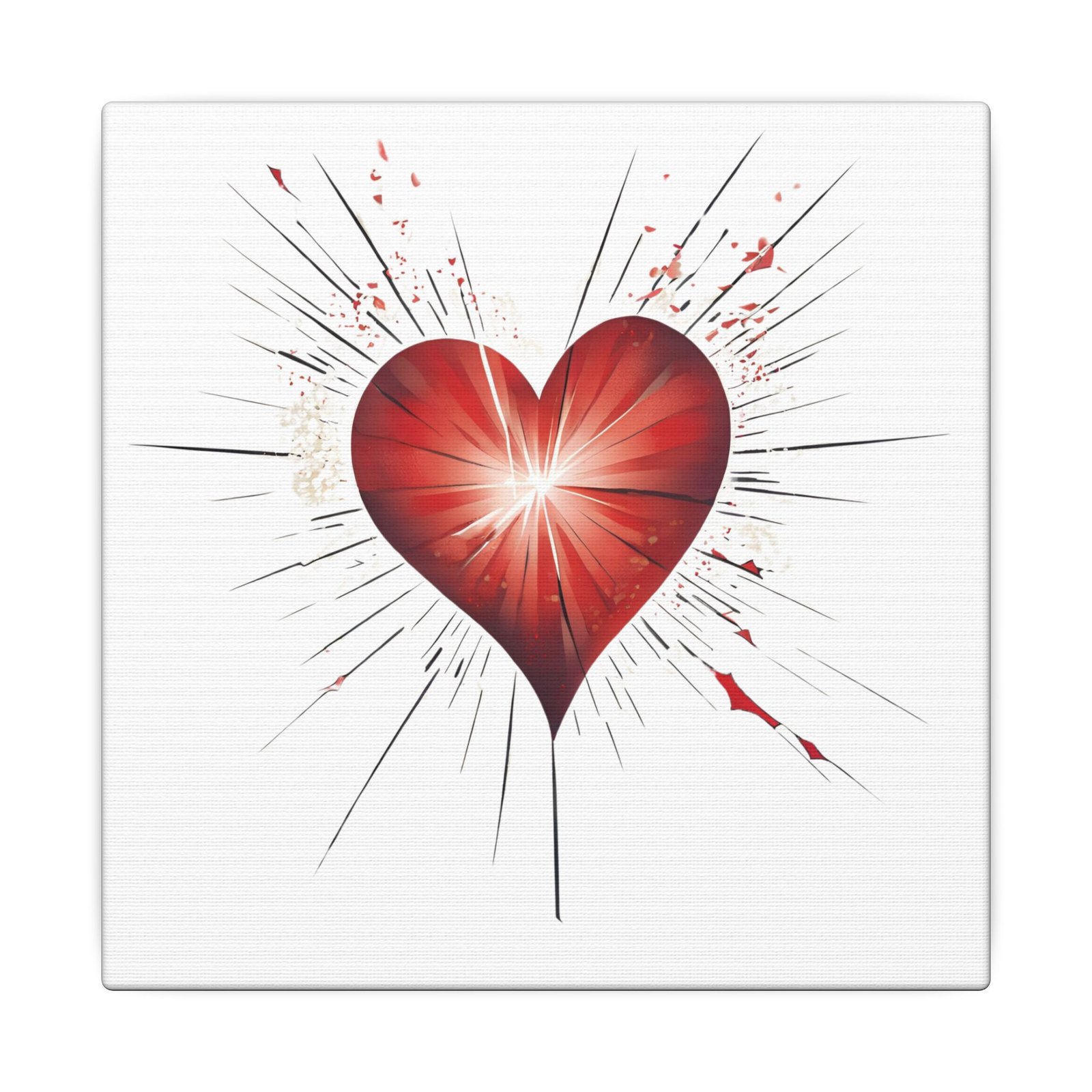 A stretched matte canvas printed with a bold red heart design that seems to pulse outward — sharp rays and subtle splatters give it an edgy, contemporary feel. The clean white background makes the artwork feel luminous and modern while the deep red center draws the eye and invites emotion. This canvas brings gallery-quality finish and lasting color to a living room, bedroom, studio, or cozy nook. It’s light enough to hang on a variety of walls yet built to last, adding an expressive, handcrafted touch to any room.