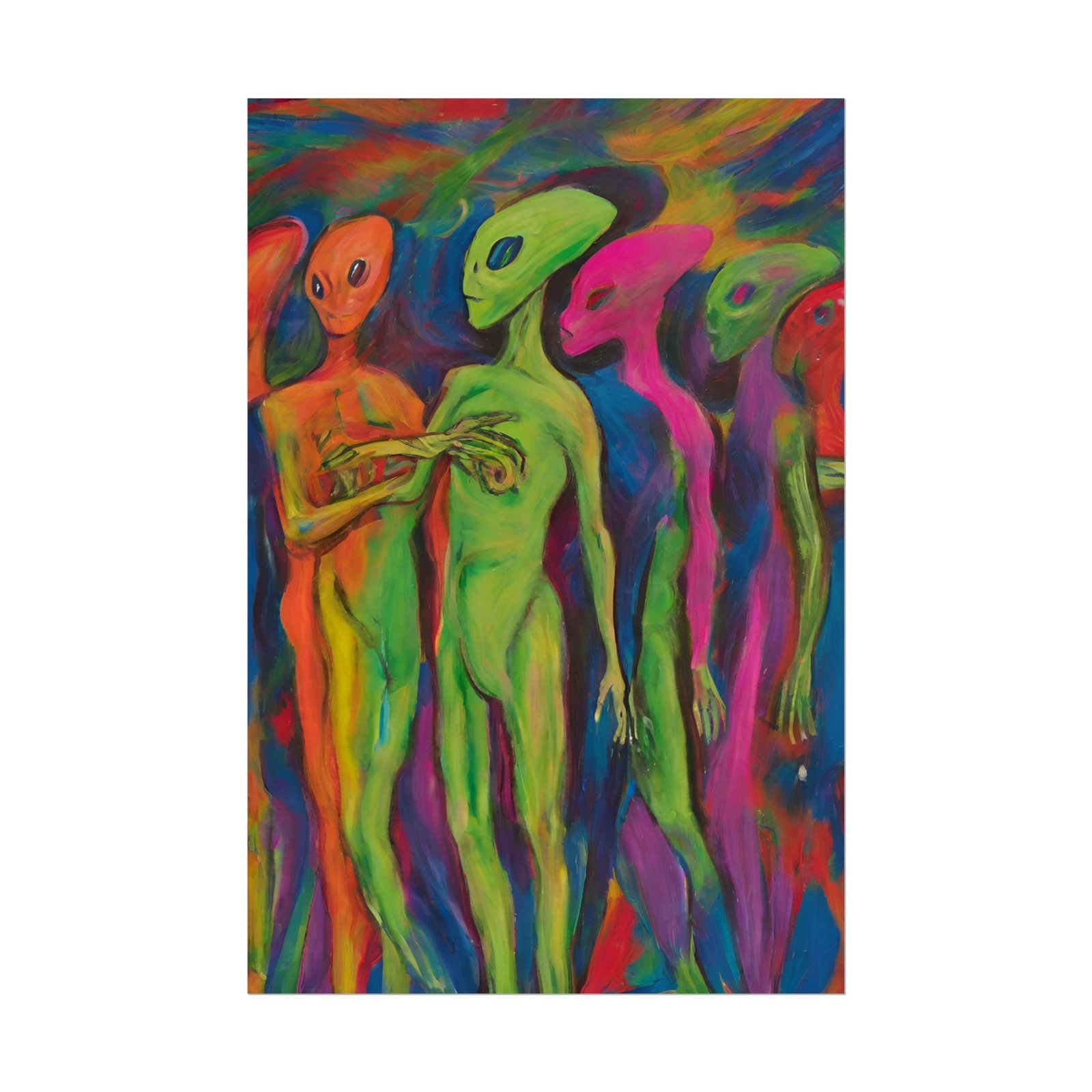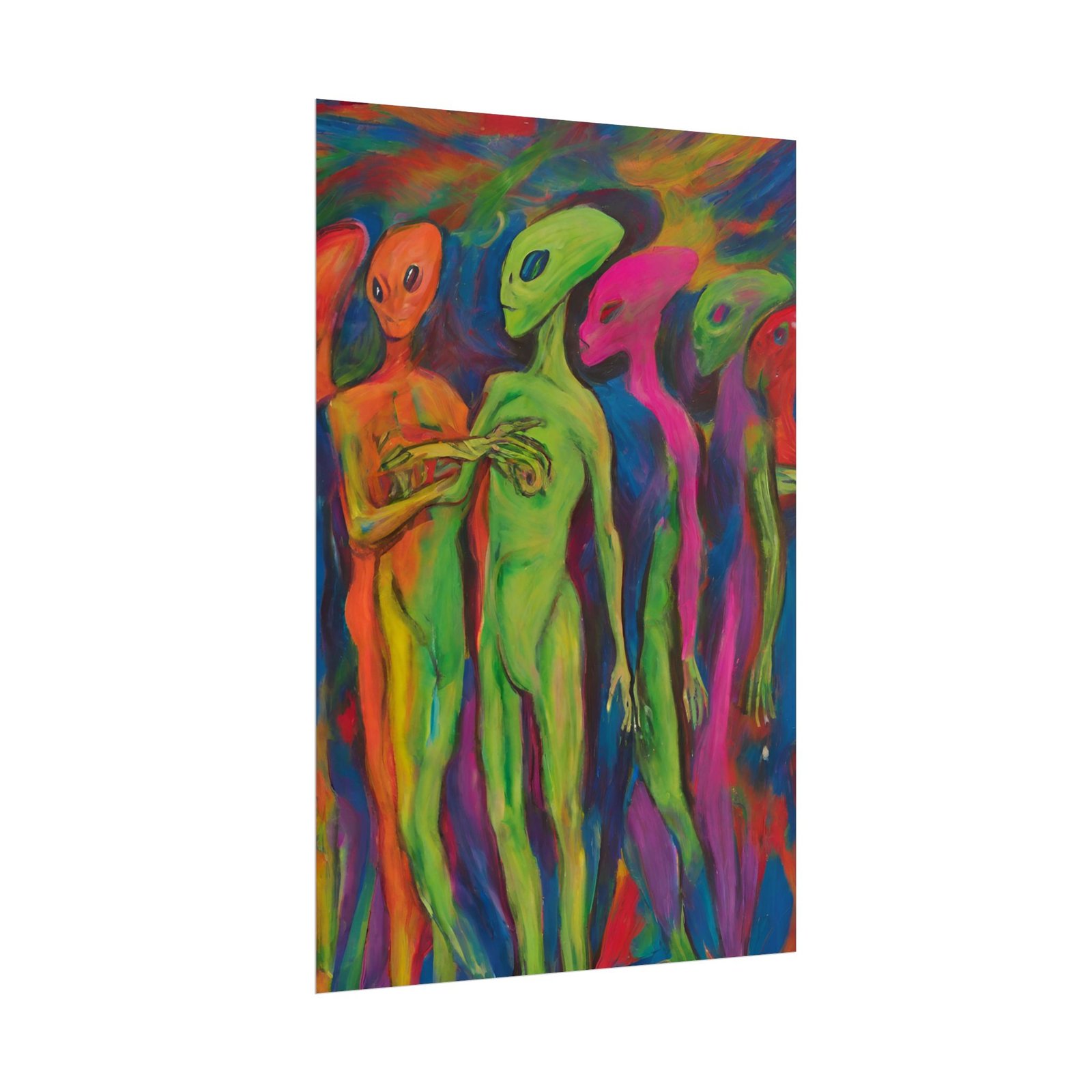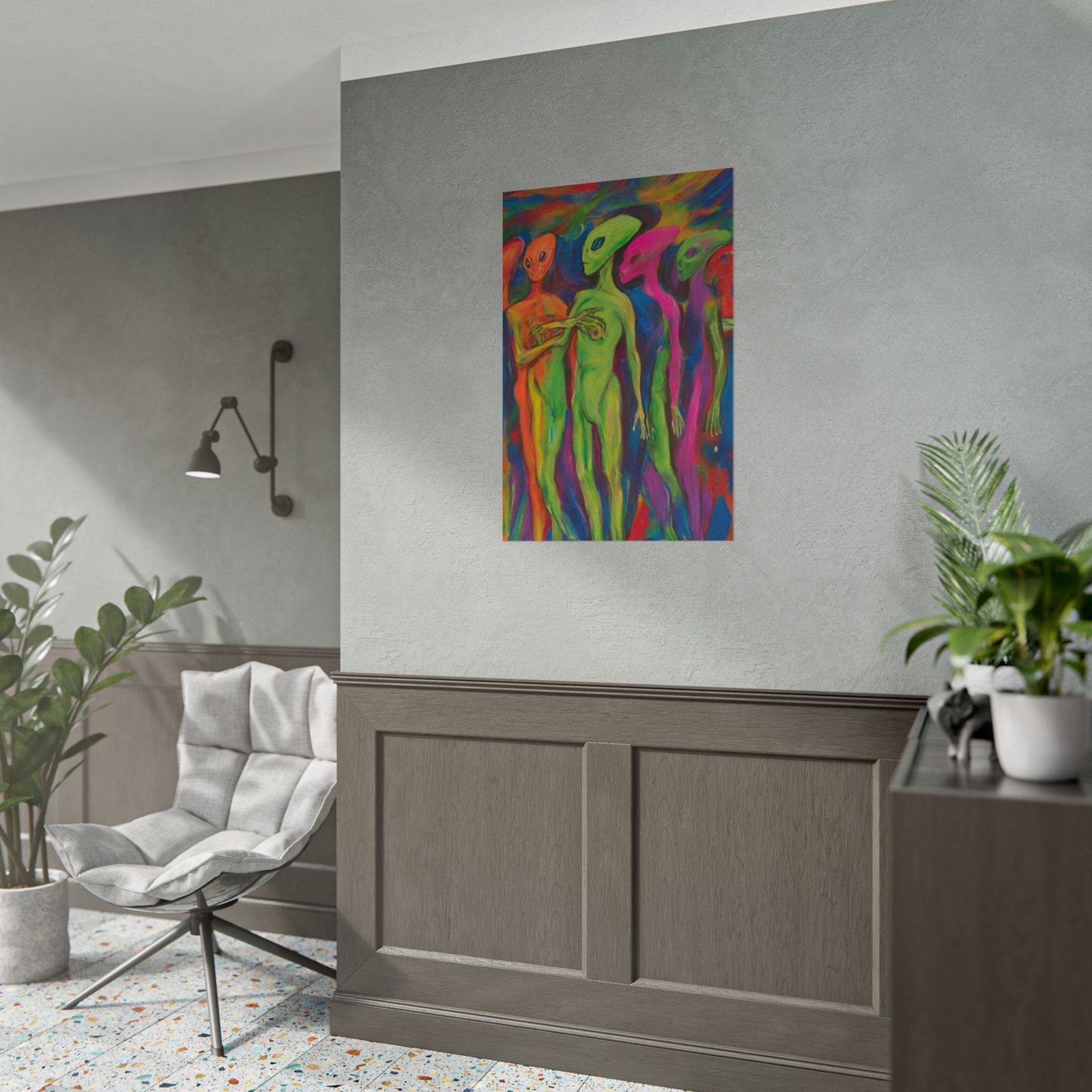 A vibrant art print that hums with otherworldly energy. Bold, saturated pigments bring a line of elongated figures to life — neon greens, hot pinks, and deep blues ripple across textured paper, creating movement and a quiet tension. Hung in a living room, studio, or hallway, this rolled poster becomes a conversation point: a strange, intimate scene that rewards close viewing. The two paper options let you choose how the color lands — from velvety archival texture to a crisp satin finish — so the piece reads exactly as you want it in your space.