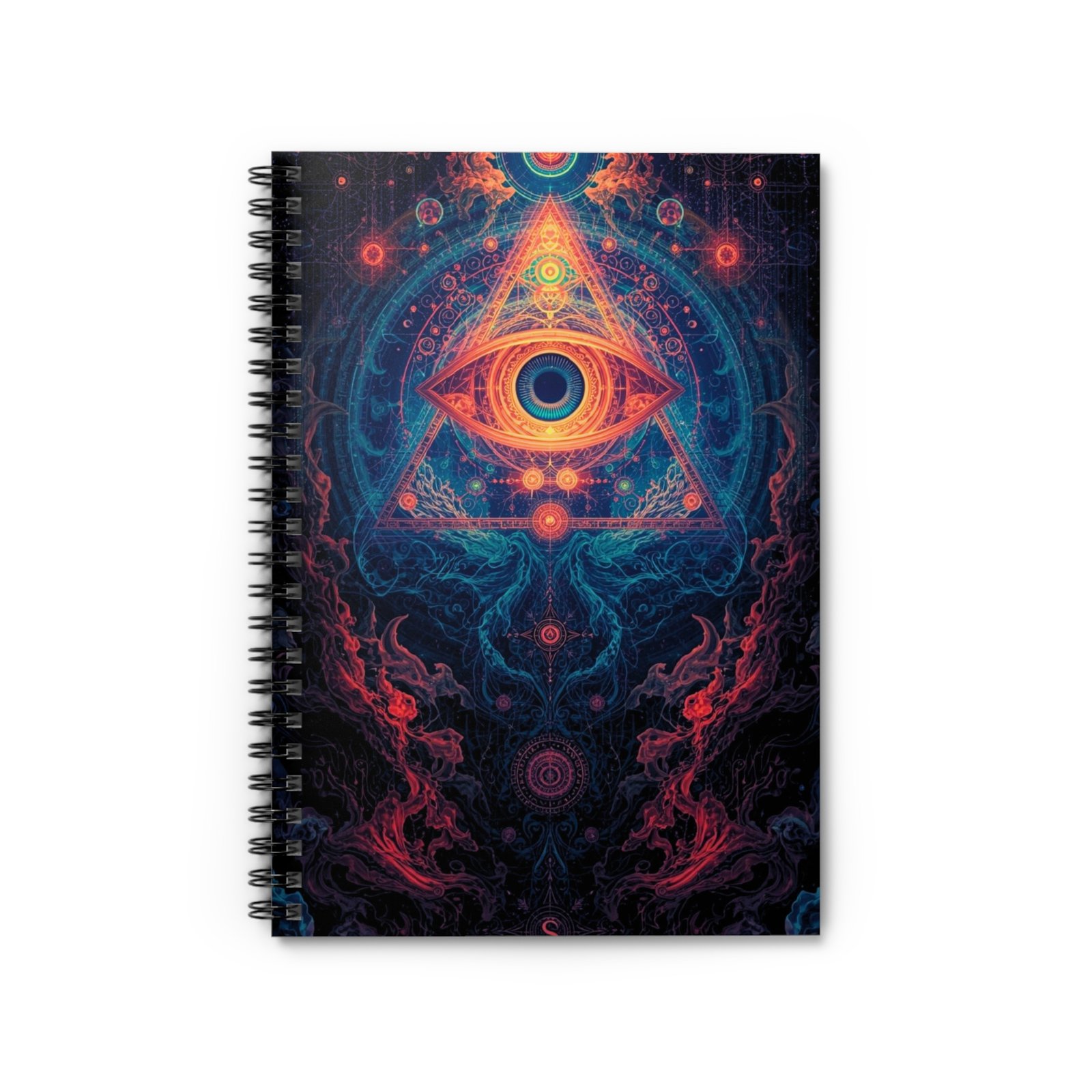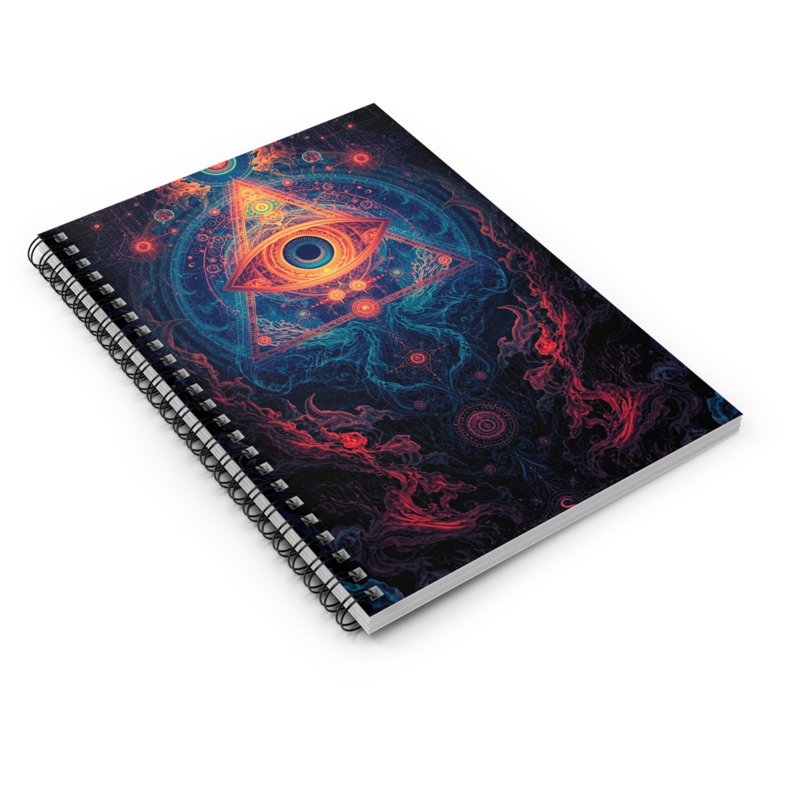 Deep, vivid art meets everyday writing. This 6″ x 8″ spiral notebook carries a mesmerizing, cosmic-eye illustration across the front cover โ colors that glow like embers and nebulae. The metal spiral lies flat as you write, while 118 ruled pages of smooth 90gsm paper invite steady handwriting, journal entries, sketches and lists. A dark grey back cover keeps the look grounded, and an inside document pocket tucks loose notes or receipts out of the way. Small enough to slip into a tote yet substantial enough to last through a semester of ideas, it becomes the quiet companion for late-night thoughts, studio scribbles, or ritual sketching.