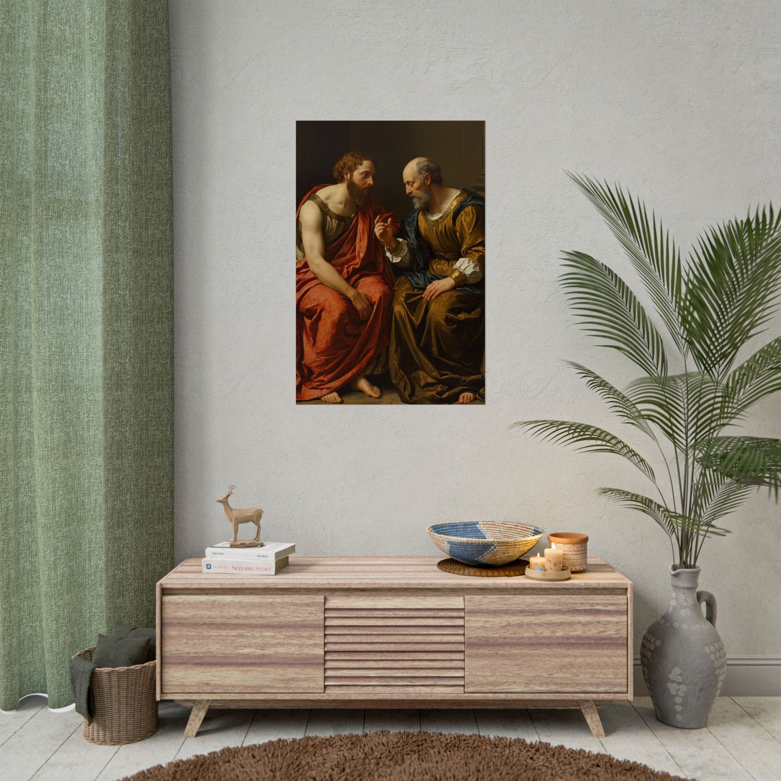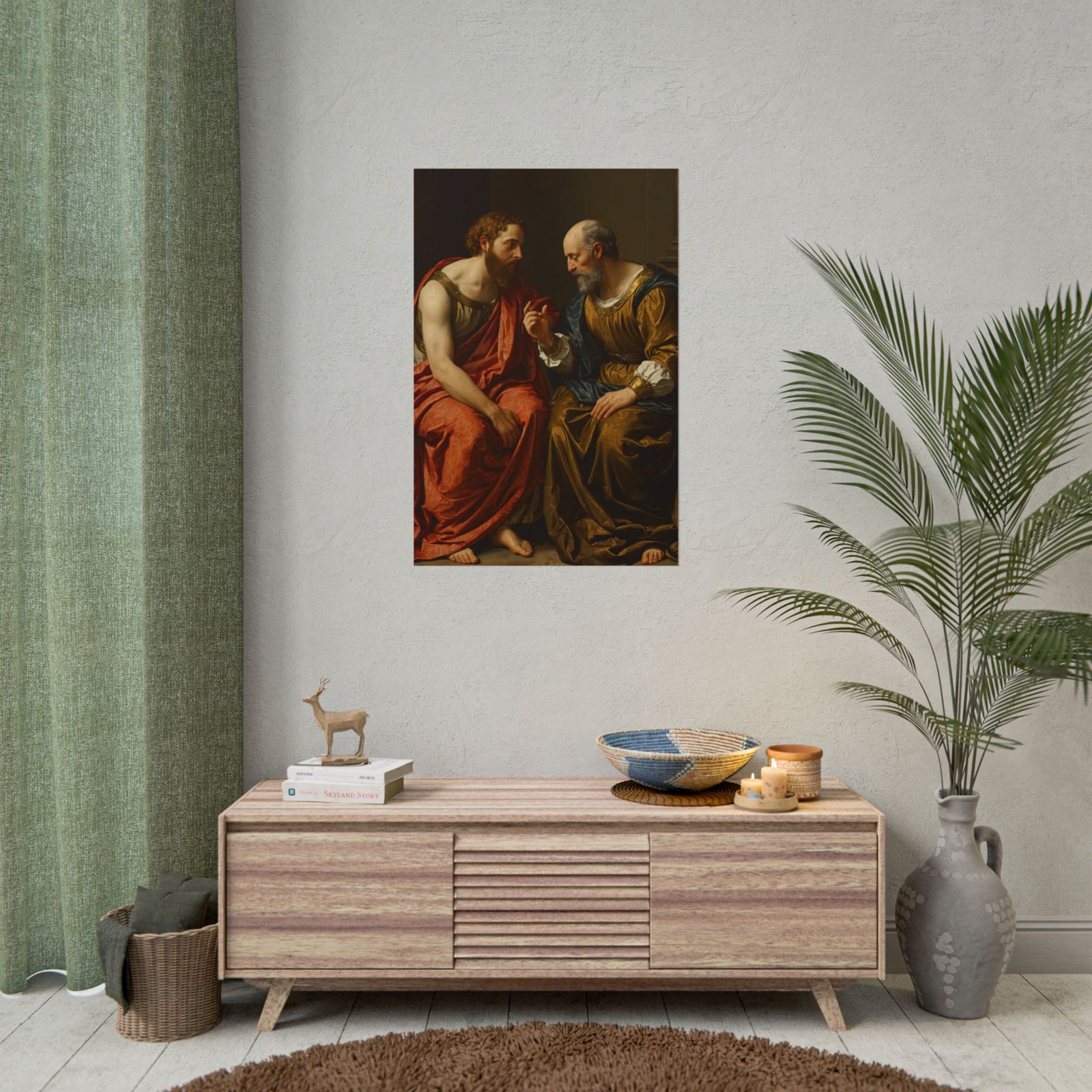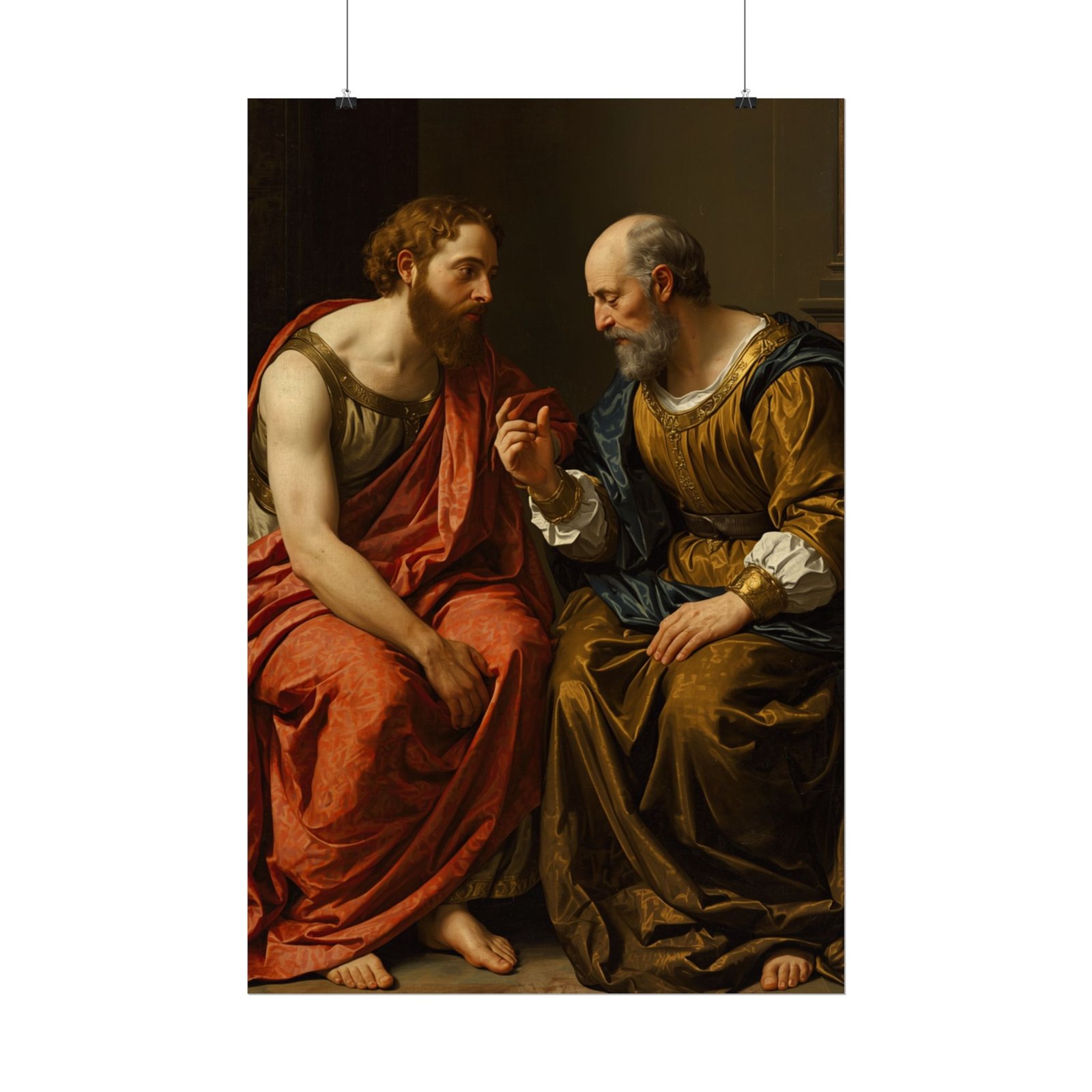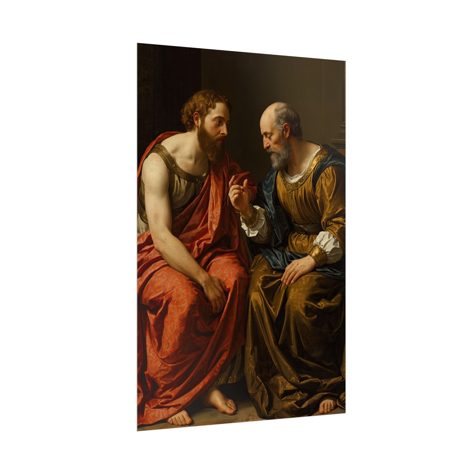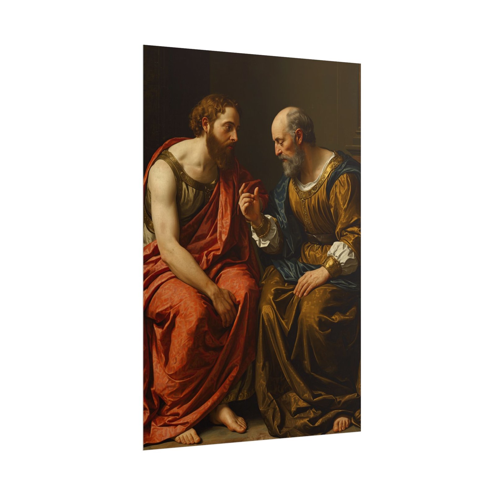 “The Dialogue” presents an intimate moment between two figures immersed in deep conversation, their expressions and gestures revealing the weight of their dialogue. The rich, flowing garments showcase intricate textures and a harmonious interplay of warm and muted tones. The detailed rendering of their faces and hands conveys a strong sense of realism and emotional depth. A refined addition to any collection seeking thoughtful and classical artistry.