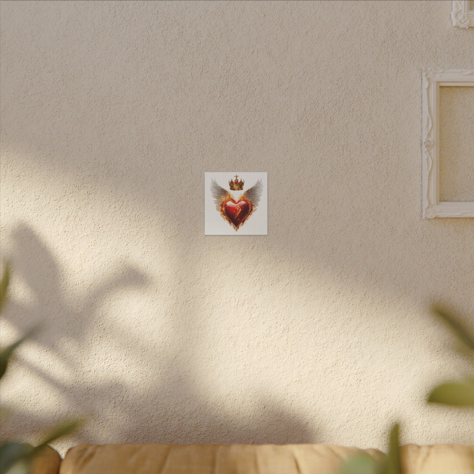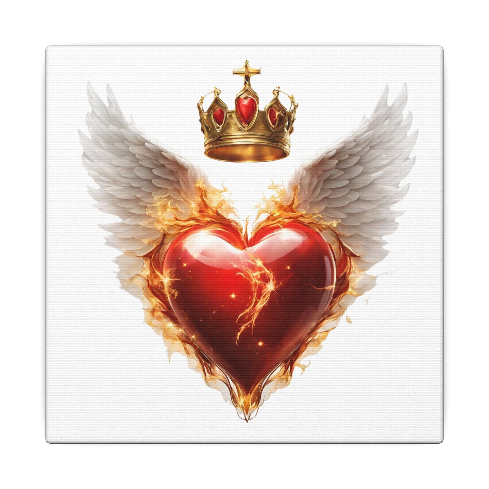 This stretched matte canvas brings a bold, devotional image into your space with painterly texture and museum-quality print. A luminous heart aflame, crowned and winged, sits against a clean white field — dramatic without overwhelming. The 0.75″ depth and stretched construction give it a steady presence on the wall; the matte finish softens glare and highlights brush-like detail. It hangs securely thanks to discreet rubber corner pads, and the archival latex inks on a durable cotton/poly canvas keep colors vivid while staying eco-conscious. Place it where you want a quiet, spirited focal point that sparks reflection and warmth.